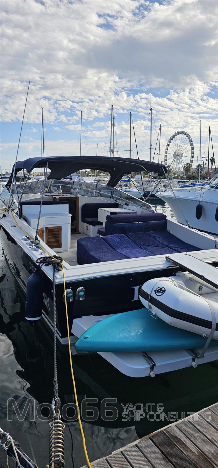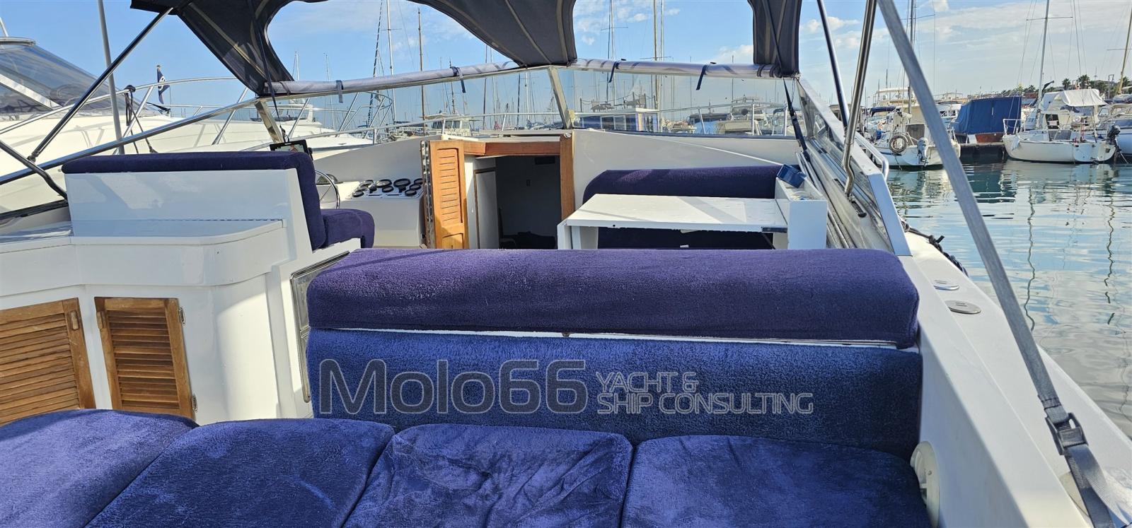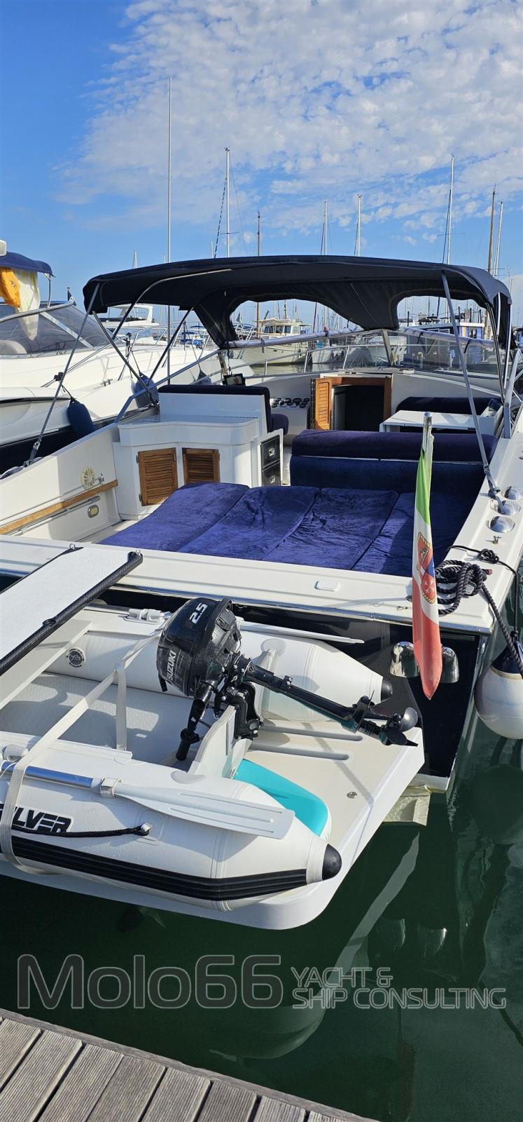 Bussola (riviera), Comando motori elettronico, Computer di bordo, Display, Plotter con antenna GPS (Raymarine), Radio VHF (Shipmate RS8400).