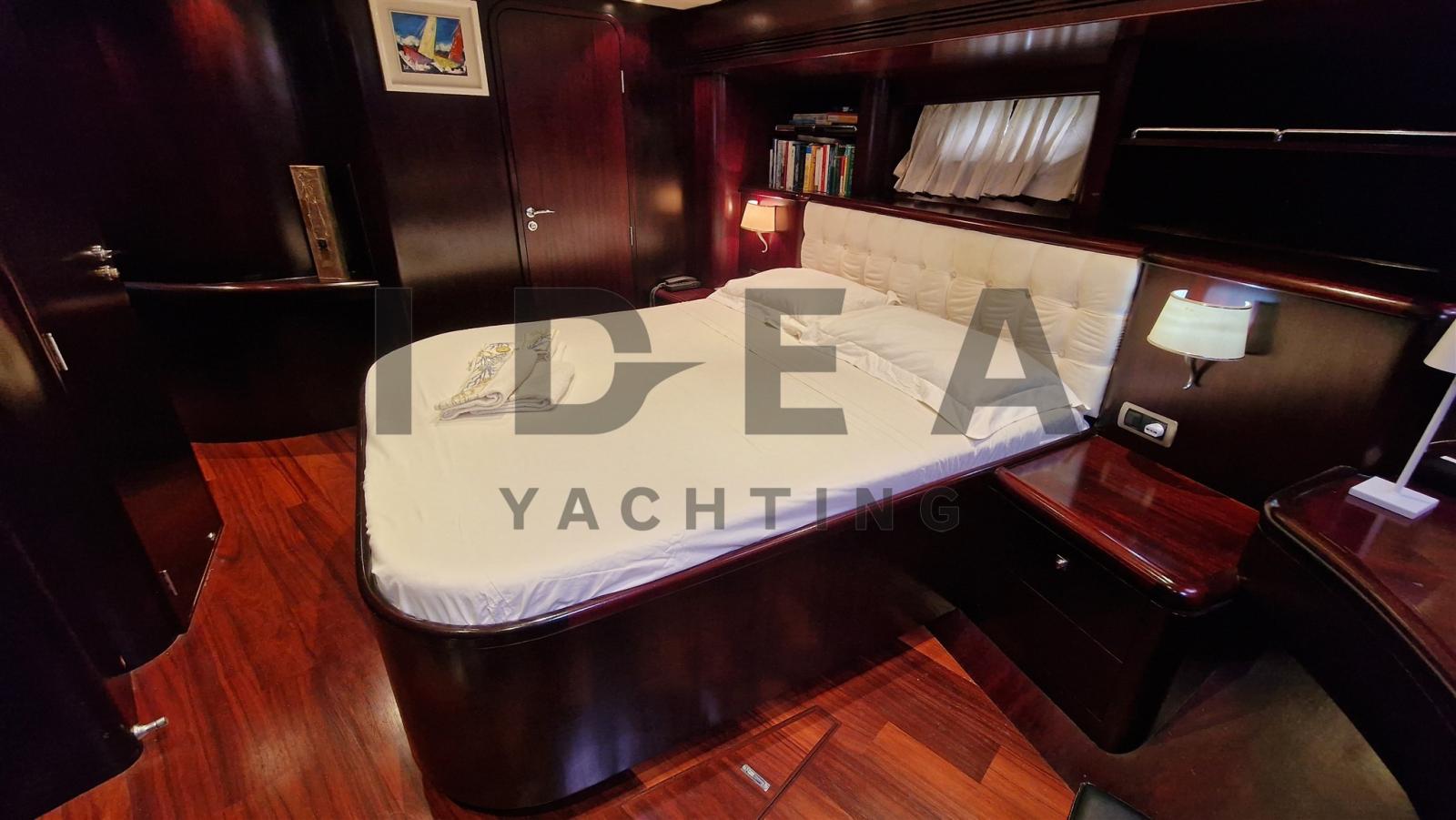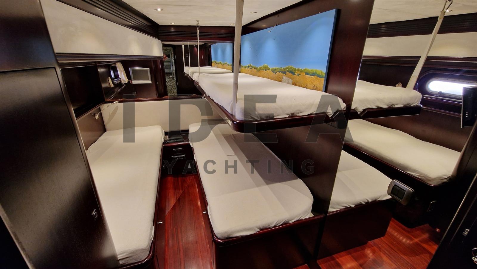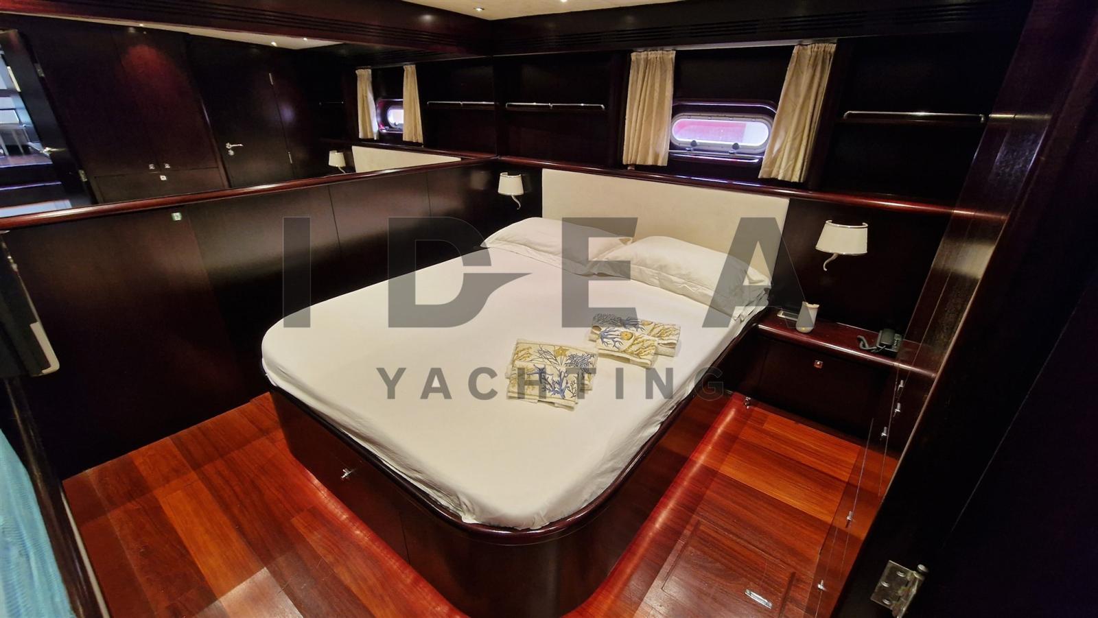 Accommodating up to seven guests, the yacht boasts two double staterooms and one twin-bedded stateroom, each with en-suite bathrooms. The master stateroom at the bow features a full beam layout, central heating, air conditioning, a double bed, and a spacious en-suite bathroom. The VIP stateroom in the aft port side includes a French double bed and private bath, while the starboard stateroom offers twin beds, a pullman bed, and its own bathroom for versatility. Additionally, a crew cabin at the stern includes a single bed, en-suite