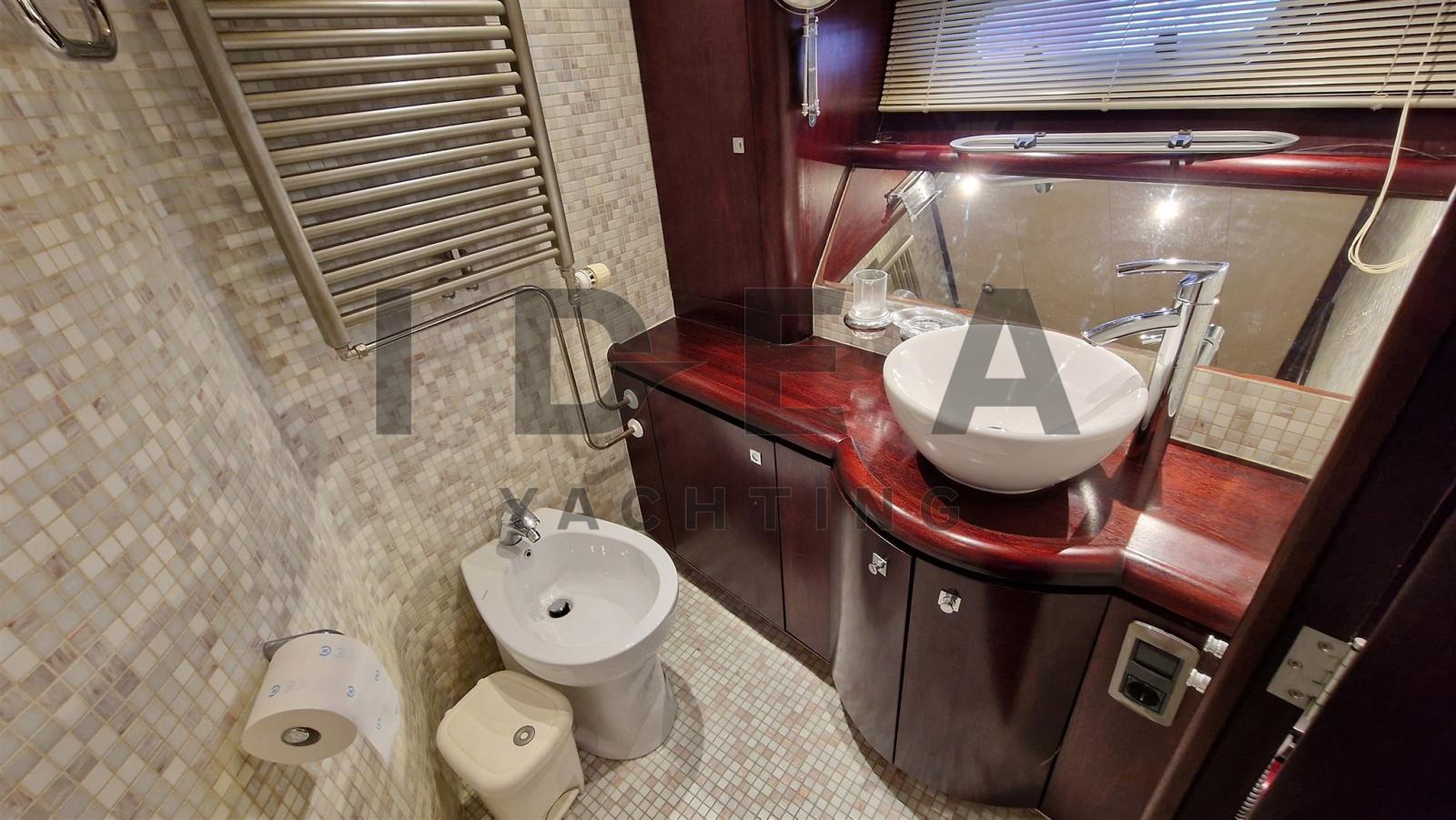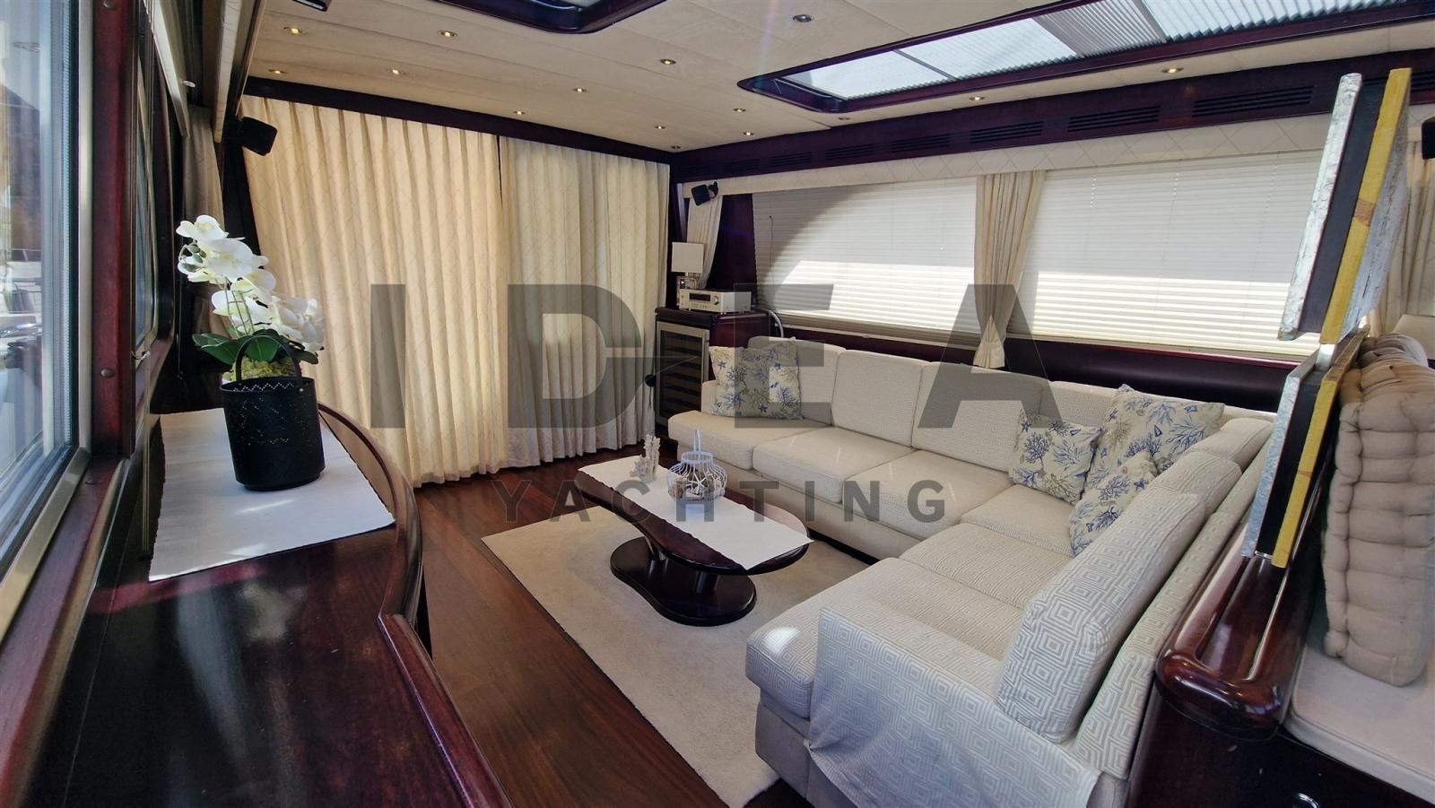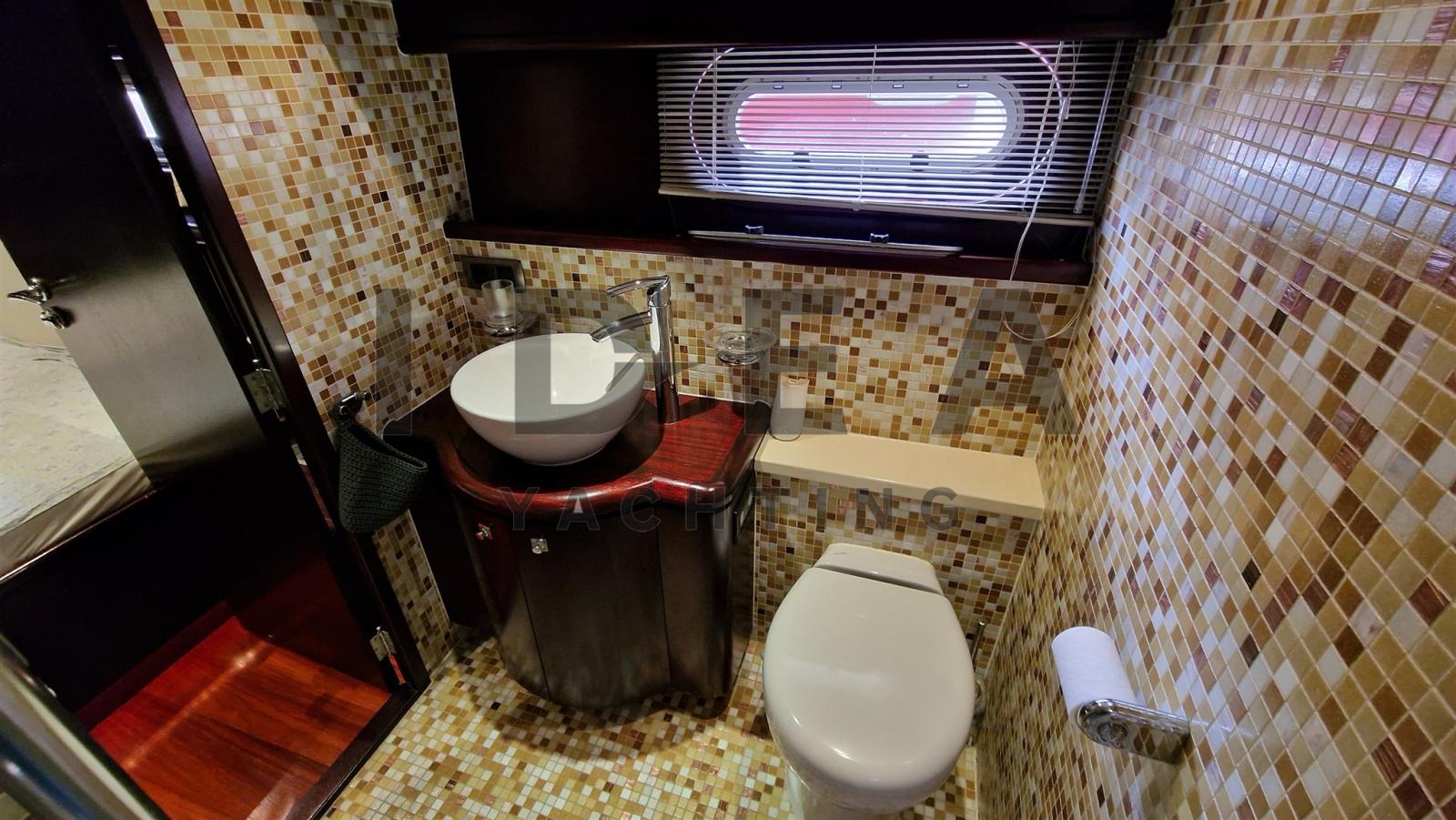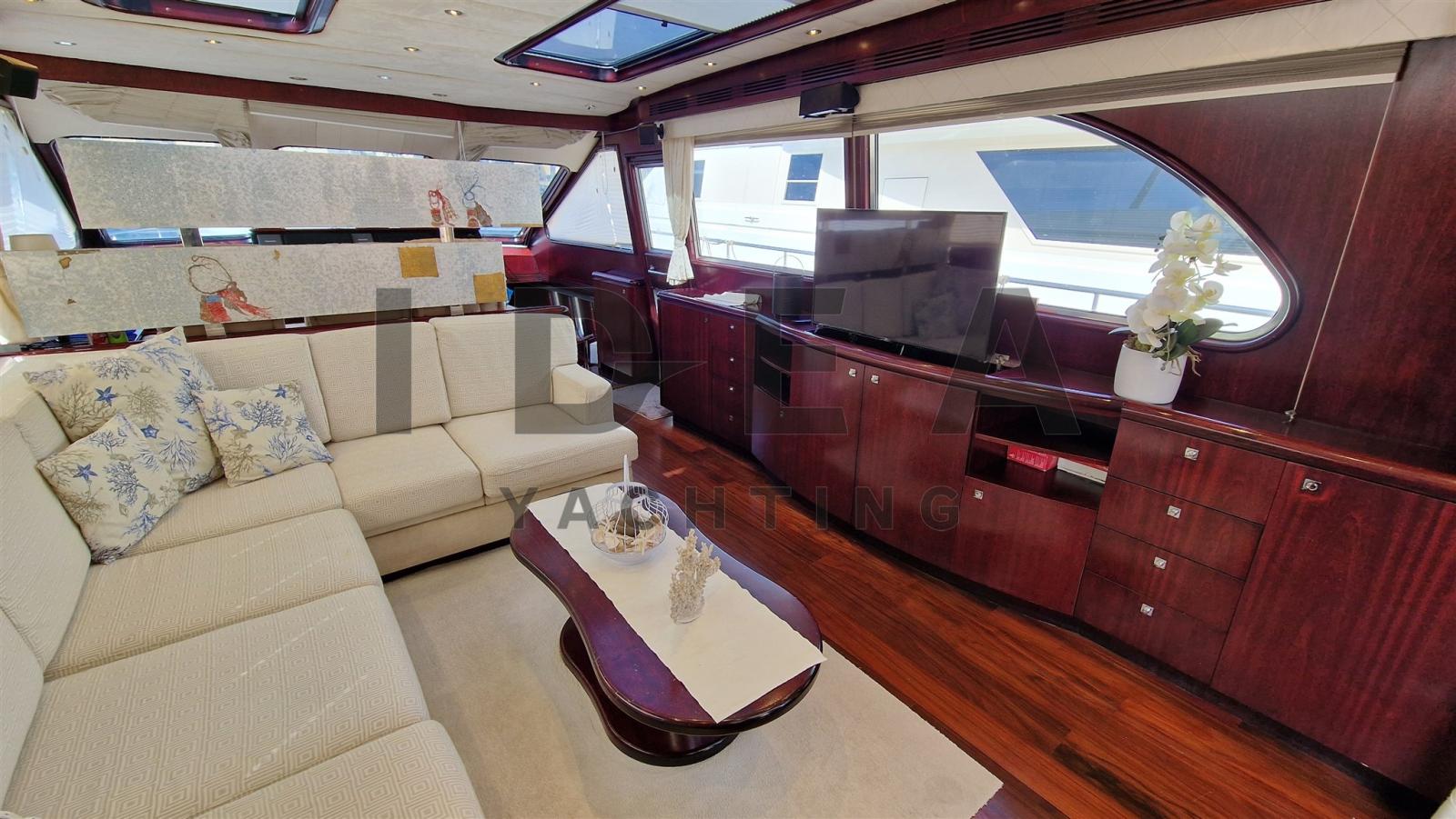 Accommodating up to seven guests, the yacht boasts two double staterooms and one twin-bedded stateroom, each with en-suite bathrooms. The master stateroom at the bow features a full beam layout, central heating, air conditioning, a double bed, and a spacious en-suite bathroom. The VIP stateroom in the aft port side includes a French double bed and private bath, while the starboard stateroom offers twin beds, a pullman bed, and its own bathroom for versatility. Additionally, a crew cabin at the stern includes a single bed, en-suite