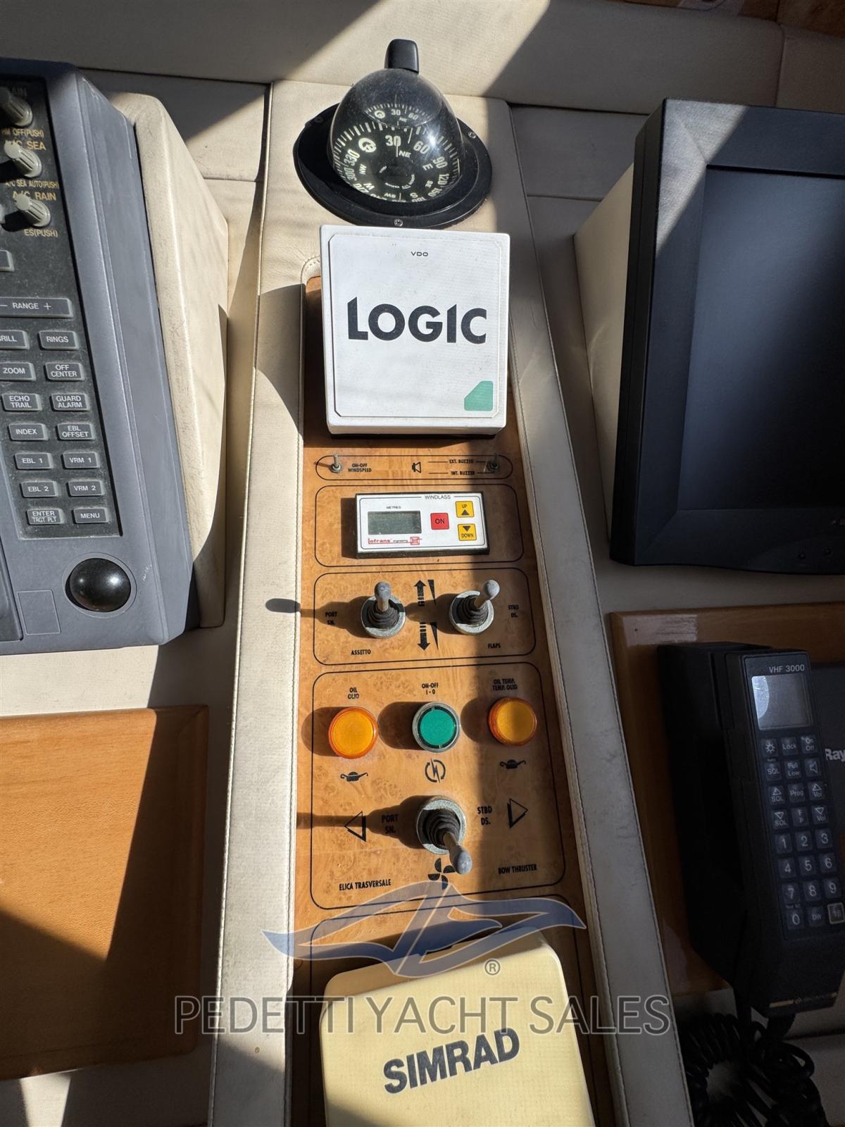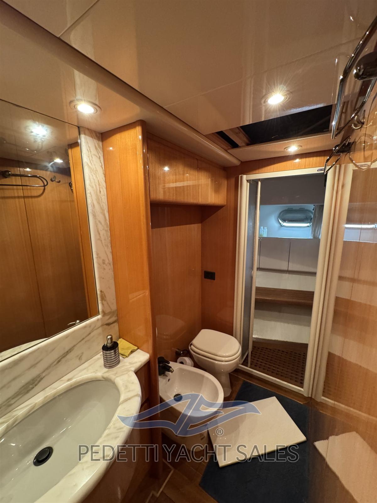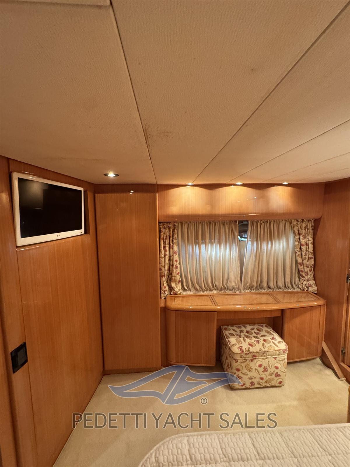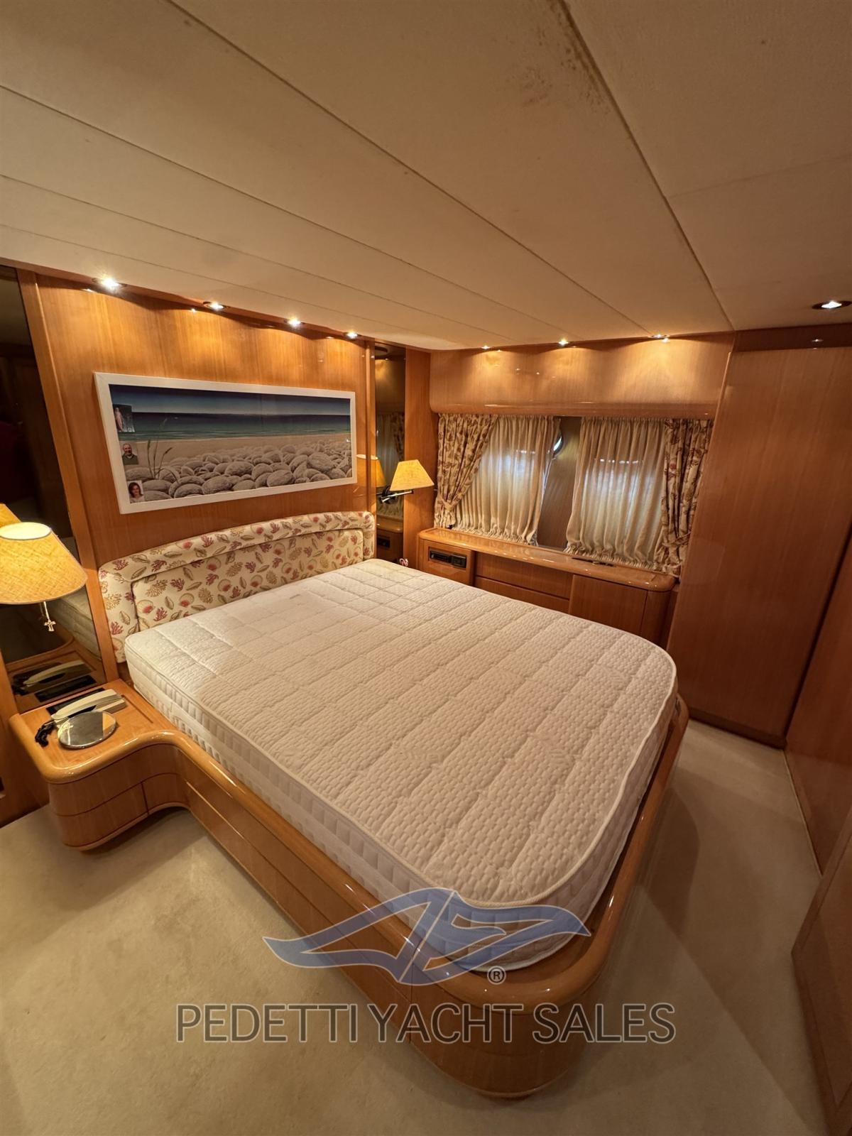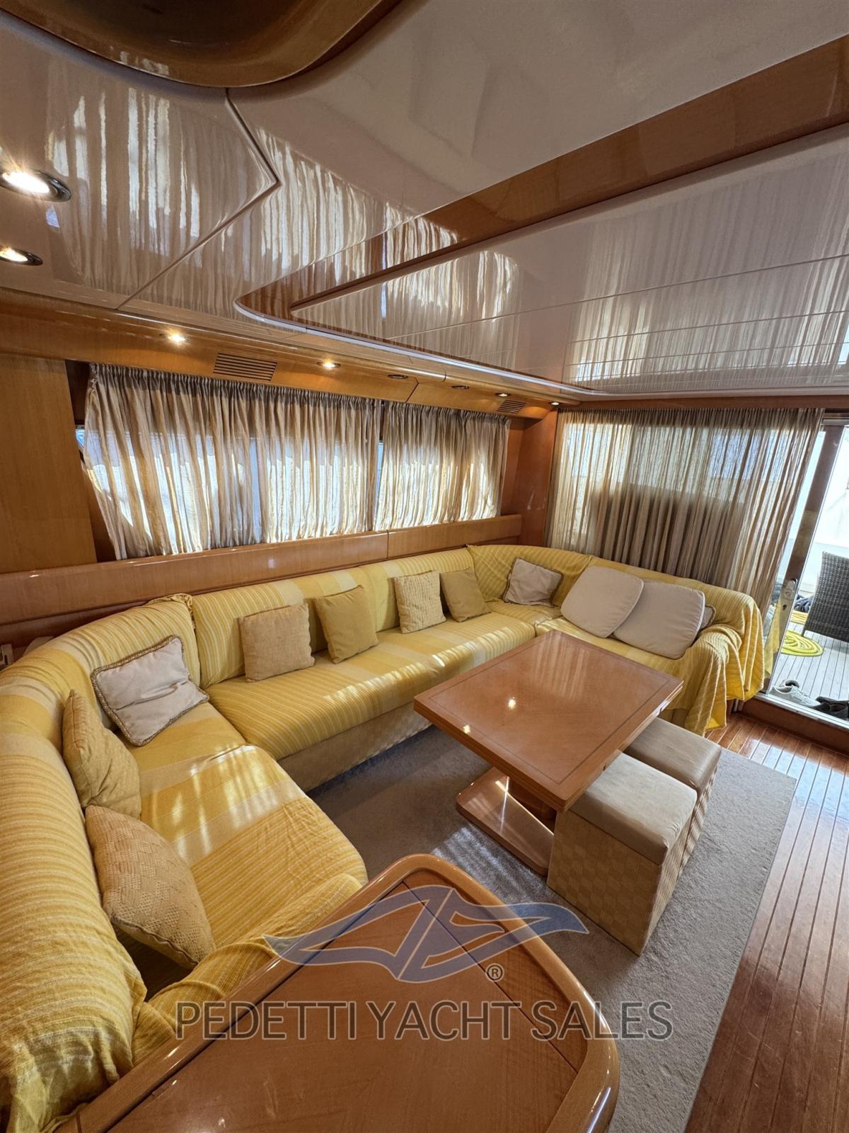 Gli interni eleganti offrono ampie e luminose zone living, con una dinette spaziosa e una seconda dinette con carteggio in timoneria. La disposizione prevede tre cabine confortevoli con finiture in legno di pregio e dettagli curati, oltre a una cabina equipaggio separata.