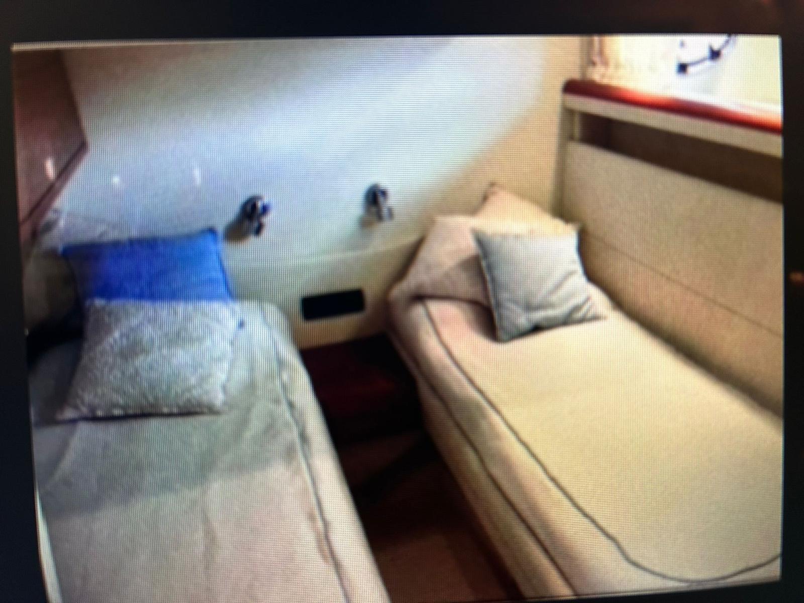 Interni in ciliegio semilucido, pavimenti in parquet Dussiè, pareti e soffitti in Alcantara. Divano in pelle Plumè color avorio nel salone. Cabina matrimoniale a prua con bagno ad uso esclusivo con doccia e bidet. N° 2 Cabine ospiti con due letti in piano. Bagno ospiti con accesso dalla dinette dotato di wc, doccia e bidet. Cruscotto colore blu con pannelli in carbonio