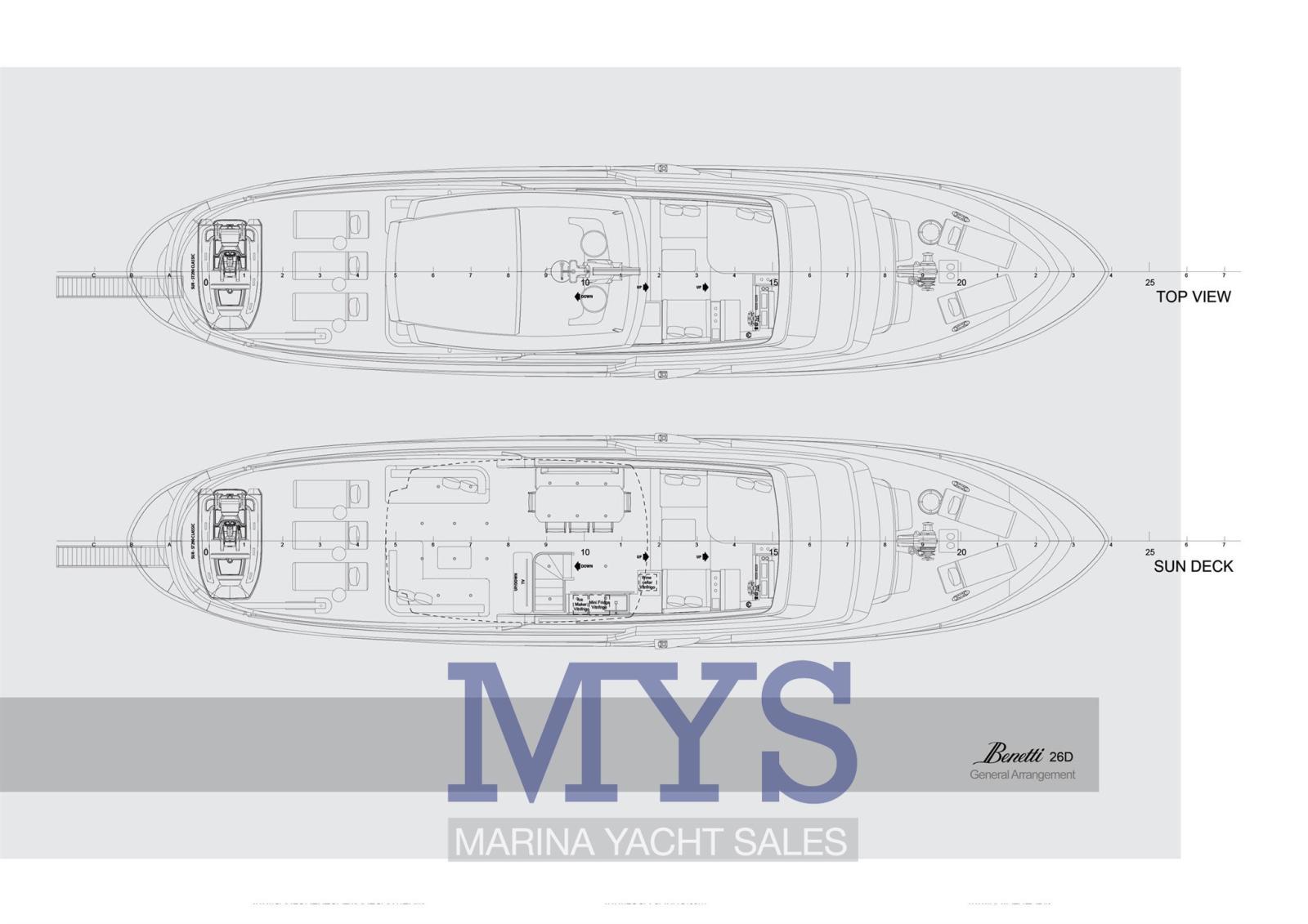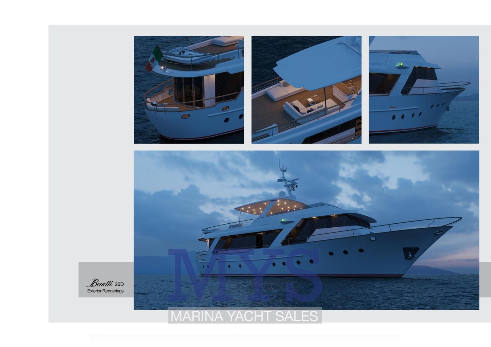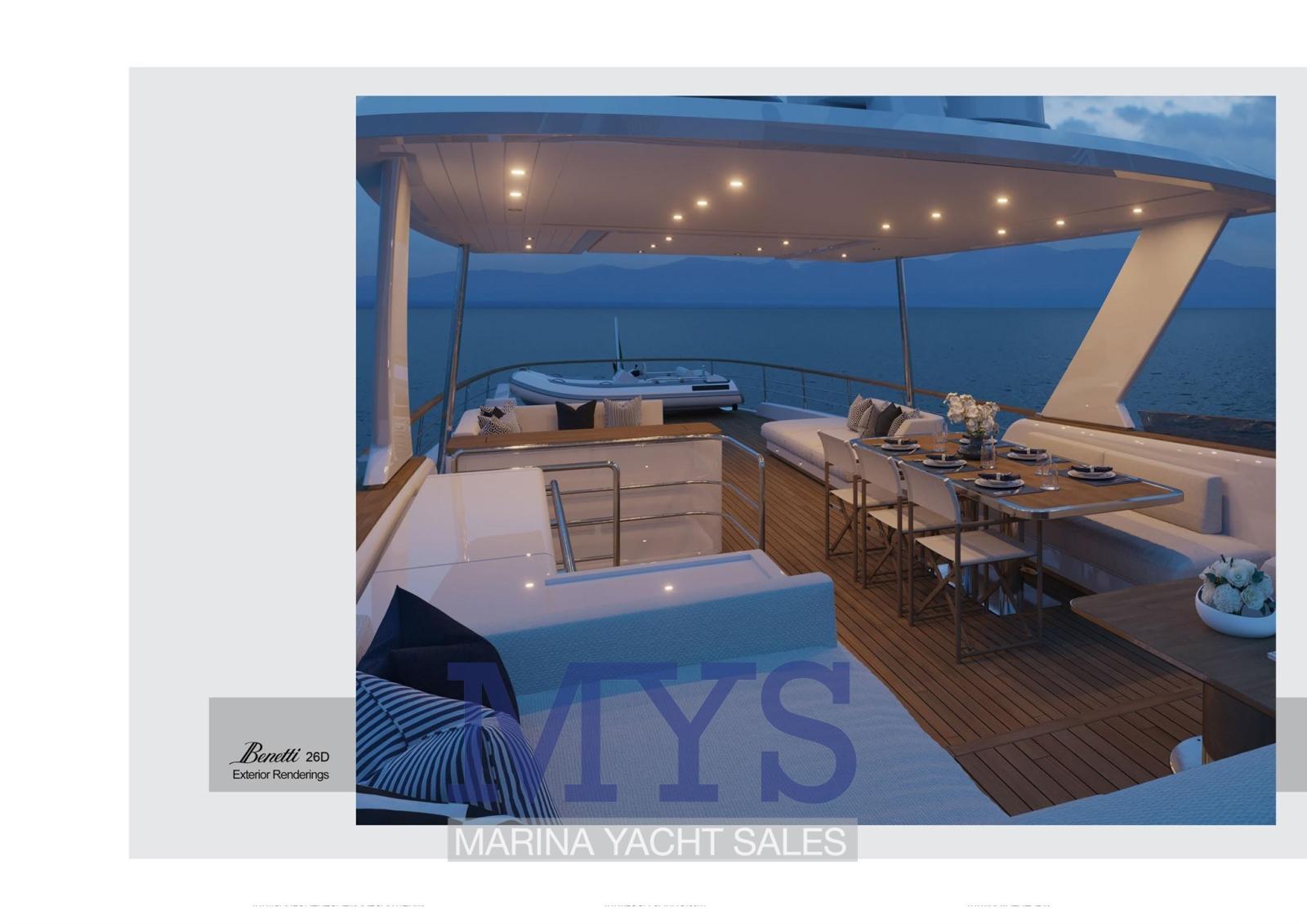 Allarme fumo/gas, Allarme motore, Allarme sentina, 2 Ancora, Autoclave, Bocche di Lupa, Camminamenti laterali in teak, Doccia esterna, Faro orientabile, Gruette per tender (Su Fly Bridge), Gruette per tender su fly, Hard top (Fly Bridge), Lavaggio catena, Luci di cortesia, Luci subacquee, Passerella (A scomparsa), Pompa di sentina automatica, Pompa di sentina manuale, Porta ingresso, Porta laterale, Pozzetto Teak, Presa 220V banchina, Presa acqua banchina, Salpa Ancore Elettrico, Scala reale, Scaletta da bagno, Sistema Depurazione acque nere, Stabilizzatori, Tavolo pozzetto, Tender, Tromba, T-Top, Winch tonneggio di poppa, Winch tonneggio di prua.