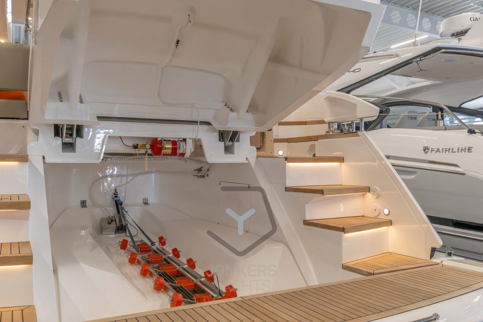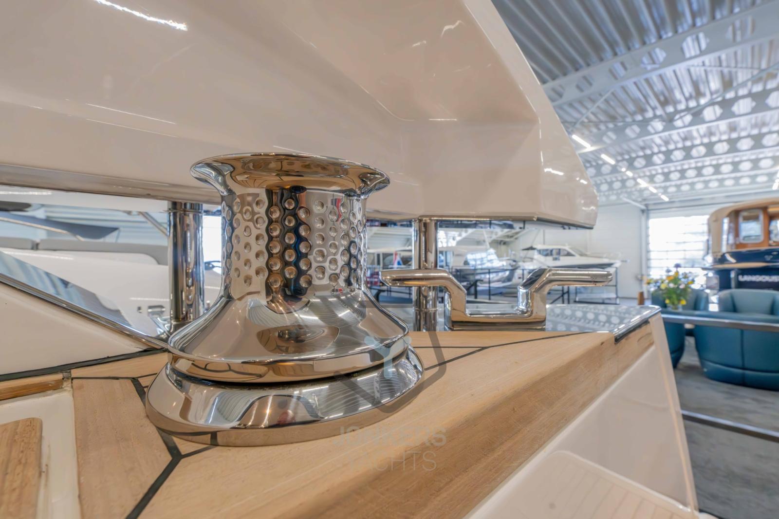 Allarme sentina, Auto-Trim, Doccia esterna, Hard top, Impianto antincendio, Luci subacquee, Pompa di sentina automatica, Pompa di sentina manuale, Pozzetto Teak, Salpa Ancore Elettrico, Scala reale, Scaletta da bagno, Tavolo pozzetto, Tromba.