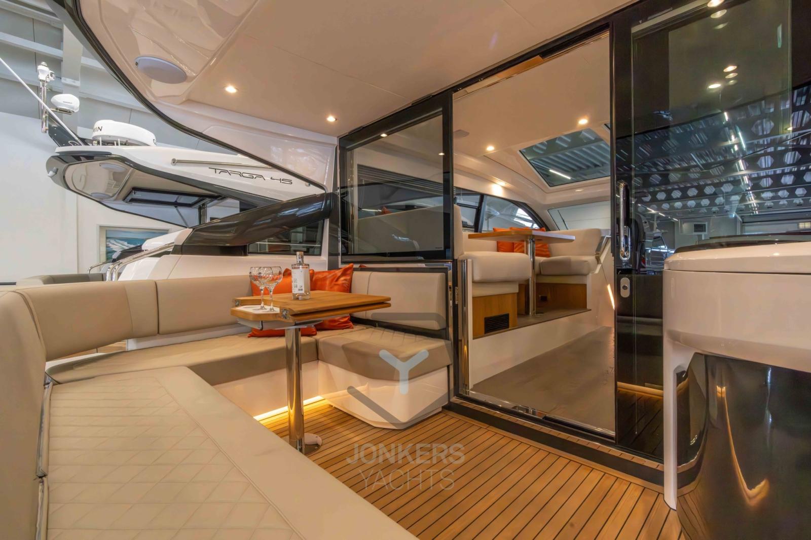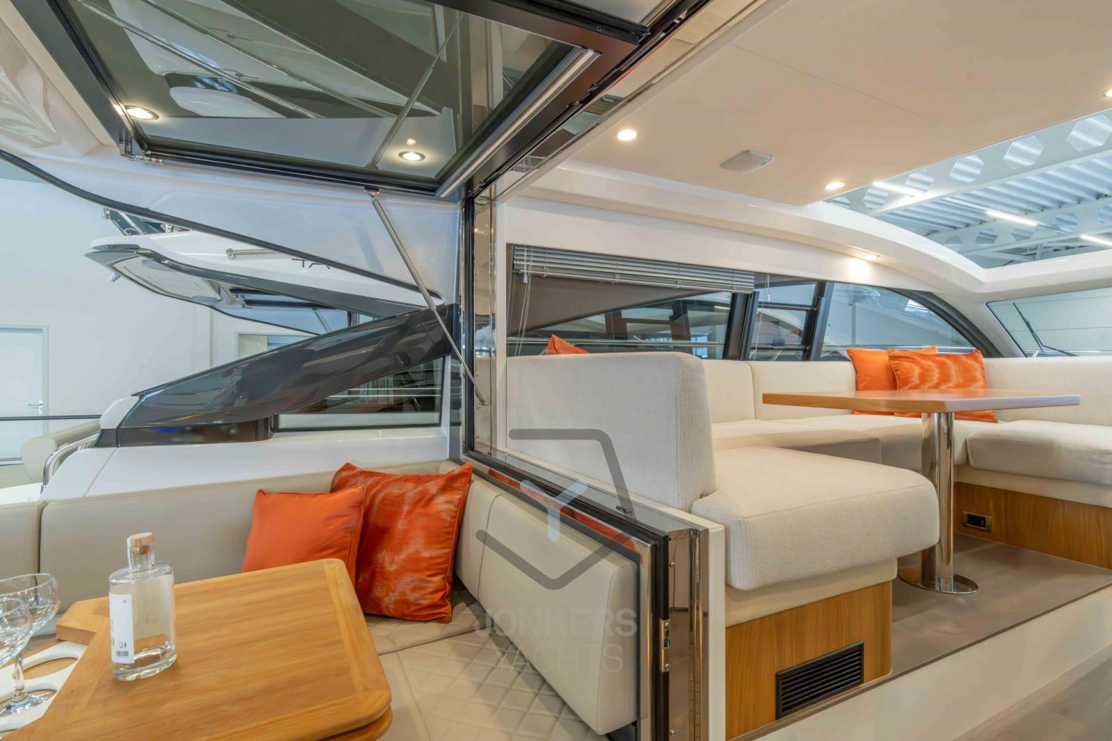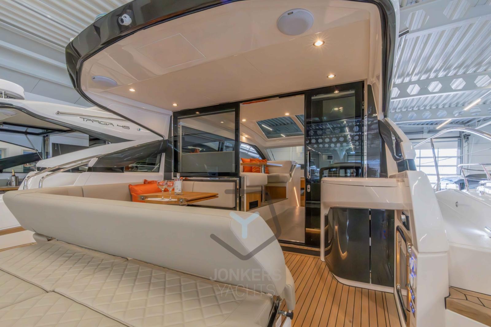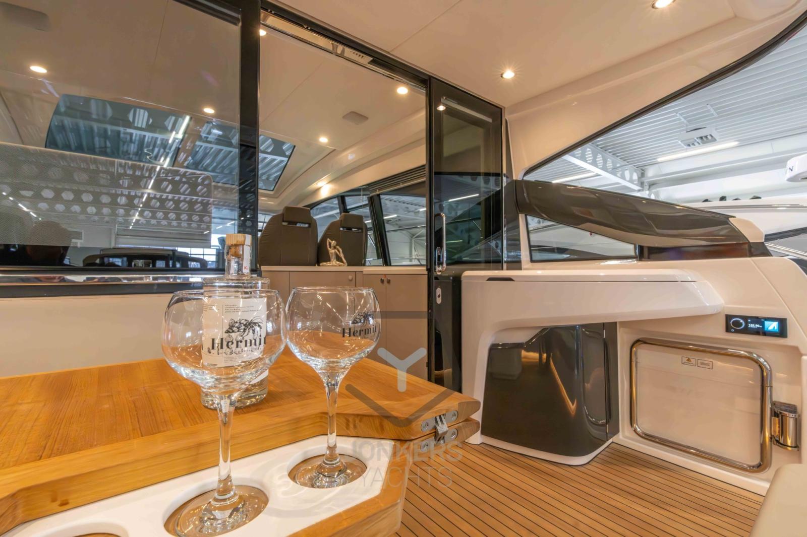 Il relax è ovunque; Sdraiati sugli ampi lettini sia sul ponte di poppa che sul ponte di prua o rilassati nel pozzetto. Riparati dal caldo pomeridiano sotto l'elegante tettuccio rigido o fai scorrere indietro il tetto in tela azionato elettricamente con la semplice pressione di un pulsante.