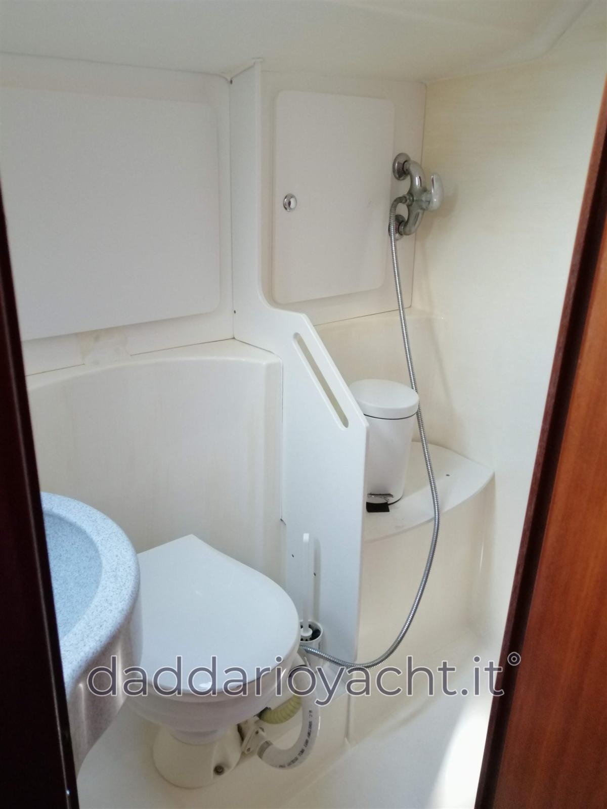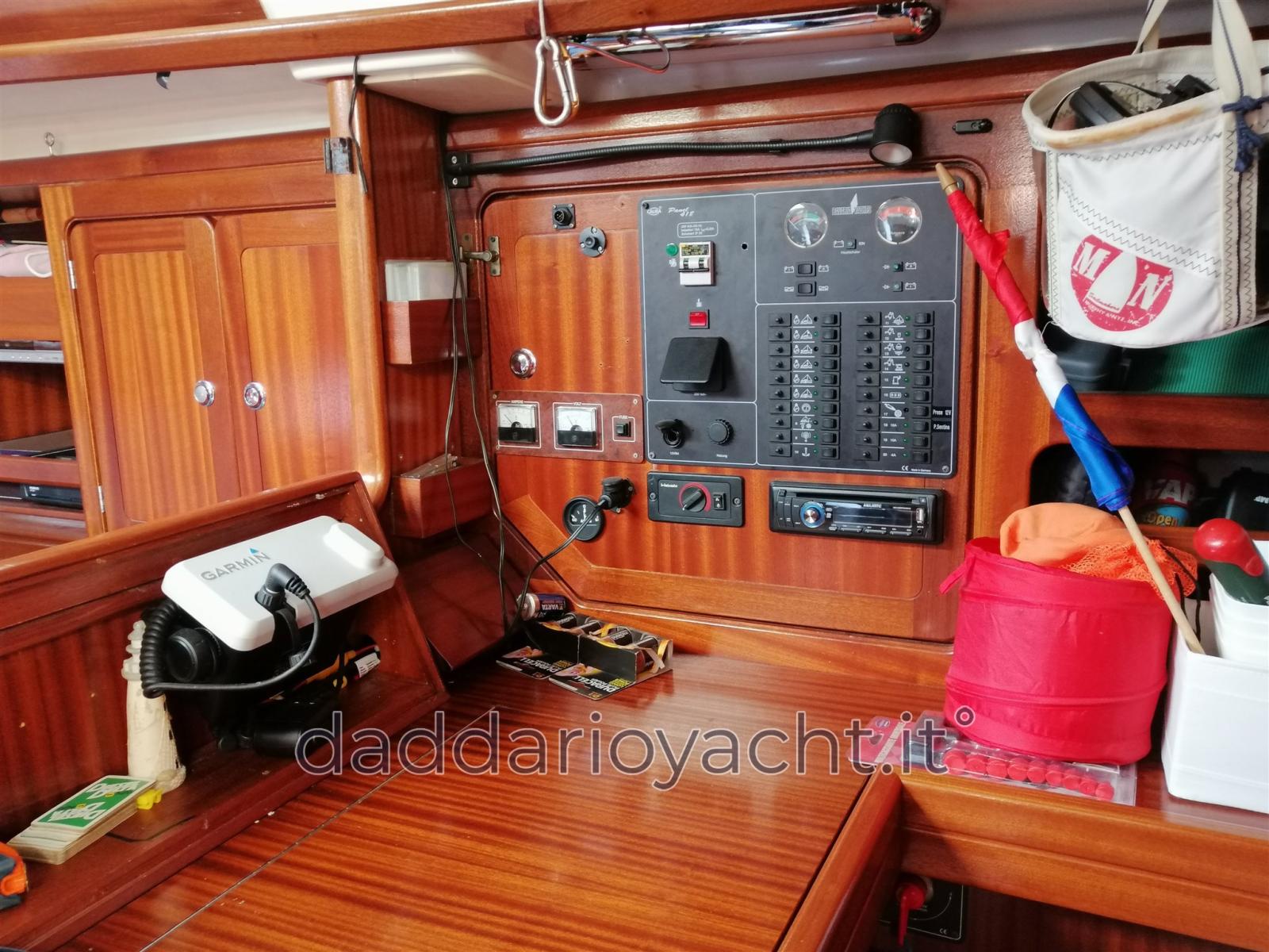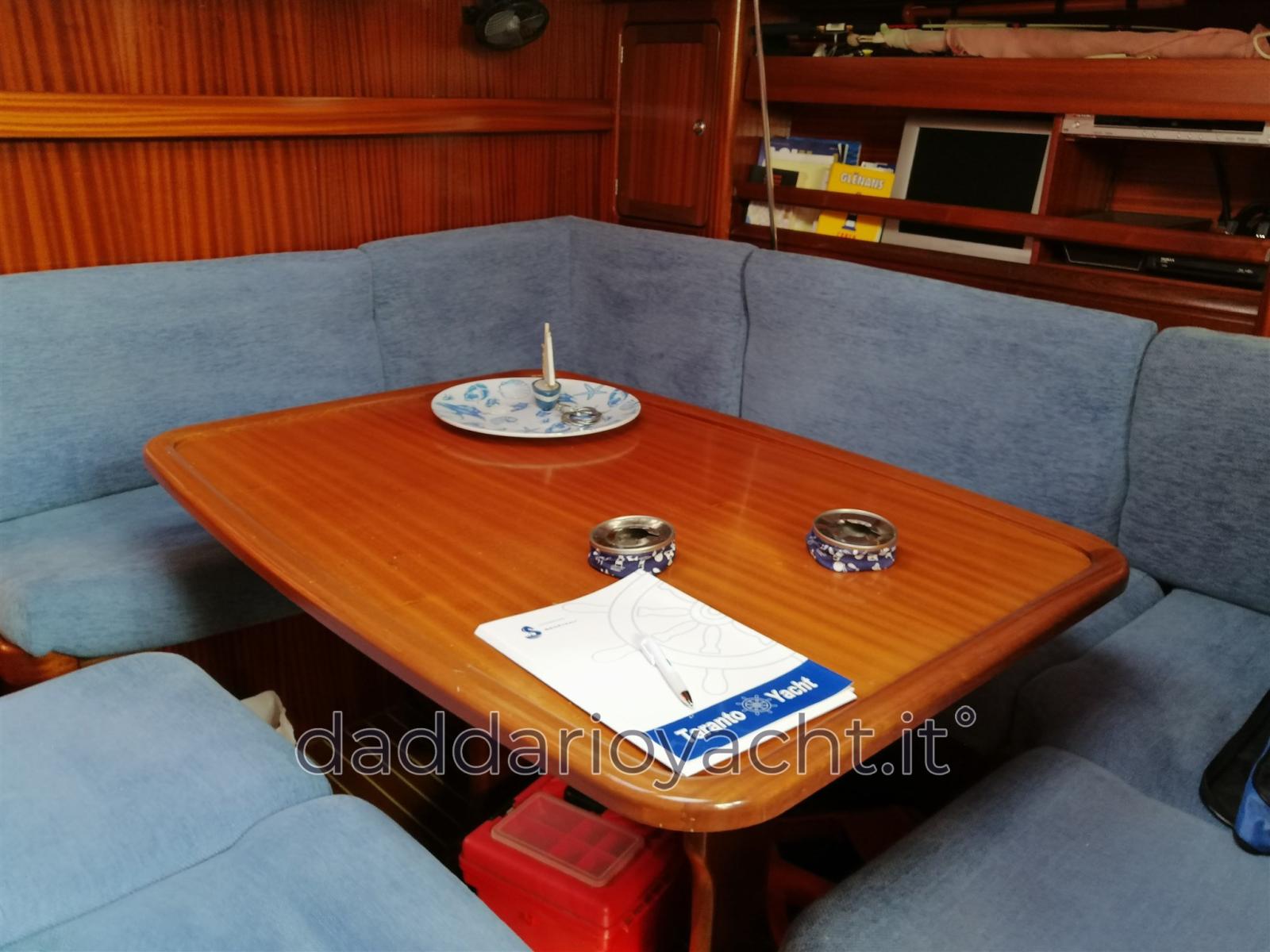 Ha 3 cabine di cui la cabina di prua ha 4 letti (2 cuccette a castello). Ha 3 bagni elettrici. Una ampia dinette e cucina in linea sul lato di sx. Cala vele esterna. Cuscineria prendisole esterna. Profili Lewmar oblò inox.tendine interne bianche. tessuti dinette recenti in velluto blu.