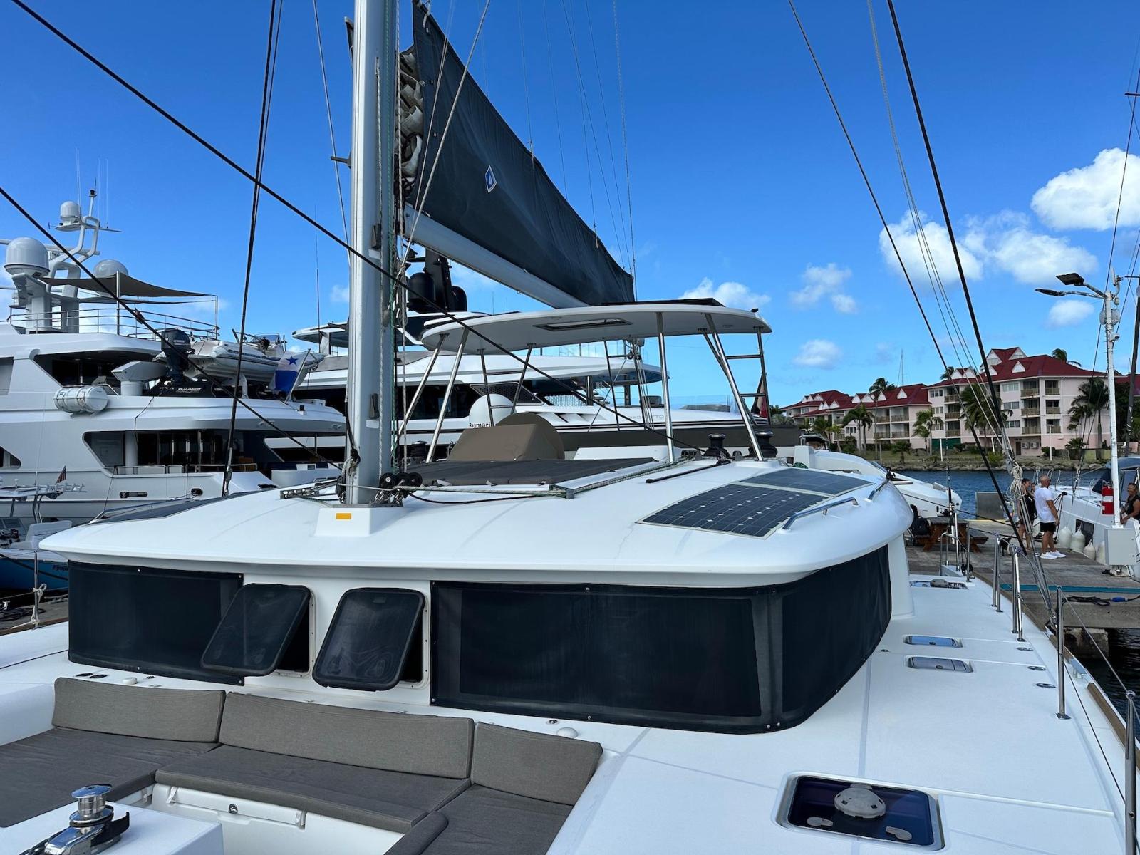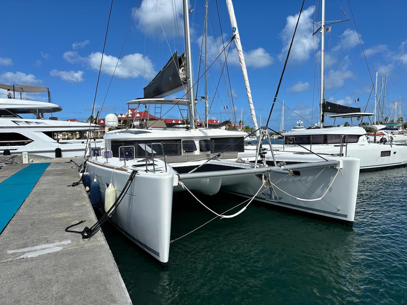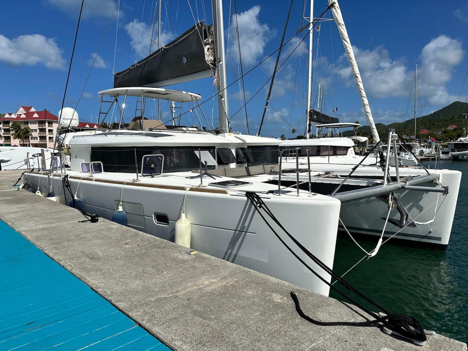 SpecificationInterior Equipment:• 4 x A/C Units (Cruisair 48,000 BTU) – Factory Installed• 6 x 2-speed fans• Watermaker AQUA-BASE• 6-filter + remineralizer drinking water filtration system (2023)• Washing Machine (BEKO, 5kg)• 2 x TVs with Raymarine Antenna• Fusion MS-RA 70 Sound System with 6 built-in speakers• Safe (Installed 2023)• New Carpet (2023)• New Mattress in Owner’s Cabin (2023) Galley:• Propane Oven & Stove (ENO) + 6 propane bottles• Refrigerator & Freezer (Frigonautica)• Microwave (Samsung)• Dishwasher (Electrolux)• Saltwater tap with foot pump• Blender & Coffee Grinder• Full set of dishes and glasses Bathrooms:• 3 x Electric toilets (saltwater flush with macerators)• 3 x Holding tanks• Shower in each bathroom• Teak floors Engines & Propulsion:• 2 x Yanmar 54HP (2,600 hrs)• 3-bladed folding props (Flex-O-Fold, 2021) Electrical & Power:• Cummins Onan Generator (11 KVA, 2,200 hrs)• 4 x Lithium Batteries (2023)• Solar Array (3,000 watts total, 2023):• 4 x 150W flexible solar panels (cabin top)• 4 x solar panels on stainless steel arch (2023)• Victron 5000W Inverter/Charger (2024) – Can power all A/C units Exterior Equipment:• Complete cushion set (cockpit, flybridge, forward sunbathing area)• Teak cockpit• Hardtop Bimini (2023)• Cockpit refrigerator (Waeco)• Passerelle• 48Kg ULTRA stainless steel anchor• 300-foot galvanized steel anchor chain (2023)• Windlass (QUICK) with chain counter + spare Delta anchor, chain & rode• Black trampoline replacement (2023)• Davits Sails & Rigging:• Square Top Mainsail• Roller Furling Genoa• Code 0 on roller furling (2016)• Asymmetrical Spinnaker w/ sock (1.5 oz, 2019)• Storm Jib (2019)• Headstay replaced (2021)• Dyneema Reefing Lines (12mm)• Jib Drum (2023)• 1 x Electric Harken Winch Electronics & Navigation (Raymarine):• Plotter, Depth Sounder, Wind Speed/Direction, Radar, AIS• Autopilot• VHF Radio at Helm & Nav StationExtras & Safety:• 10ft VIPER Dinghy with 15HP Mercury Outboard (electric start, 2019)• Full safety equipment, including liferaft