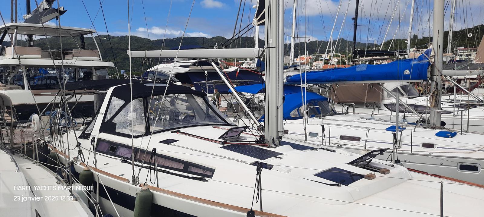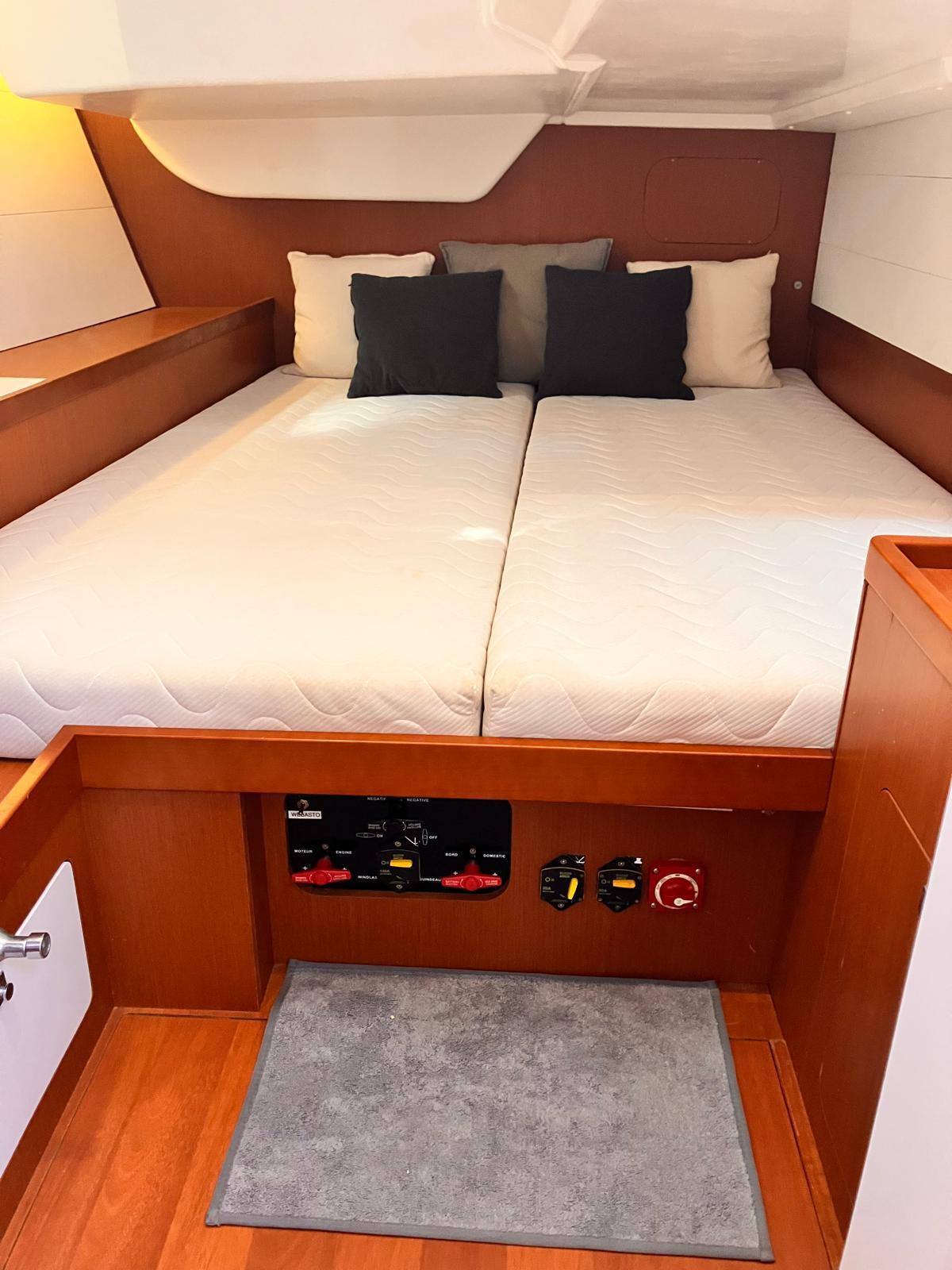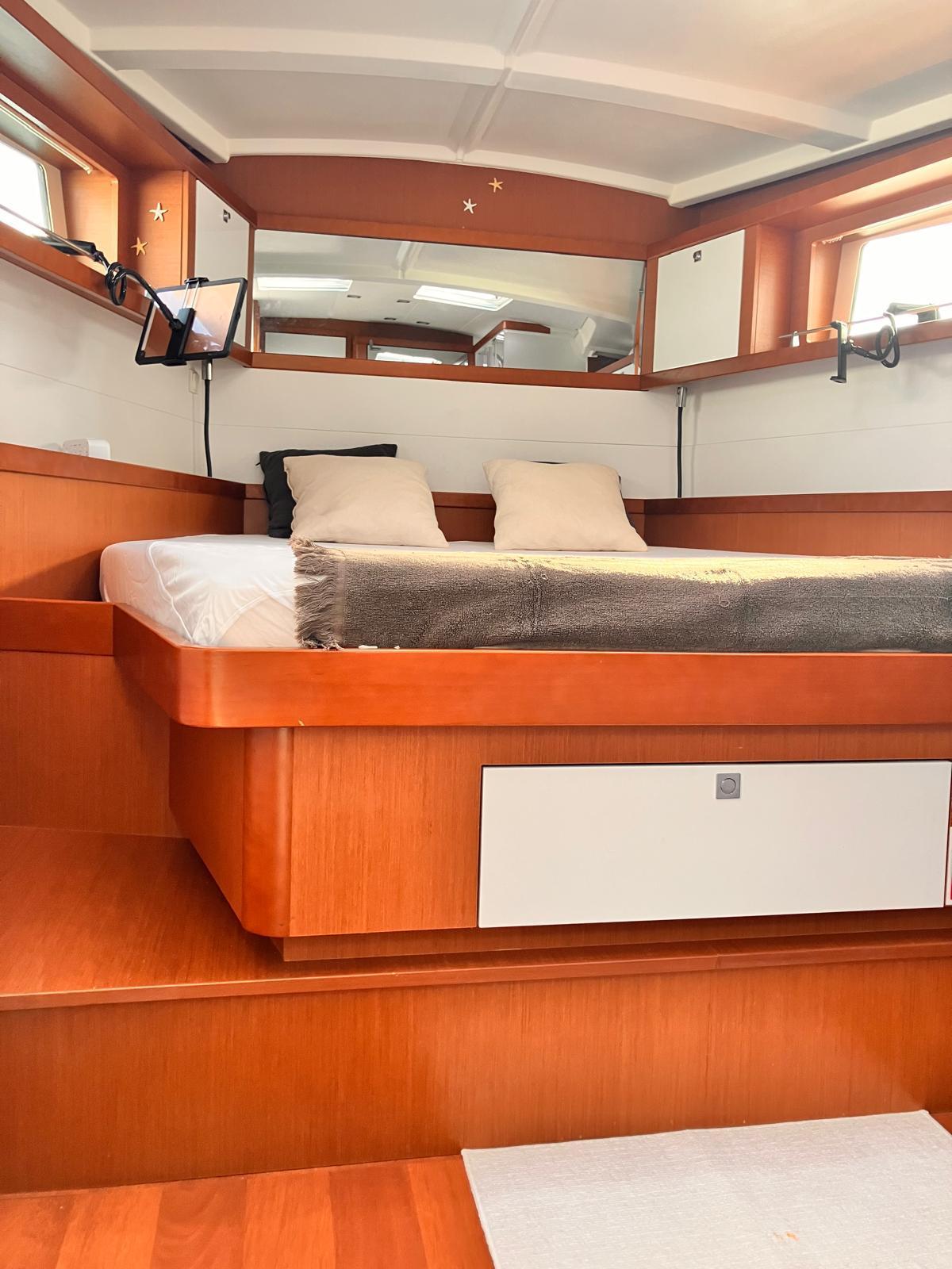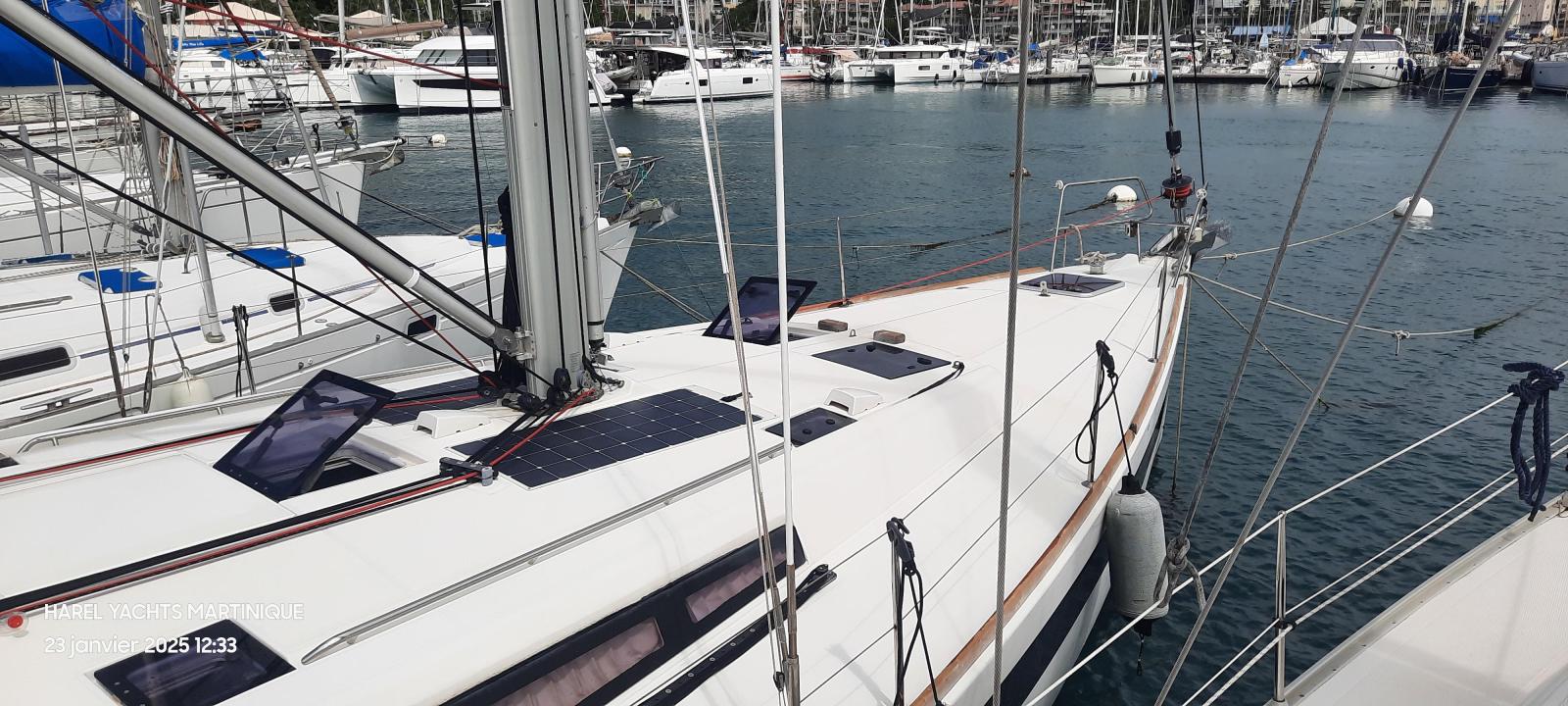 Details1. Sail locker, access through deck hatch 2. Easy access to the anchor well - Self-bailing chain well - Clench bolt - Hatch cover 3. Mainsail arch 4. Handrails on the mainsail arch 5. B&G Zeus 12” (optional) multifunction touch screen built into the cockpit table 6. Cockpit wooden table incorporating handrails and able to accommodate an ice box (optionally refrigerated) 7. Silver Coachroof sprayhood 8. Dock & Go joystick and compass 9. Rope locker 10. Helm station, B&G electronics 11. Companionway with very gentle slope of 45° 12. Removable LED light LAYOUT 3 x double cabins 2 x bathrooms 1 X Additional double berth ENGINE & PROPULSION Yanmar -75HP Turbo-ONLY 750 Hours Bow thruster Foldable Propeller – Max prop ELECTRICITY Electrical Circuit : 12v/220V Solar panels – 600W +300W- 2021 Service batteries: 4 x 140 AH 2 x battery chargers Shore power inlet Inverter – 2400W -Pure Sinus -2021 Generator – Pramac 2000w – 2023 INTERIOR EQUIPMENT 2 x Electric toilets - 2021 TV -12v- 2021 Radio/stereo w. speakers outside-2024 Heating system – 2024 Water maker – 60L/H -2024 Microwave Stove w. Oven Fridge Freezer Exterior Equipment Electric Fold - down transom Teak in cockpit Flushing hatches Deckwash Cockpit cushions Davits Bimini Top – 2021 Dodger – 2021 Electric Windlass 1st Anchor -32KG +80m/12mm chain 2nd Anchor 25KG +40m/12mm chain ELECTRONICS B&G – Depth, Speed, Wind – 2021 ZEUS II -chartplotter Autopilot – B&G VHF -B&G Radar -Halo 204 -2024 SAILS & RIGGING Furling Mainsail – Incidence Code O Furling Genoa – Incidence 2x Steering Wheels – Carbon – 2021 Electric winch Spinnaker Pole -Selden- 2021 OTHERS Yamaha +6HP Yamaha Liferaft – 8 people
