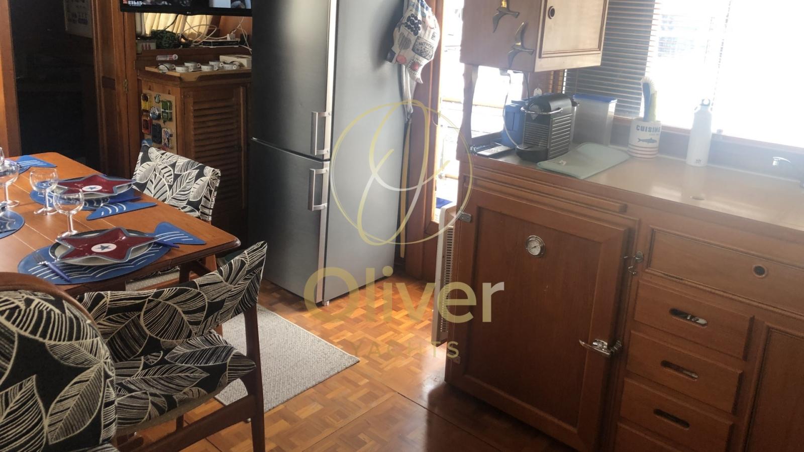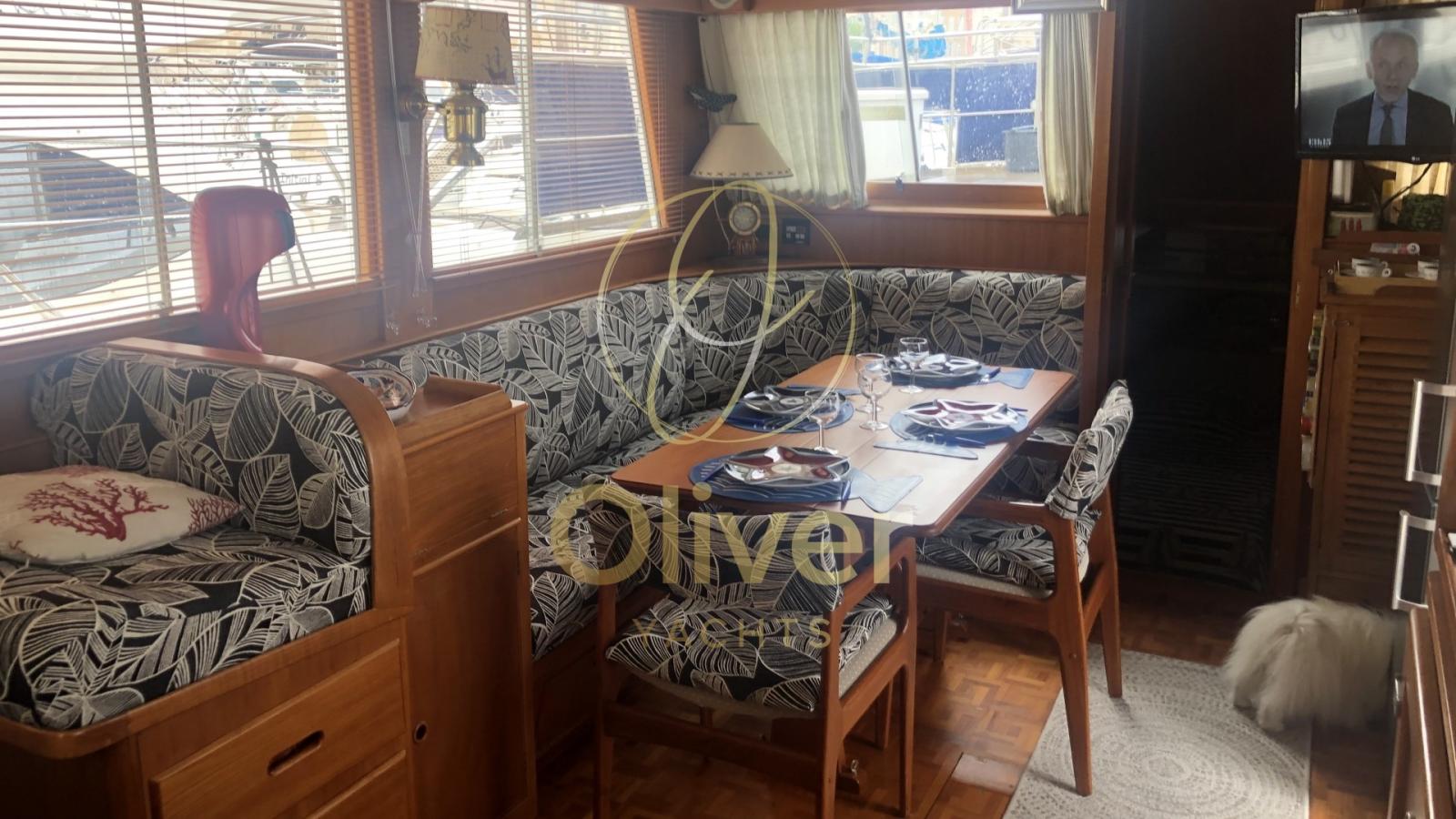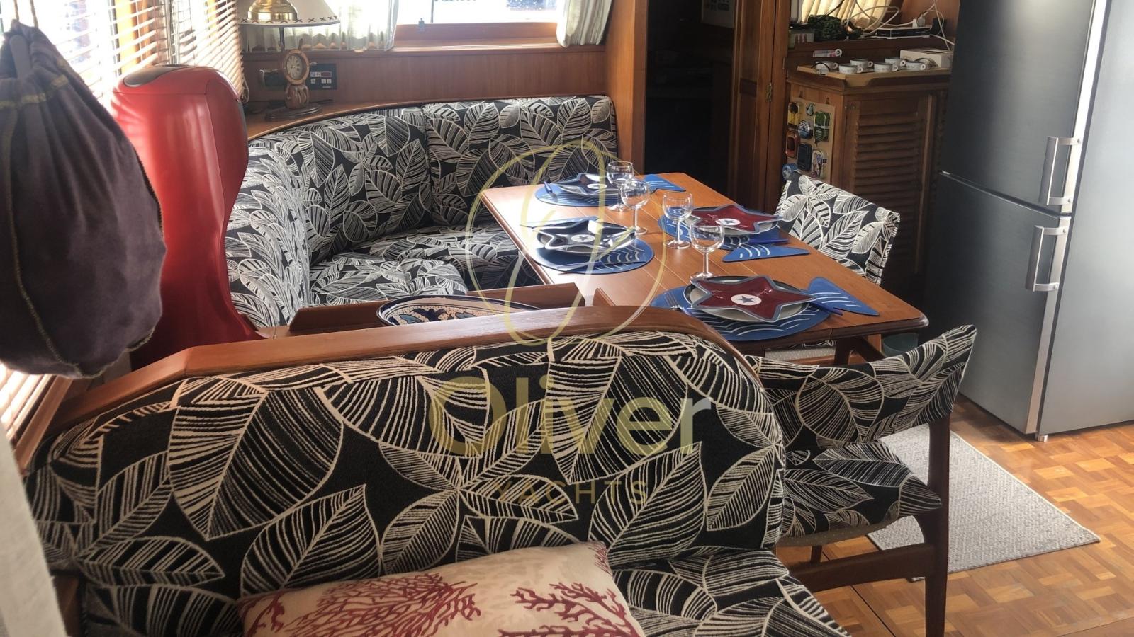 La dinette rialzata, luminosa e ben ventilata, ospita una comoda zona pranzo con tavolo in legno pieghevole e ampie vetrate che offrono una vista panoramica sul mare. Di fronte si trova la cucina, completamente attrezzata con piano cottura, forno, frigorifero e numerosi spazi di stivaggio.