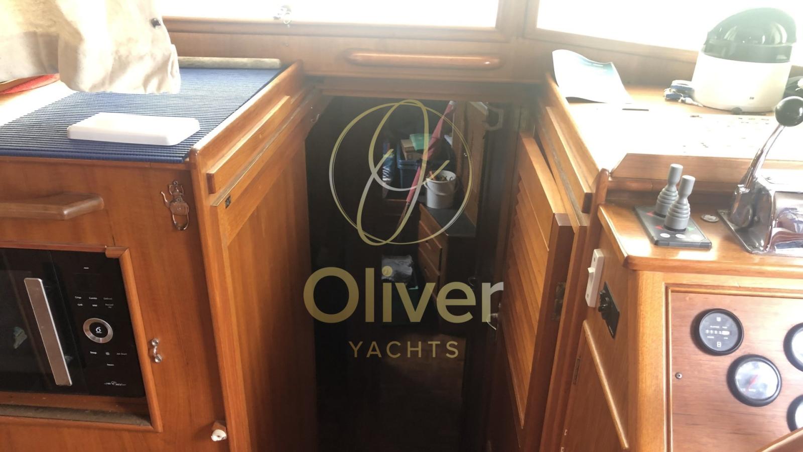 La timoneria interna è funzionale e protetta, ideale per la navigazione in ogni condizione meteo. L’isolamentodei motori consente un comfort acustico notevole anche in crociera. Pavimenti in teak e battute antiscivolo completano l’insieme.
