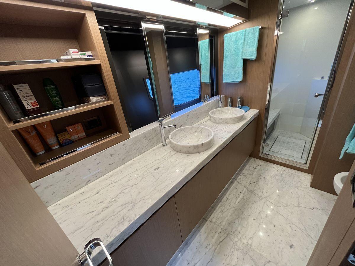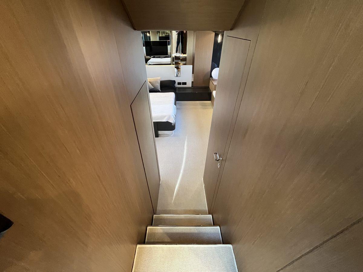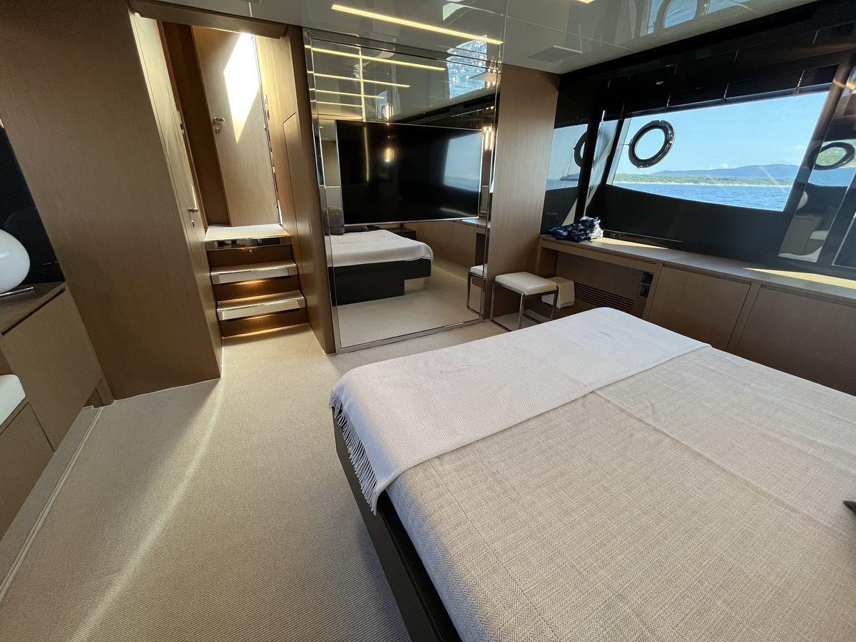 Layout: 1 Cabina master a centro barca con bagno, 1 Cabina vip a prua con bagno, 1 Cabina ospiti con due letti in piano e bagno a dritta