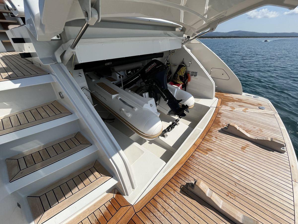 Camminamenti laterali in teak, Doccia esterna, Elica di prua - bow thruster (side power), Pompa di sentina manuale, Pozzetto Teak, Scaletta da bagno, Tavolo pozzetto, Tender (Aer Marine 320 motore 20 hp Suzuki).