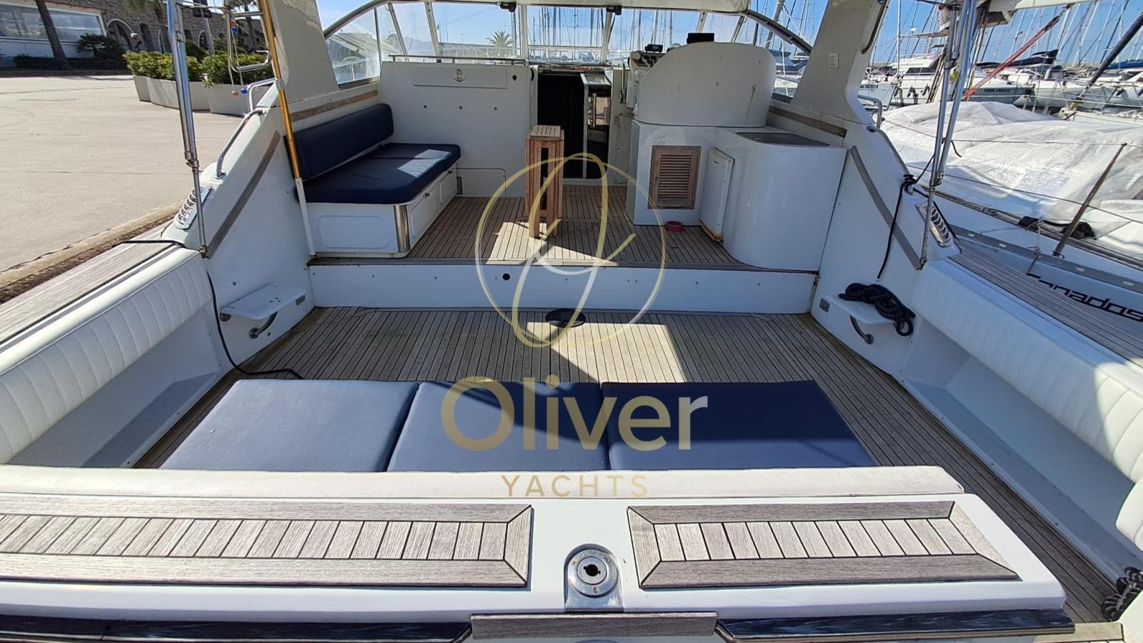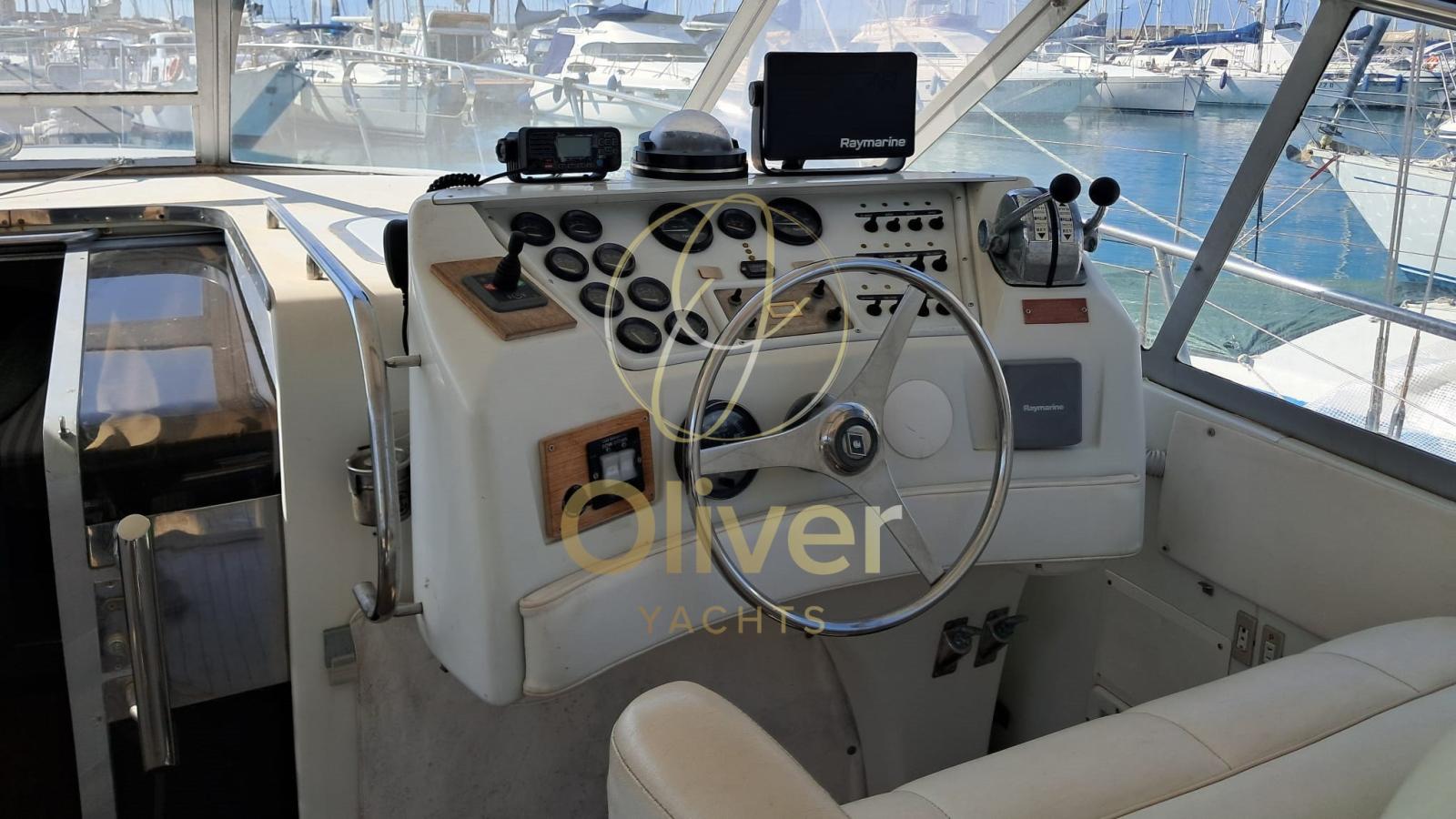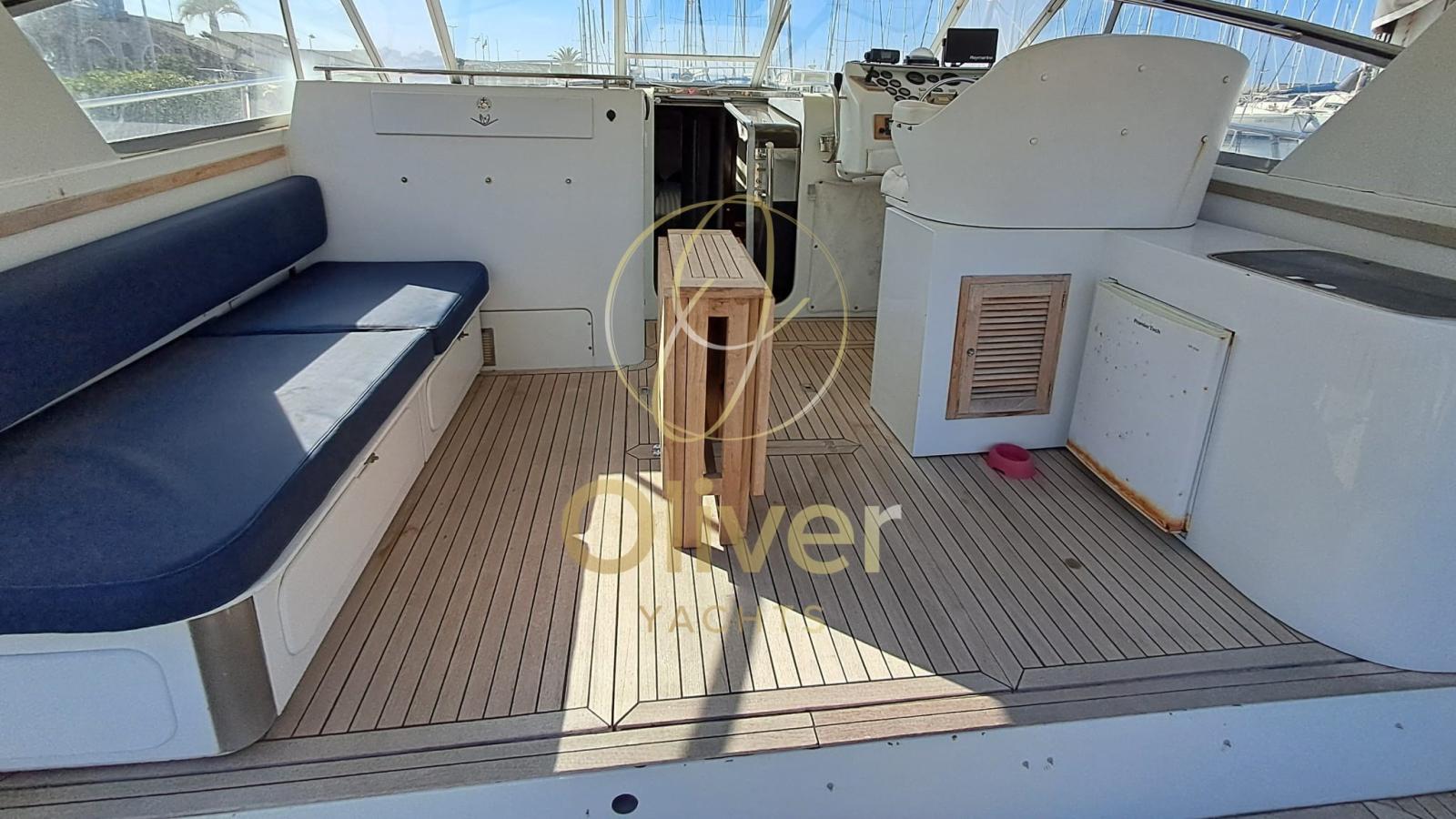 Il pozzetto è ampio, rivestito in teak, e attrezzato con comode sedute imbottite, gavoni portaoggetti, una plancetta di poppa maggiorata con passerella integrata. Il ponte di comando è protetto da parabrezza e tendalino in tela, con sedute doppie e buona visibilità. I comandi sono doppi, con strumentazione Raymarine.