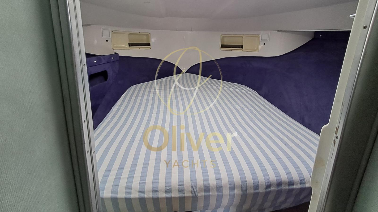 A prua è situata la cabina armatoriale con letto matrimoniale a V, finestrature laterali e armadietti. Le pareti sono rivestite in tessuto e la zona è ben illuminata da luce naturale. Il bagno, posto a centro barca, è dotato di WC marino, lavabo e doccia. L’impianto elettrico è accessibile e ben organizzato nella parte alta della dinette.