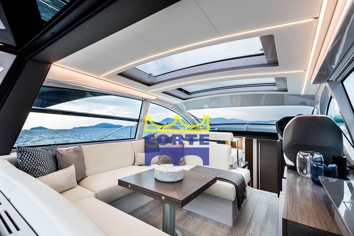 Ampia zona pranzo e living. Sopra la postazione di comando c'è un grande tetto scorrevole in vetro. Sul lato sinistro c'è un altro divano più piccolo e una chaise longue.