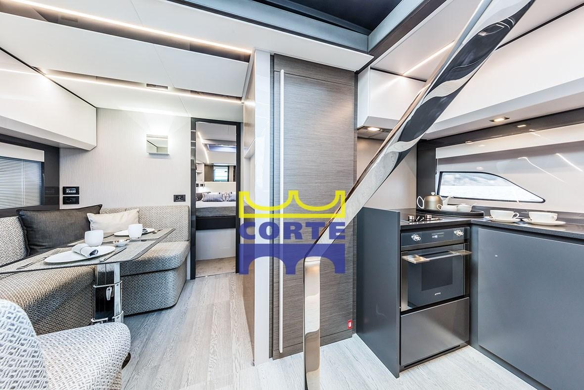 Il pozzetto è dotato di un ampio prendisole e un secondo divano. L'area può essere separata o unita al salone grazie ad uno speciale sistema di apertura e chiusura della porta in vetro e della superficie vetrata che divide queste due aree.