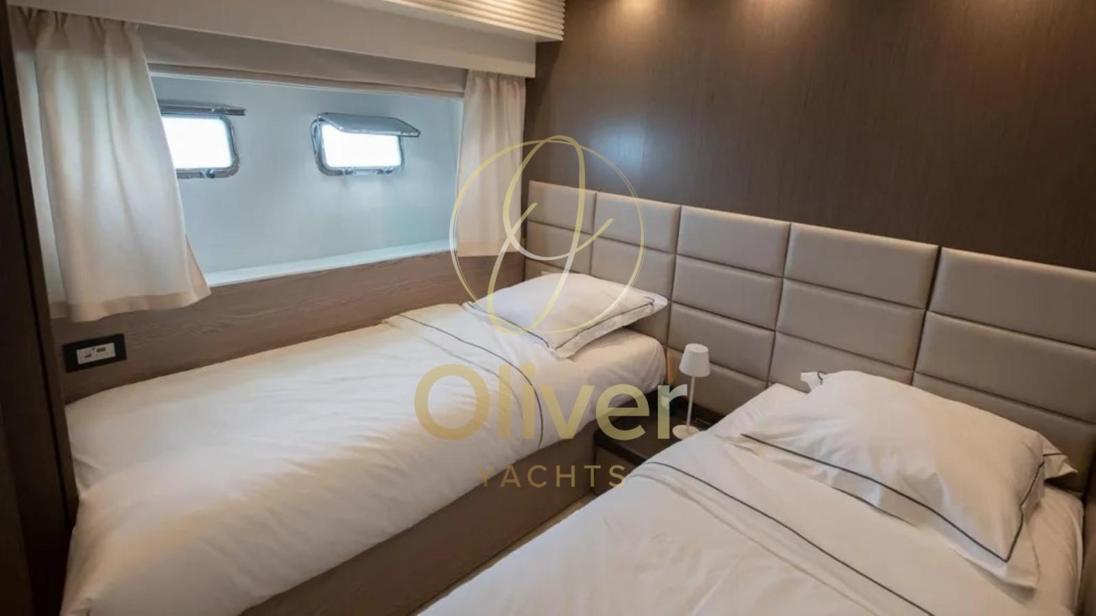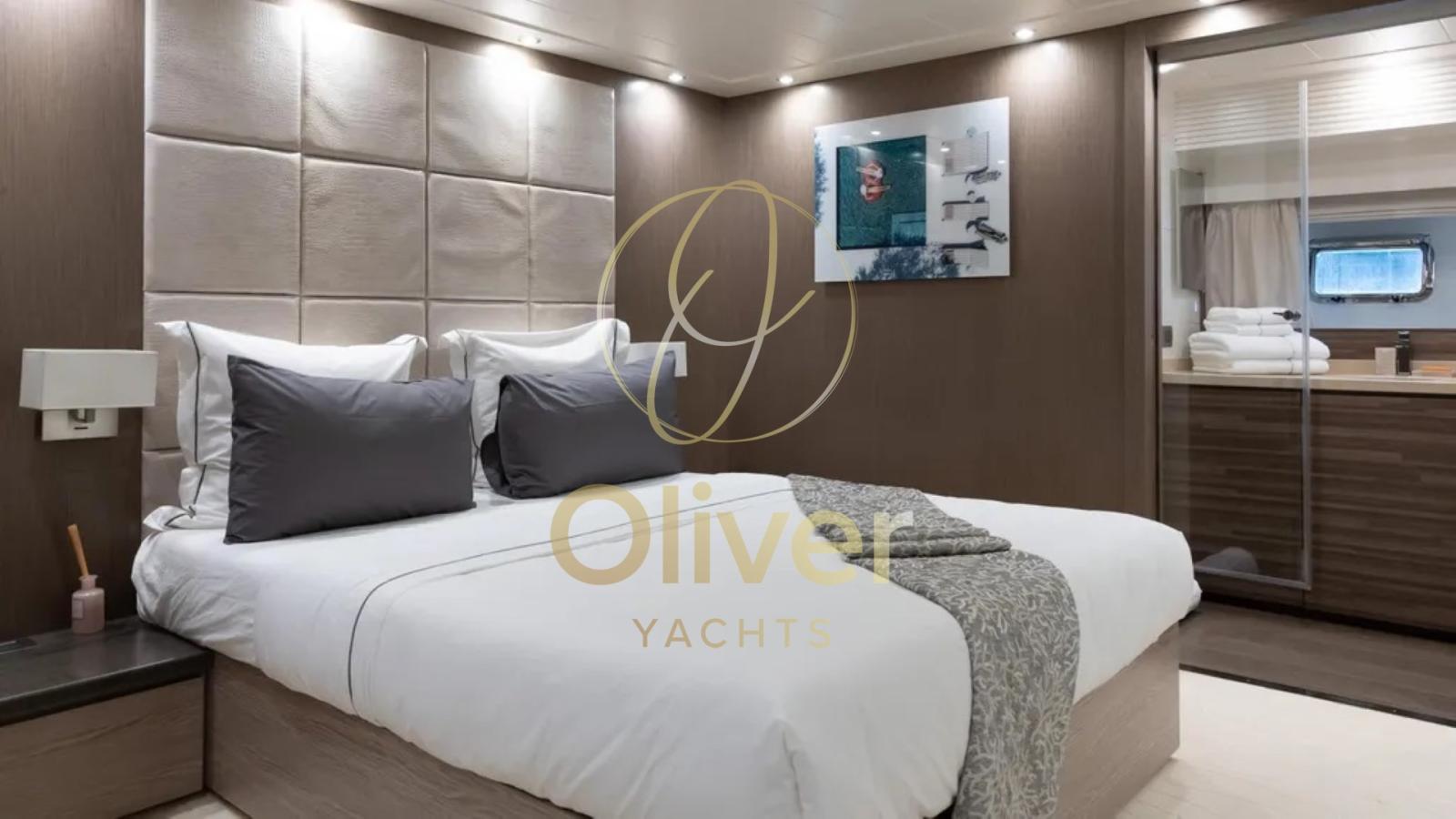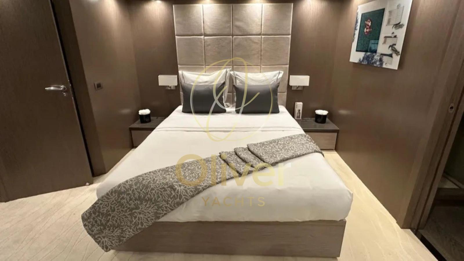 L’armatoriale, posizionata a centro barca, è una vera suite full-beam con scrivania, cabina armadio e bagno en suite. La cabina VIP, anch’essa con bagno privato, è rifinita con armadi su misura. Le due cabine doppie offrono letti singoli, armadiature intelligenti e bagni privati con doccia. In totale, l’imbarcazione ospita comodamente 9/10 ospiti in 4 cabine. La zona equipaggio prevede 2 cabine con 4 posti letto e servizi dedicati, garantendo operatività e discrezione.