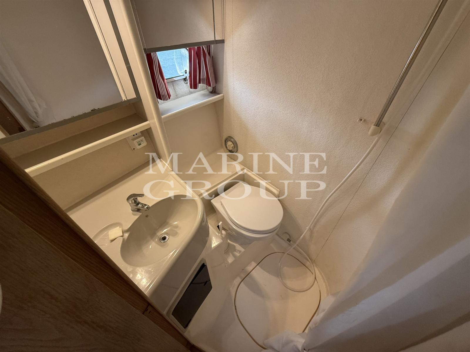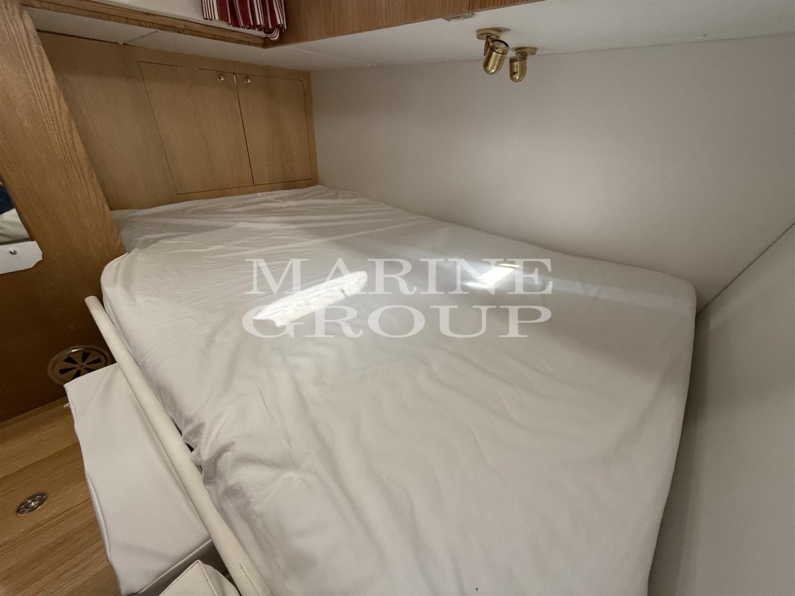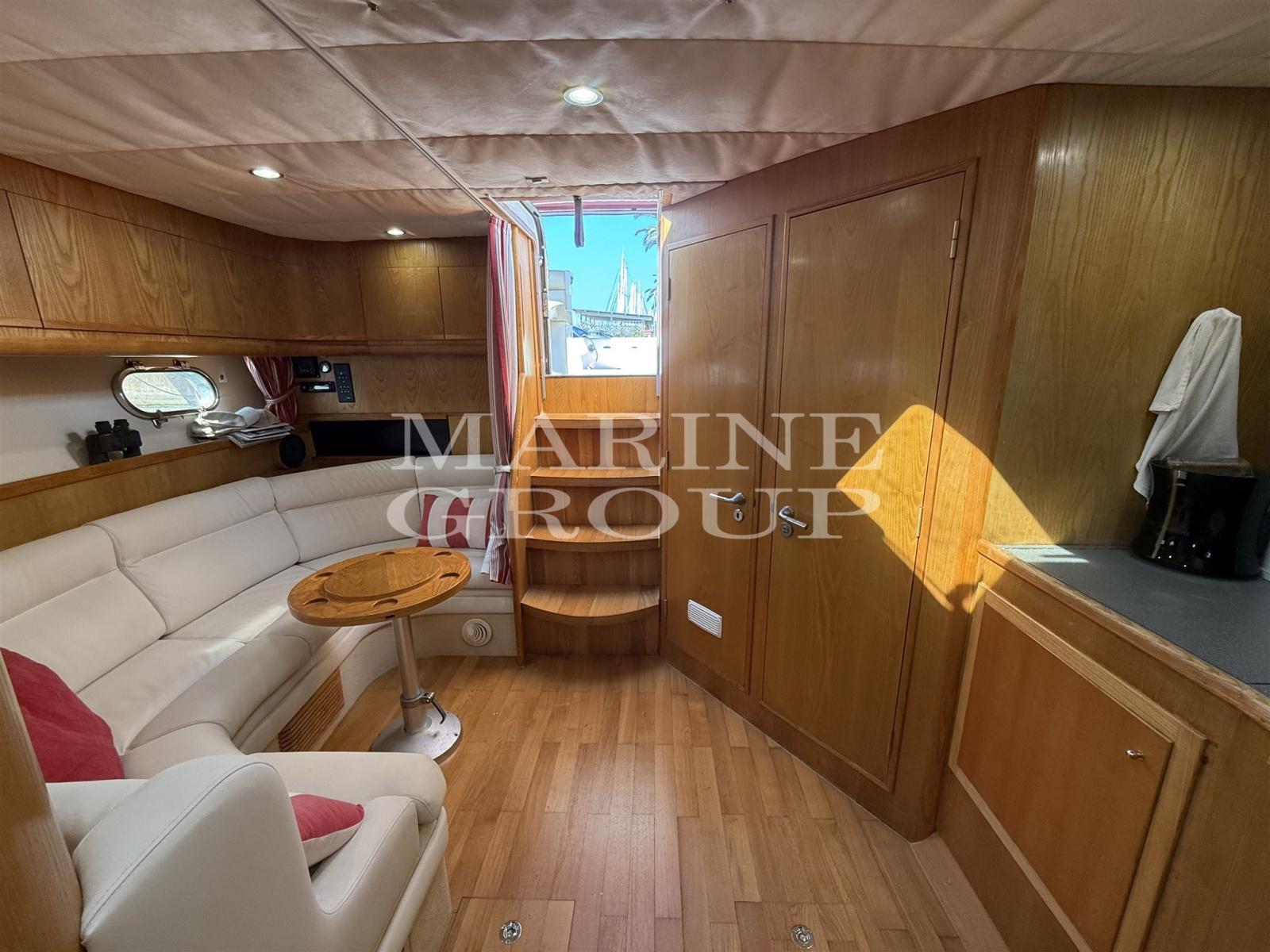 Interni in essenza chiara; dinette trasformabile con comoda seduta a "C" e tavolo da pranzo; Cucina a "L" totalmente attrezzata; Cabina armatoriale a prua con letto matrimoniale e bagno privato; Cabina ospiti a centro barca modificata in matrimoniale + bagno privato con doppio accesso.