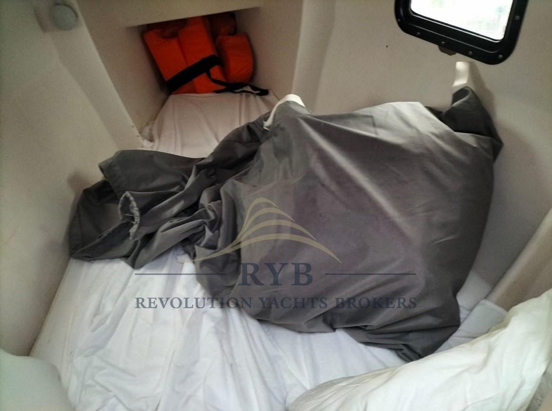 A prua cuccetta matrimoniale 190x120, bagno a tutto baglio con WC marino con serbatoio acque nere, maceratore, doccetta con pompa di sentina dedicata, dinette (altezza in cabina 1.95 m 10 cm in più del Dragonfly 28) con due lunghe panche di cui una convertibile in cuccetta 182x70. Tavolo smontabile.