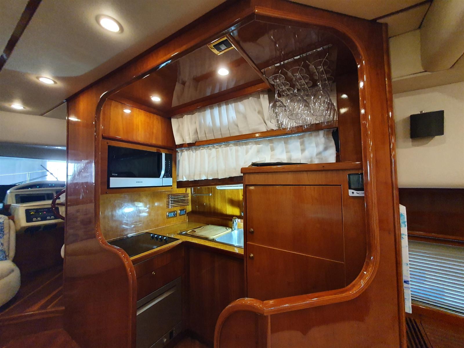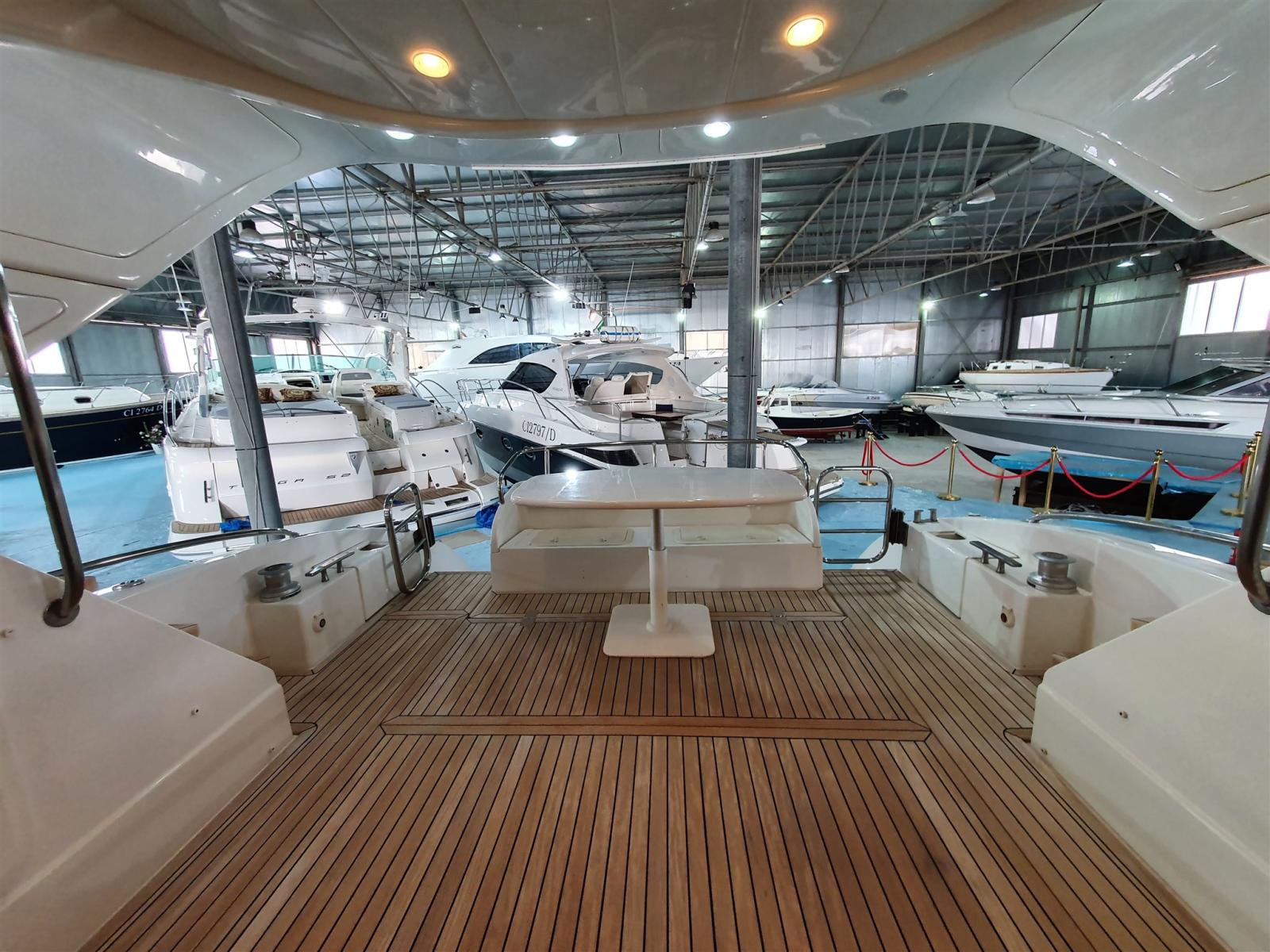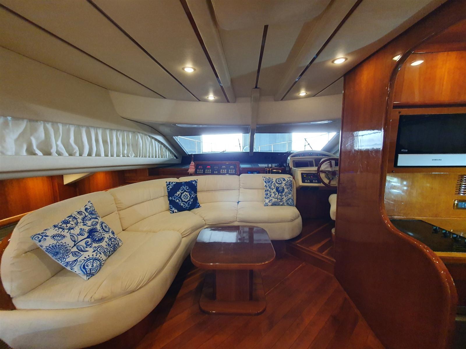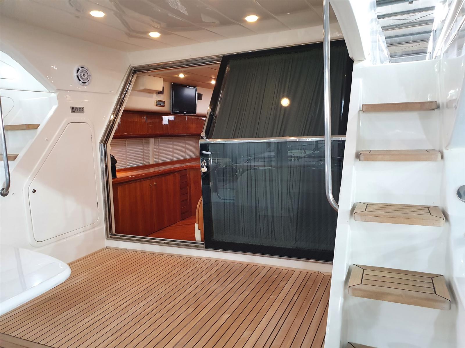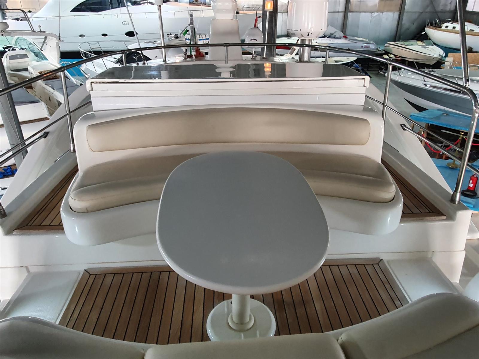 La doppia scala di acceso alla zona alta, ci porta a scoprire un Fly Bridge "diverso", interpretato con tanto spazio, sensa soluzione di continuità con il prendisole di prua, a tutto vantaggio della convivialità. Una vera terrazza sul mare!