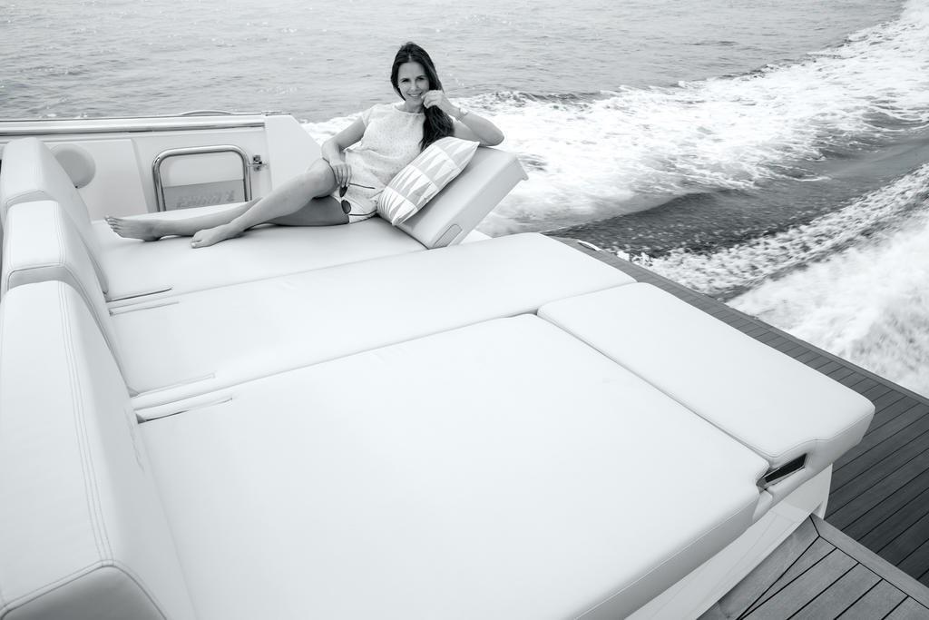 2 Bimini ((option) fwd and aft black mesh with poles), 3 Cuscineria di prua, Telo copriconsolle, 8 Telo coprisedile (Fwd sunpad, companionway, dashboard, benches, tables and rear sunpad), Tenda Elettrica ((option) integrated in TTOP).