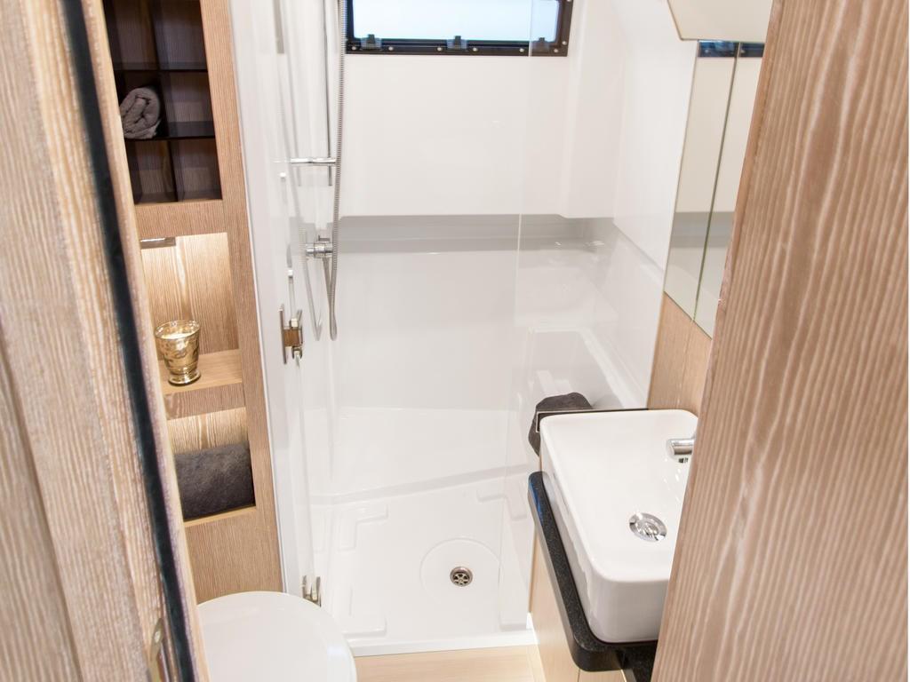 Aria condizionata ((option) 16.000 or 32.000 BTU), BBQ/ Grill, Boiler, Cassaforte, Inverter ((option) 3000W 150 Amps), Pavimento interno in legno, Prese interne 12v, Prese interne 220v, Serbatoio Acque Nere (60 litres), WC marino elettrico.