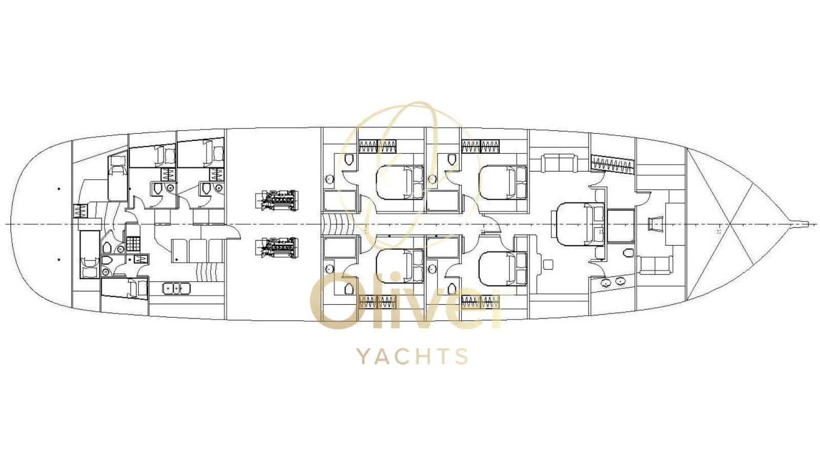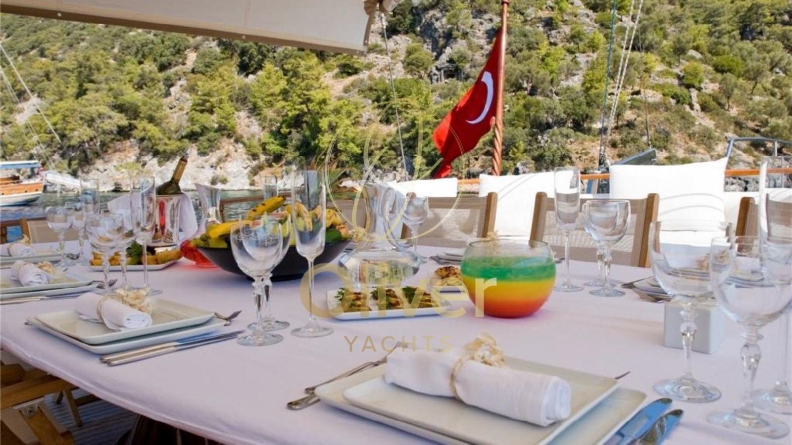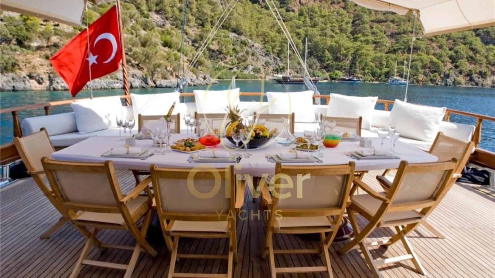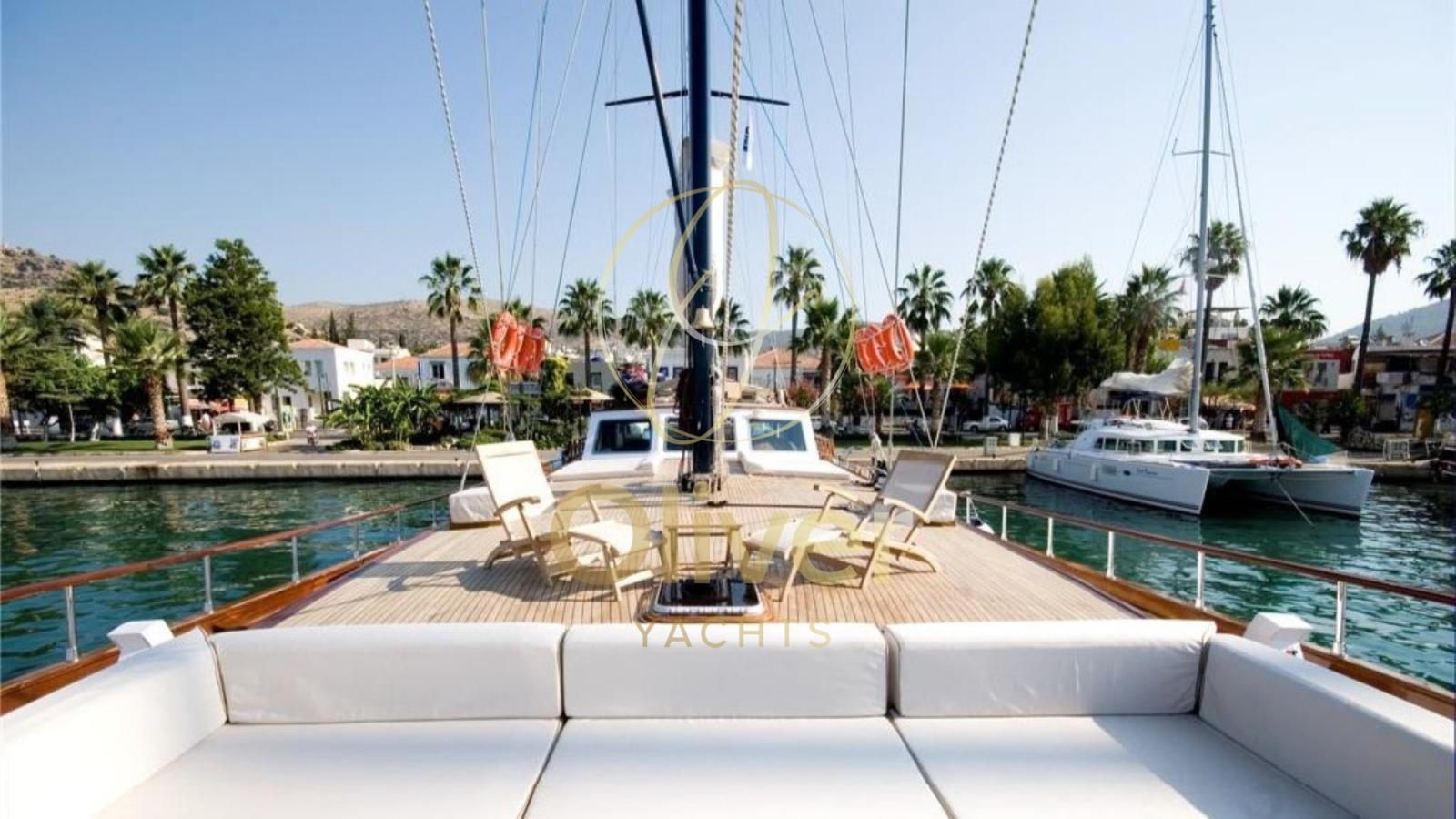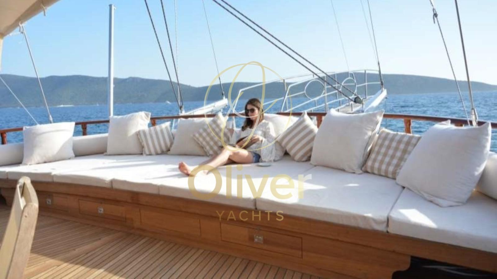 Progettato per ospitare fino a 10 persone in 5 cabine lussuose, il caicco offre anche alloggi separati per l’equipaggio. Gli esterni sono tra i suoi punti di forza: il ponte di poppa accoglie un’ampia zona pranzo all’aperto con grande tavolo e sedute imbottite, perfette per cene conviviali. Gli ampi passaggi laterali conducono a un ponte di prua spazioso e piatto, arredato con lettini prendisole e una zona salotto accogliente, ideale per rilassarsi o organizzare feste sotto le stelle. Completano gli spazi all’aperto un ponte solarium dedicato alla tintarella e una seconda area seduta a prua, perfetta per momenti tranquilli.