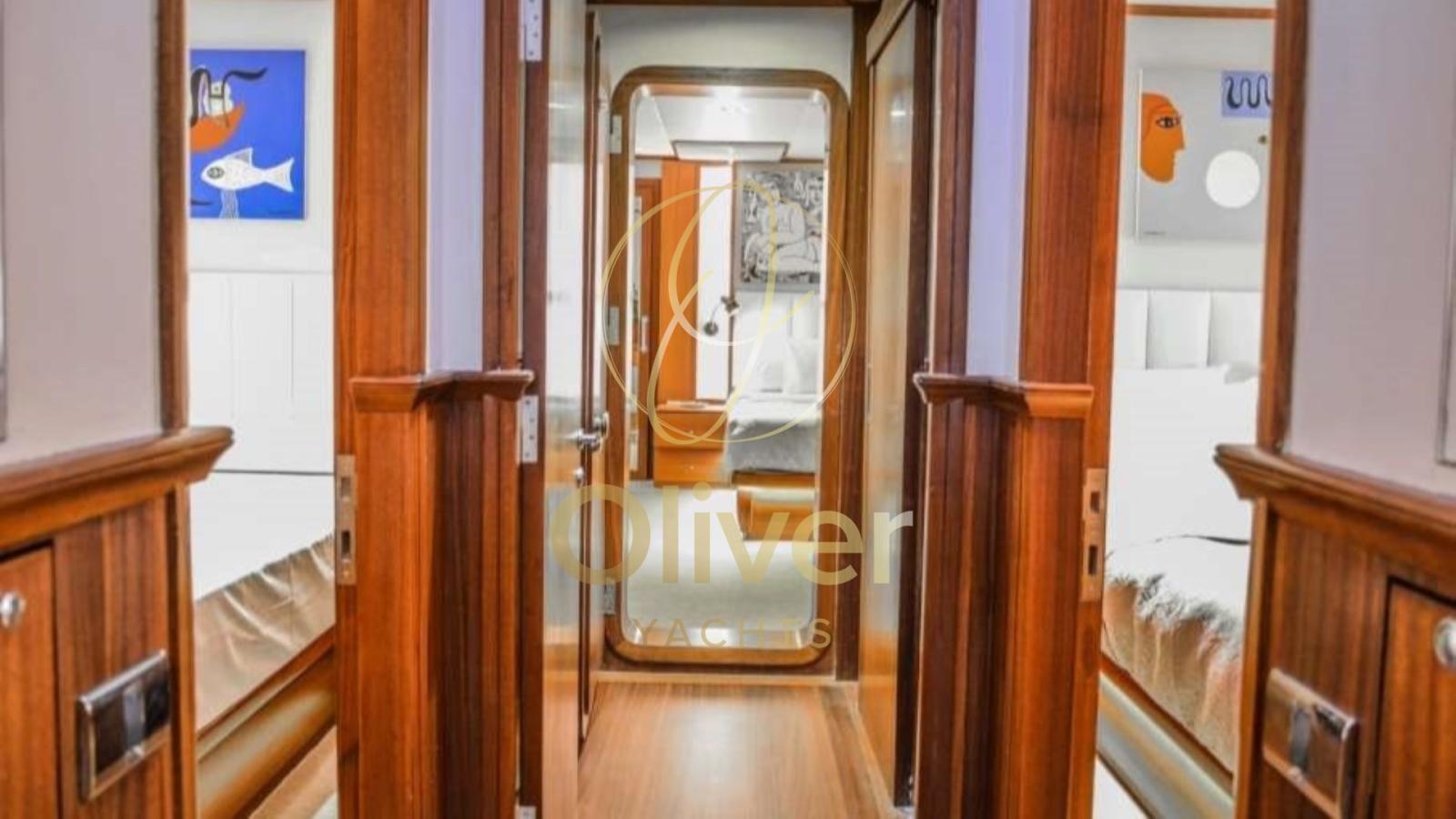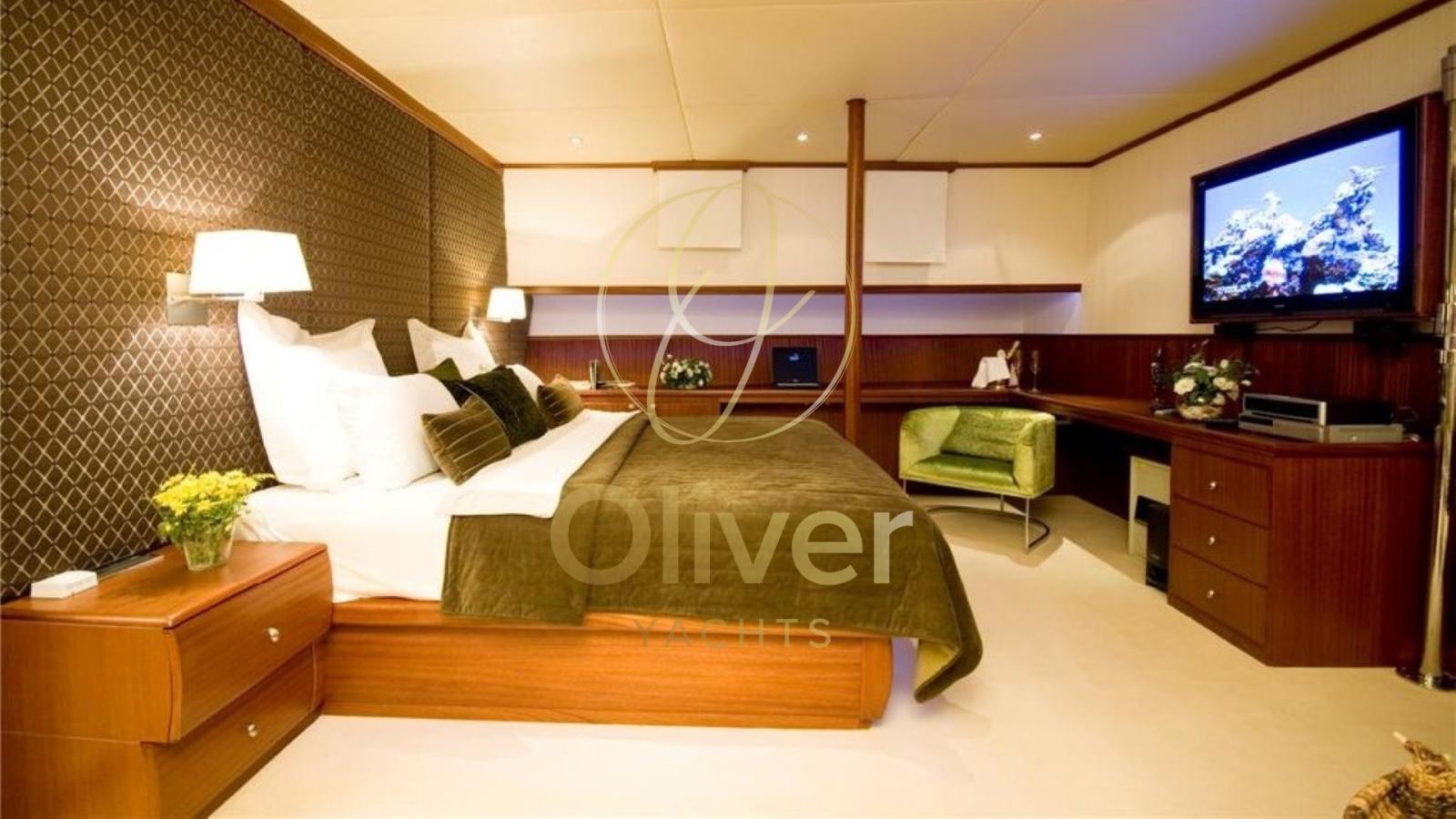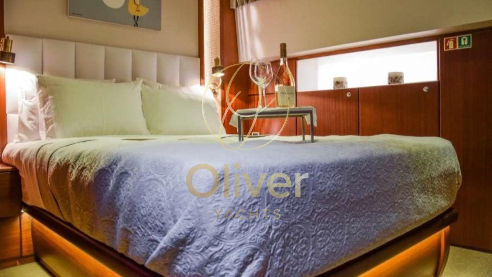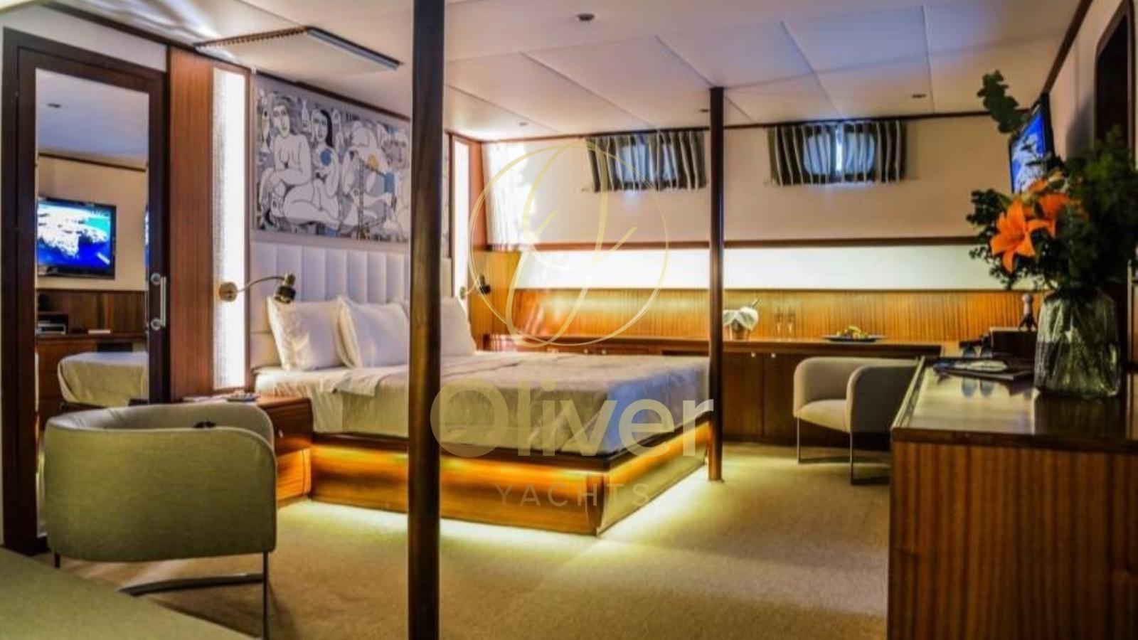 Il cuore degli interni è il salone principale, ampio e ben arredato, con comodi divani, tavolo da pranzo e una TV ruotabile a 360°, visibile anche dal ponte di poppa. La zona notte include cinque cabine ospiti: una suite armatoriale di 50 m² con letto king-size, bagno privato in marmo con ampia doccia walk-in, e quattro cabine matrimoniali con bagno privato. Una delle cabine può essere combinata con la suite armatoriale per formare una suite familiare, ideale per genitori con bambini.