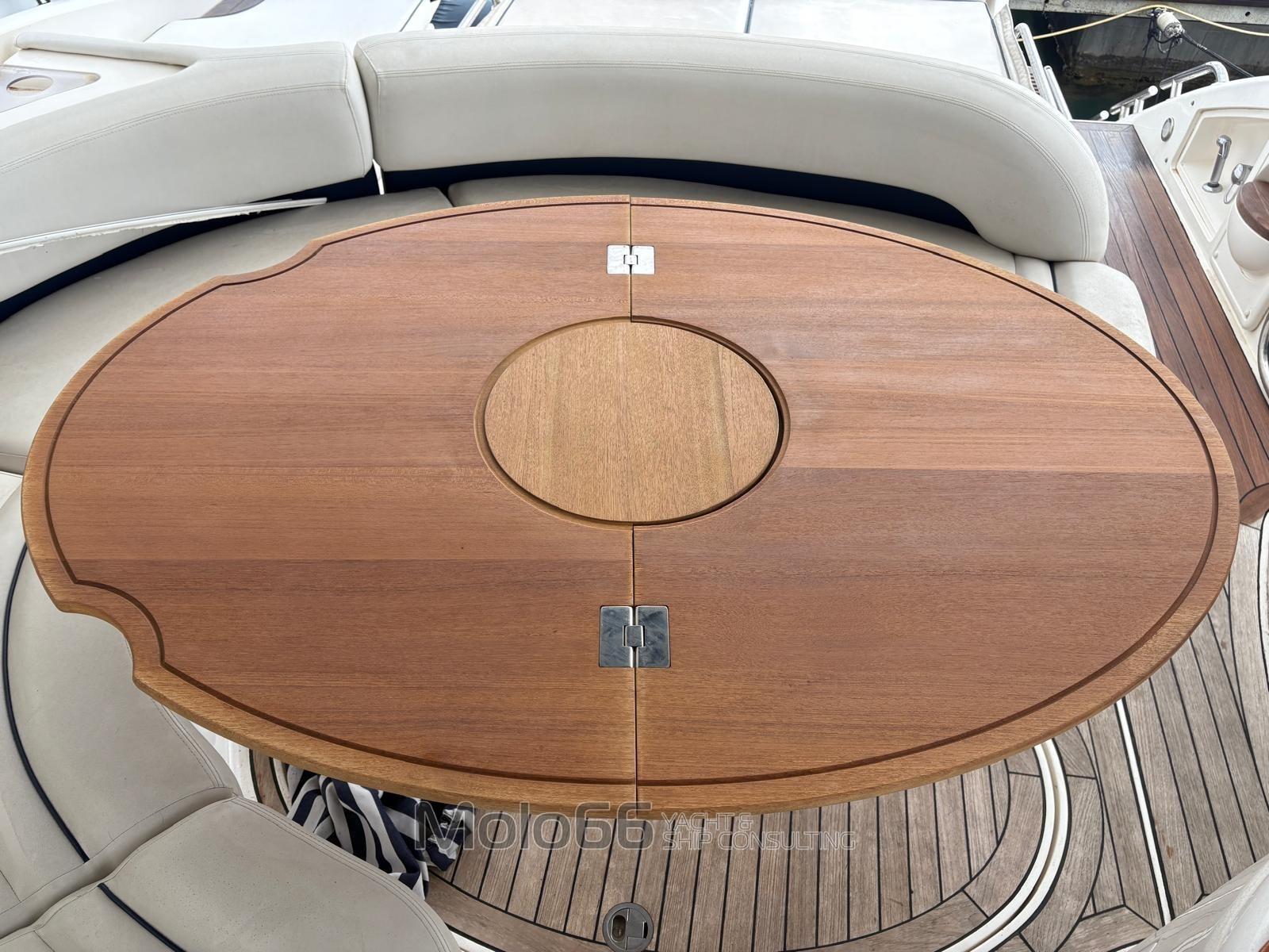Allarme motore, Allarme sentina, Autoclave, Colorazione speciale (Blu Navy), Doccia esterna, Faro orientabile, Flap idraulici, Impianto antincendio, Lavandino nel Pozzetto, Luci di cortesia, Luci subacquee, Passerella (Idraulic), Piattaforma, Pompa di sentina automatica, Pozzetto Teak, Presa 220V banchina, Raddrizzatore, Rollbar, Salpa Ancore Elettrico, Scaletta da bagno, Tavolo pozzetto, Tromba, Winch tonneggio di prua.