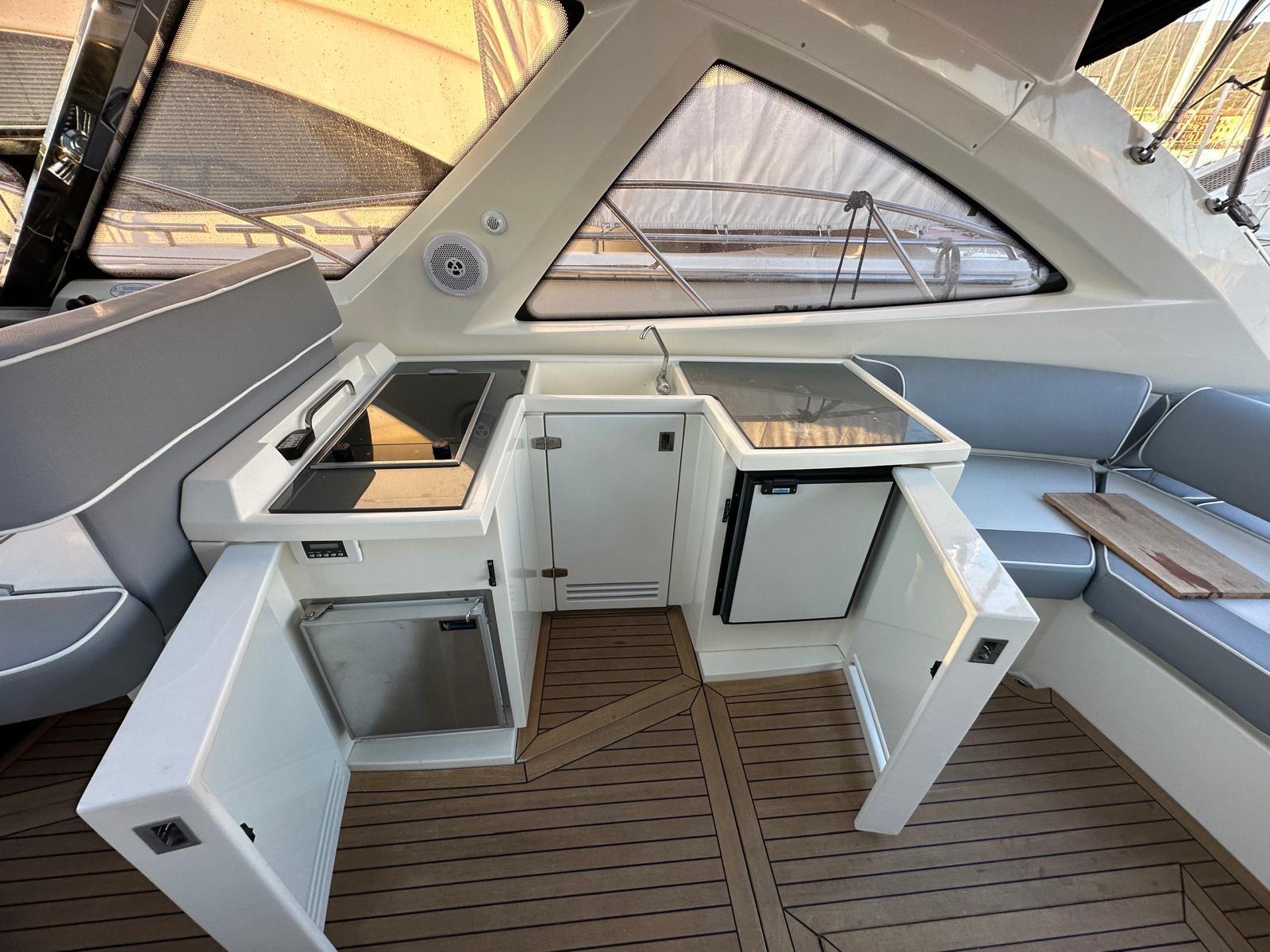Allarme motore, Allarme sentina, Autoclave, Doccia esterna, Flap idraulici, Passerella (idrualica a scomparsa), Piattaforma (di poppa in teak), Pozzetto Teak, Salpa Ancore Elettrico, Tavolo pozzetto.