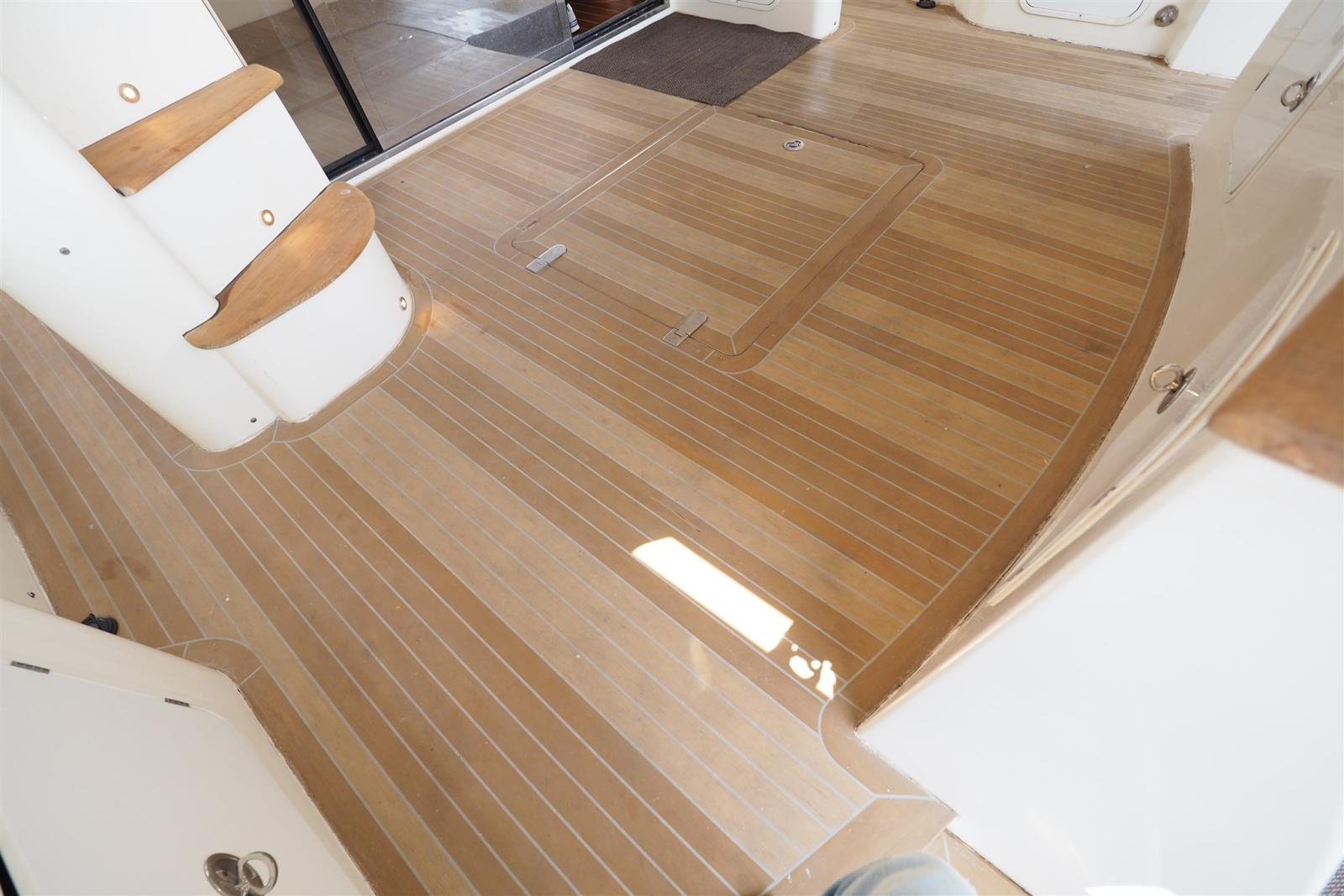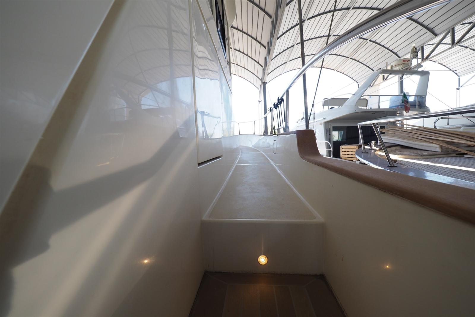 Camminamenti laterali in teak (sintetico), Elica di prua - bow thruster (Side Power), Passerella (idraulica), Piattaforma (di poppa in teak sintetico), Porta laterale (accesso postazione comandi), Pozzetto Teak (sintetico), Presa 220V banchina (doppia spina), Winch tonneggio di poppa.