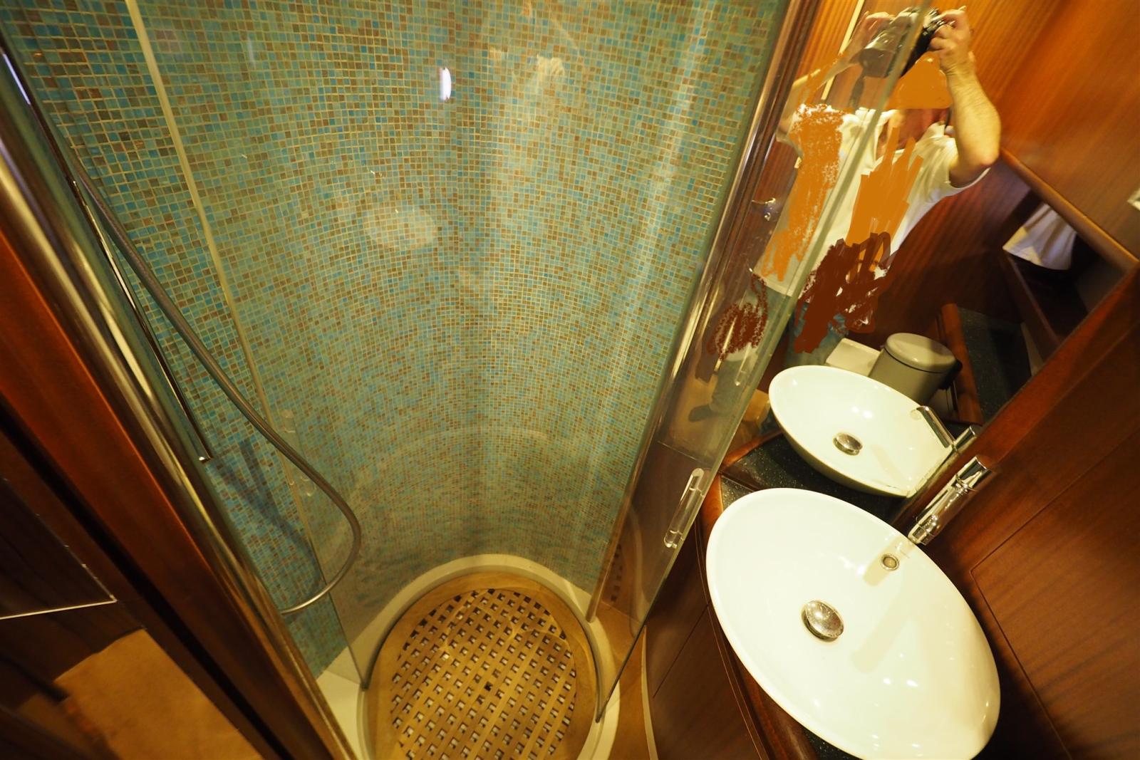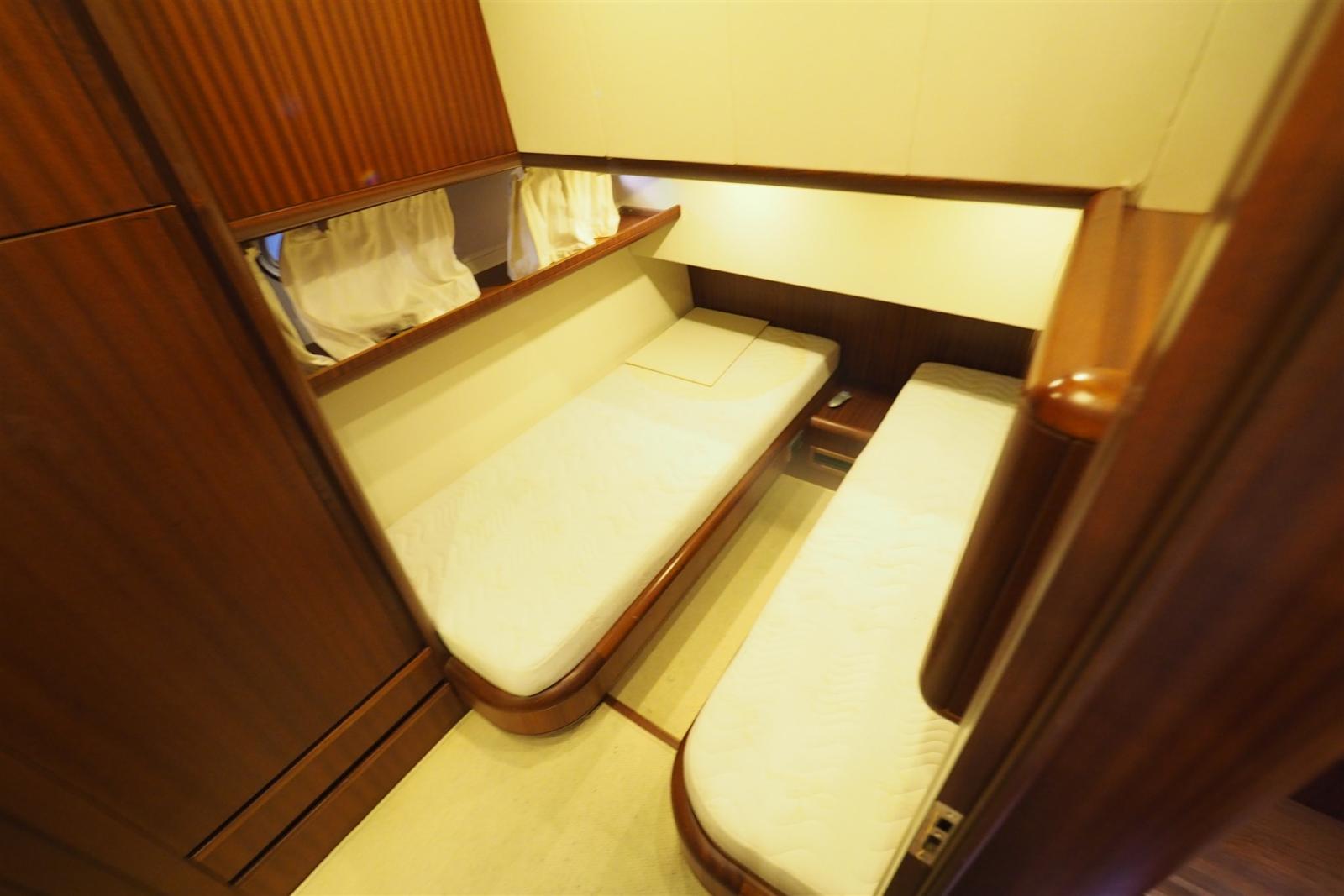 Il layout interno è composto da tre cabine per due persone e due bagni completi di box doccia e bidet. La porta laterale che mette in comunicazione la timoneria con il passavanti è quanto mai