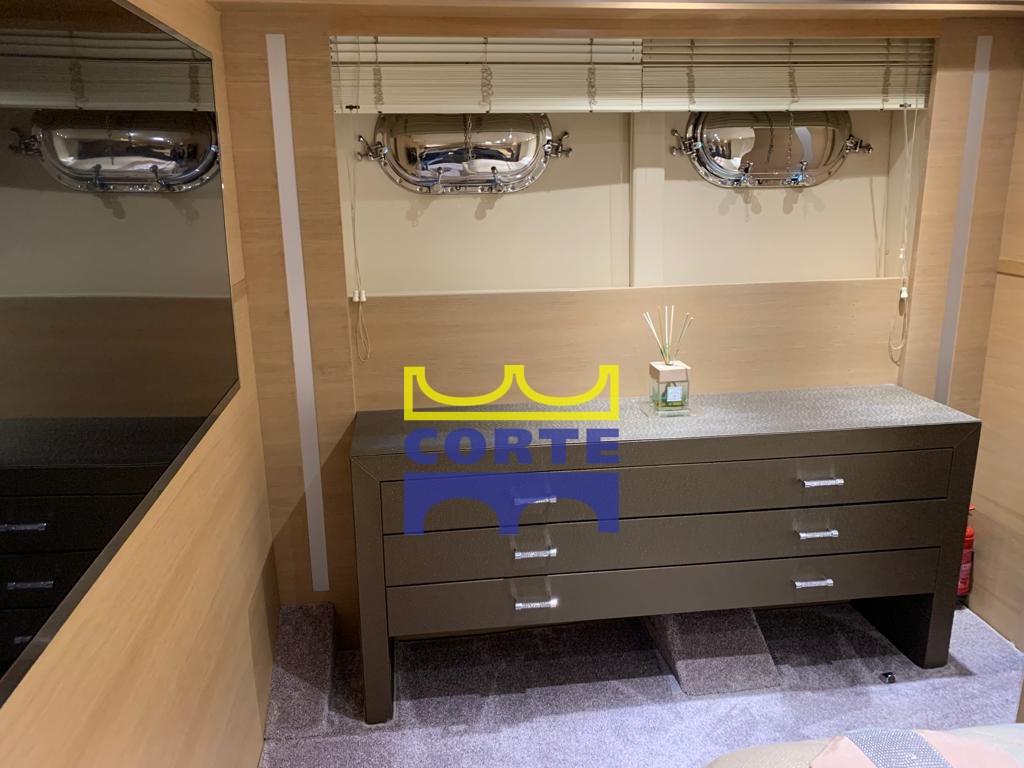 Pavimentazione interna in legno di rovere sbiancato e coperta in teak massello. Pavimentazione cabine in moquette premium.