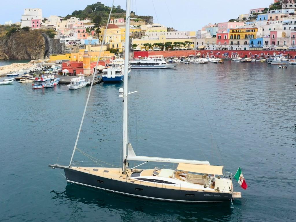 Refit 2019-24: teak, verniciatura, motore Yanmar 250 hp, rig & elettronica Garmin, interni Marco Casali; full safety > 50 M, 2 × water-maker, twin genset