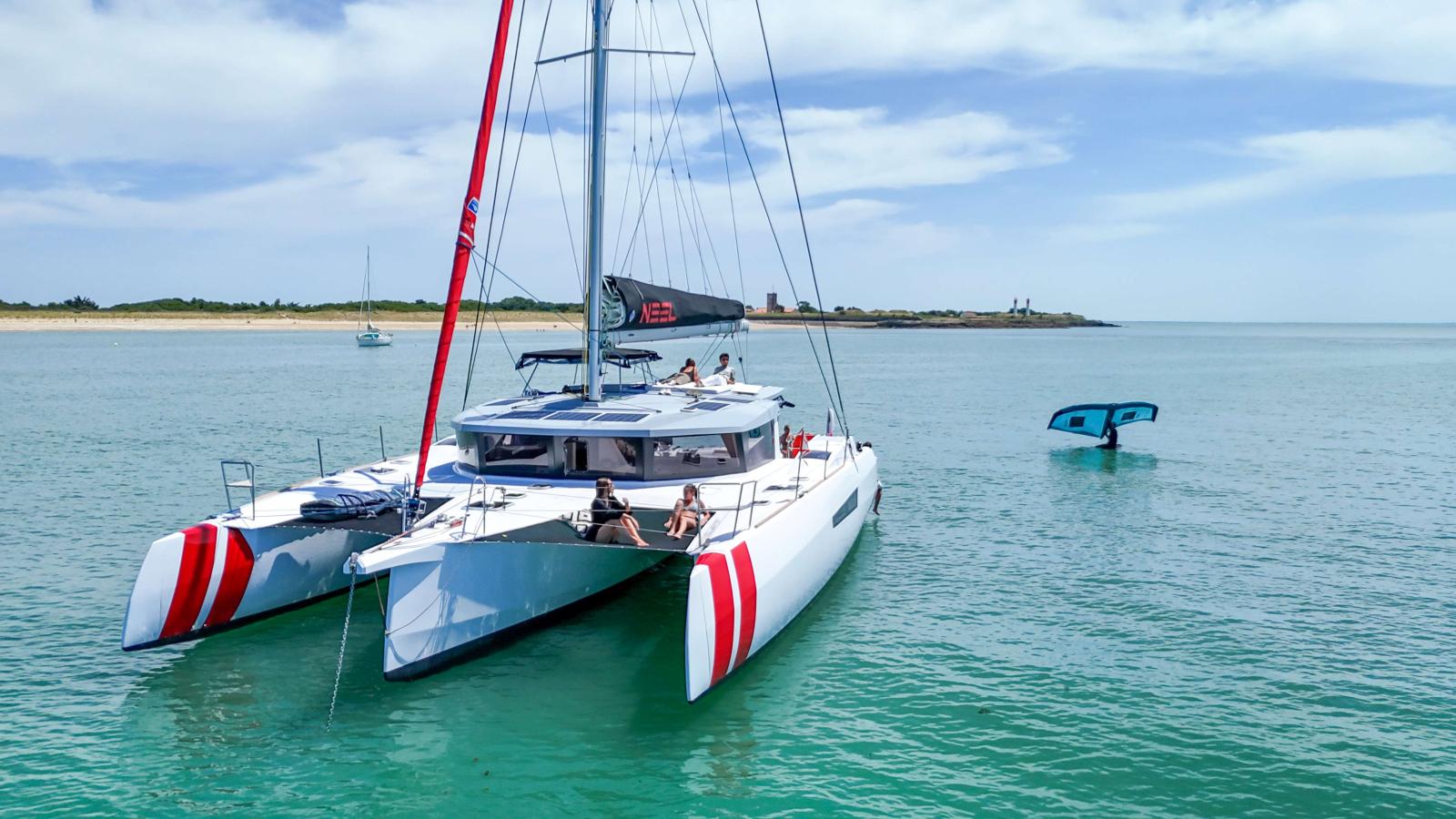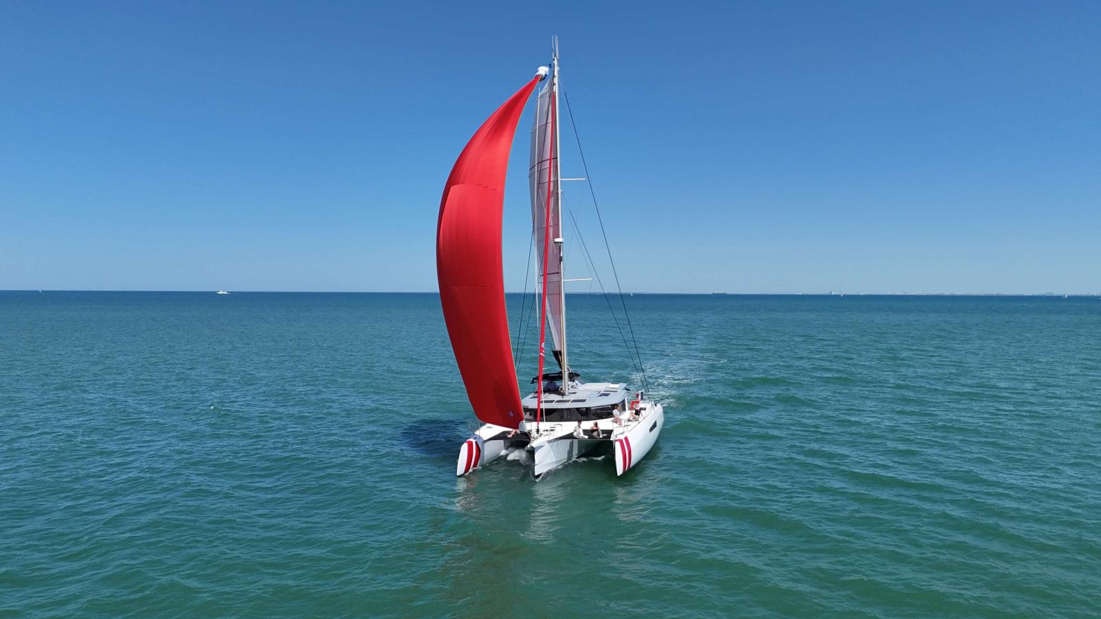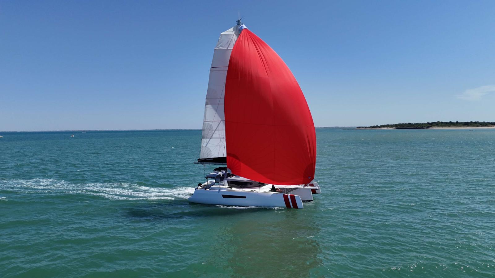 Colore scafo : Finition des coques en Gel coat gris clair + 2 bandeaux rouges sur chacun des flotteurs