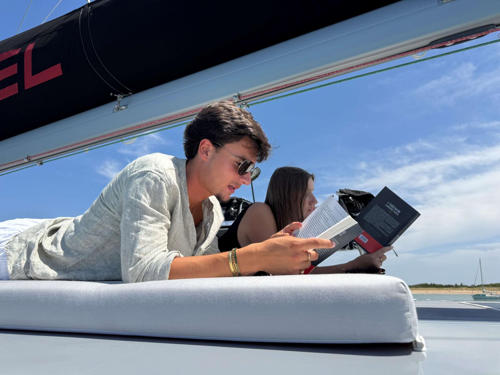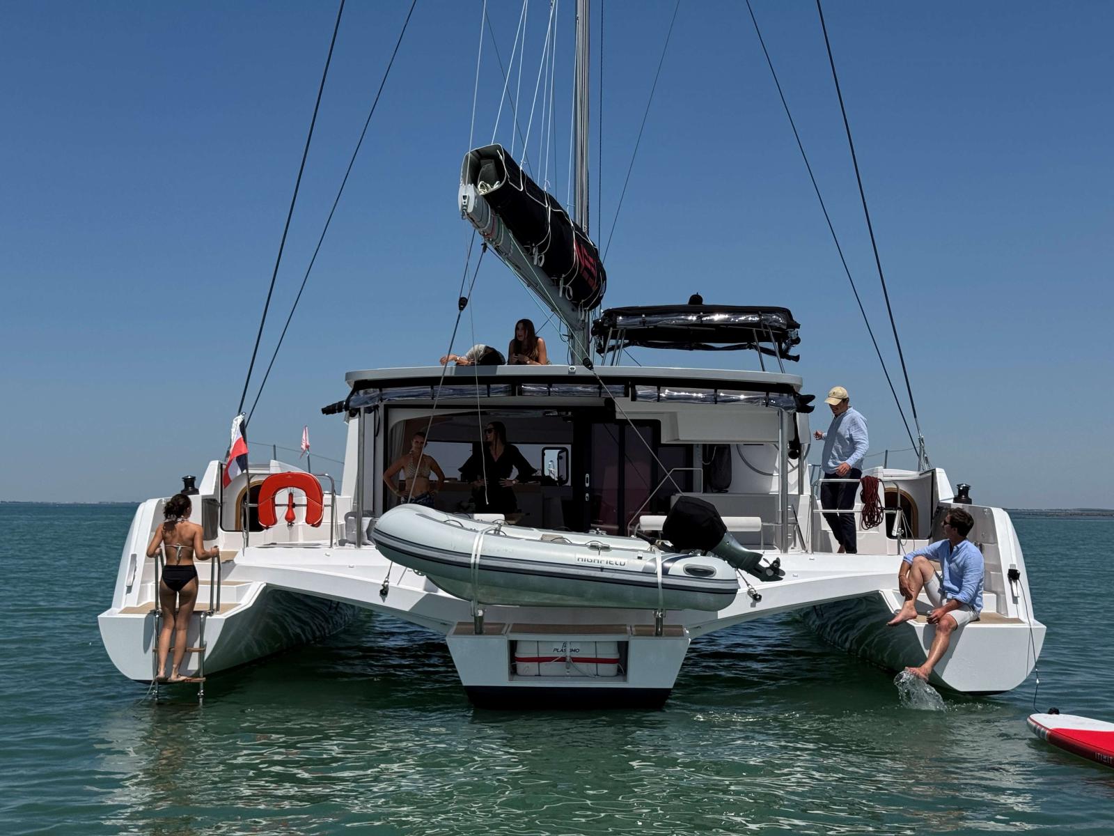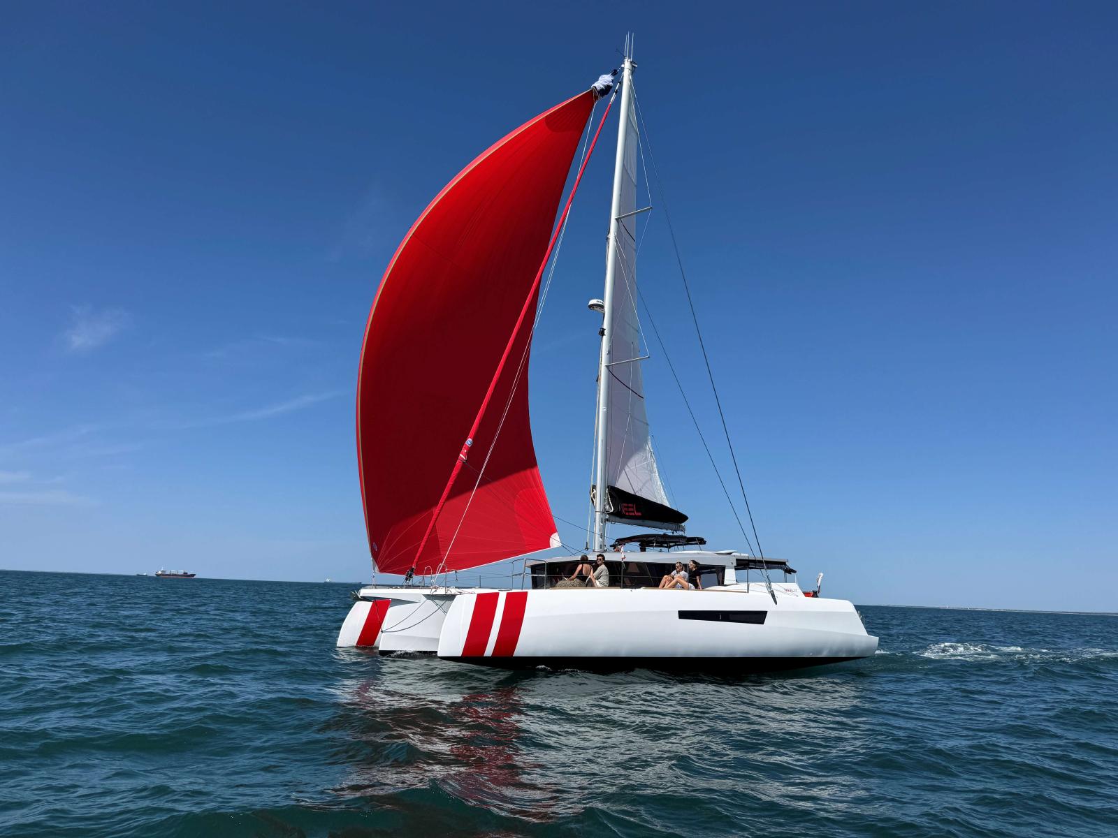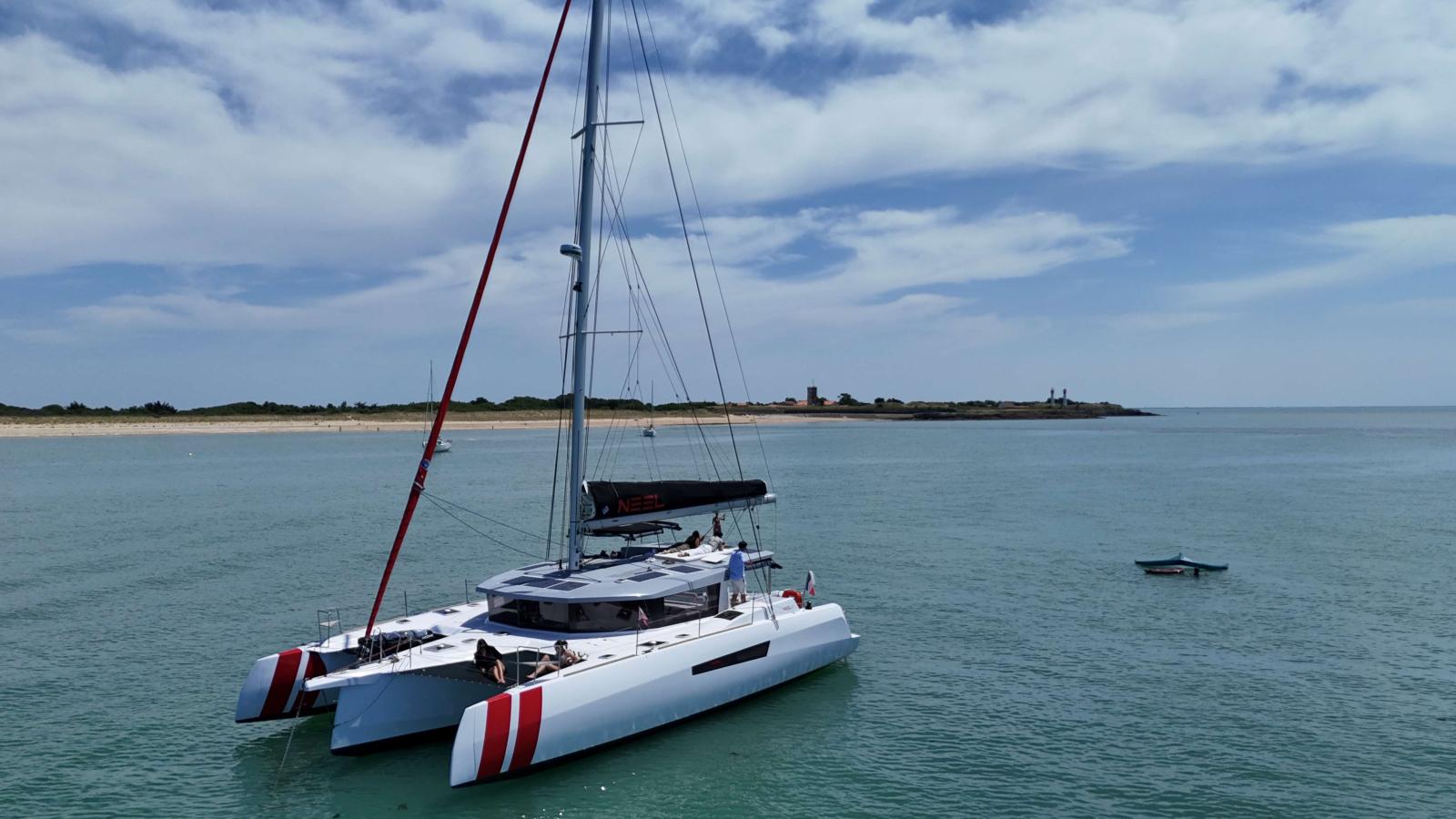 Colore scafo : Finition des coques en Gel coat gris clair + 2 bandeaux rouges sur chacun des flotteurs