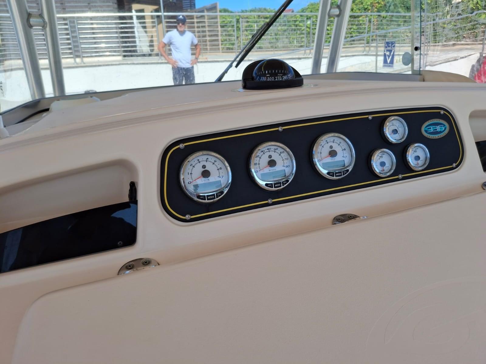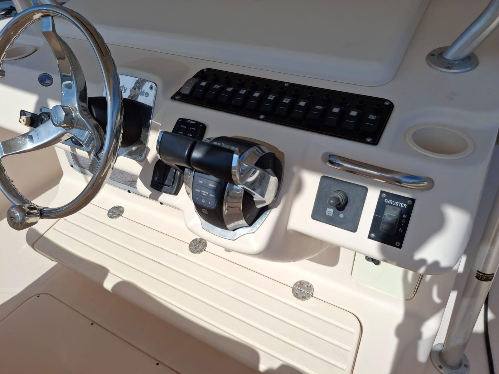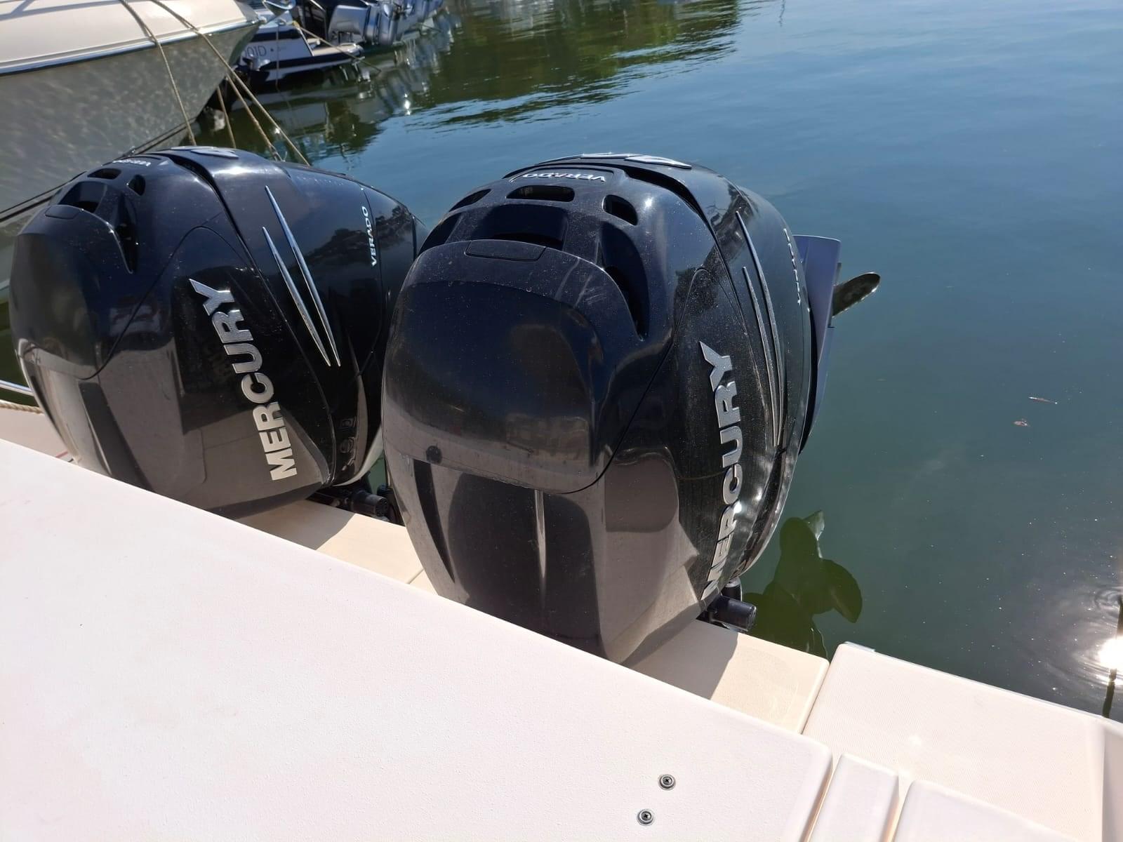T- Top, con portacanne e luci pozzetto; battagliola inox 316; prese 12 V. per mulinelli elettrici; trsduttore ecoscandaglio a raso; eliche inox; chiusure frontali e laterali; 2021 NUOVI : motori; ore stimate cira 400; commissione per intermediazione del 5% +IVA 22% a carico dell'acquirente (IVA si calcola solamente sull' importo della commissione)