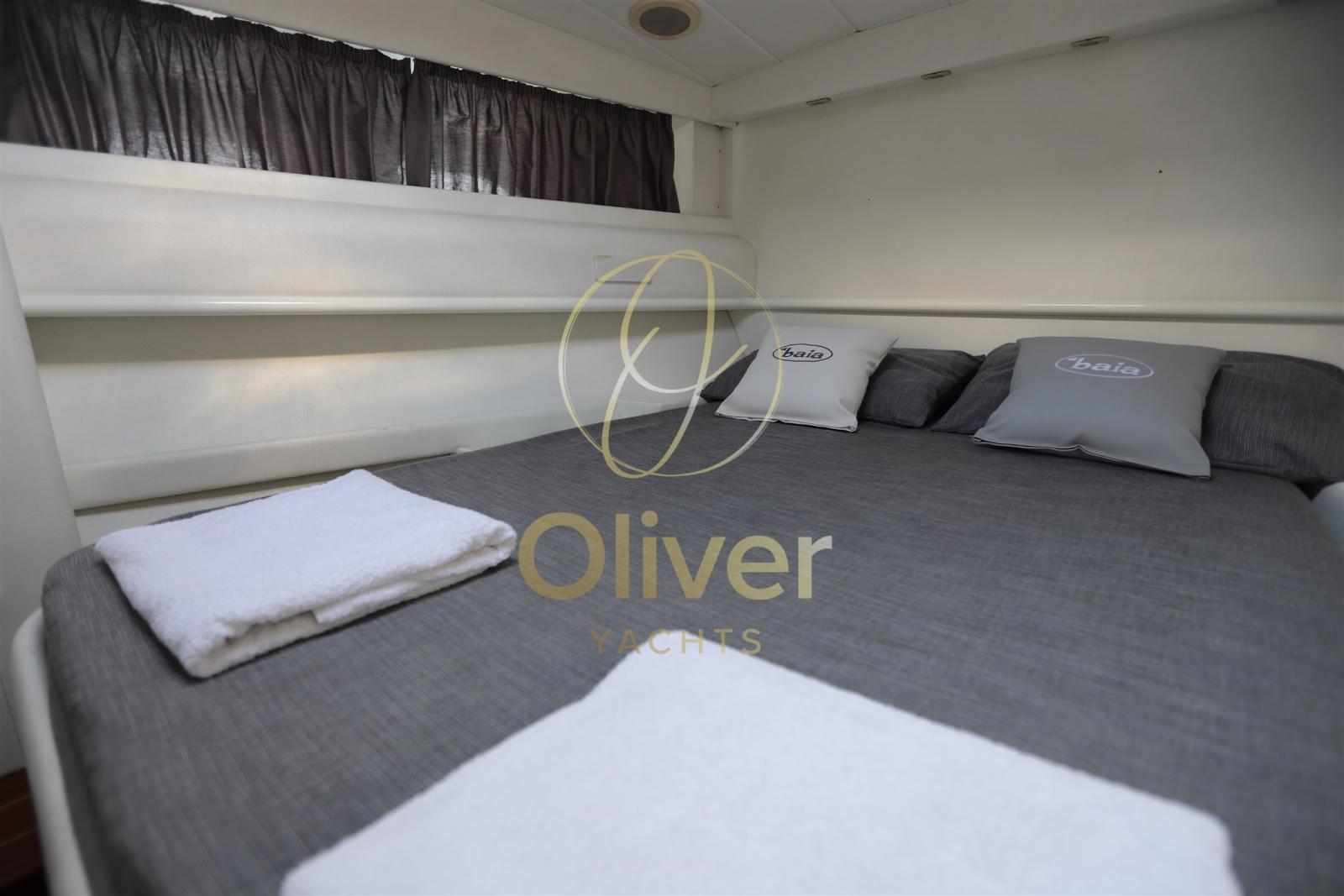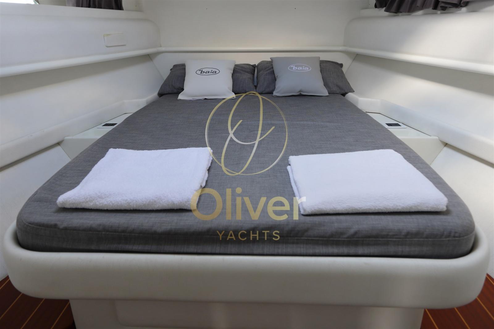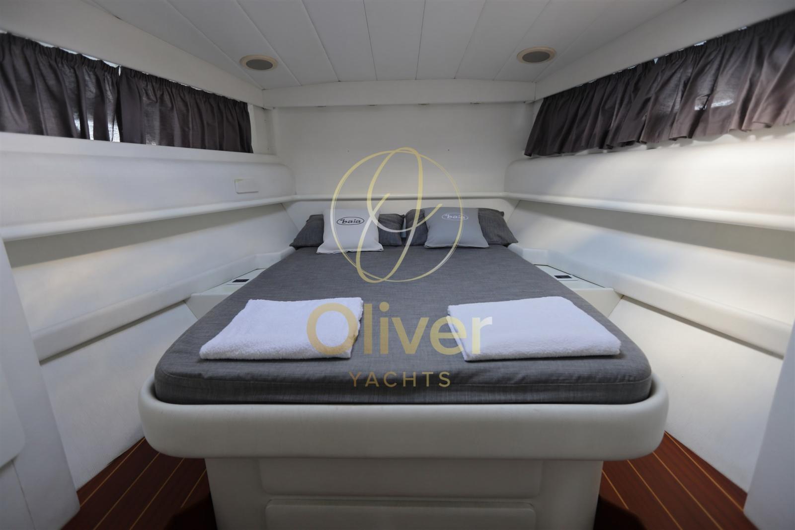 La zona notte include una cabina armatoriale ben proporzionata, con letto matrimoniale e armadiature, rifinita con tessuti e superfici coordinate. È presente anche una cabina singola per il marinaio, accessibile separatamente, che può essere utilizzata anche come vano tecnico o ripostiglio.