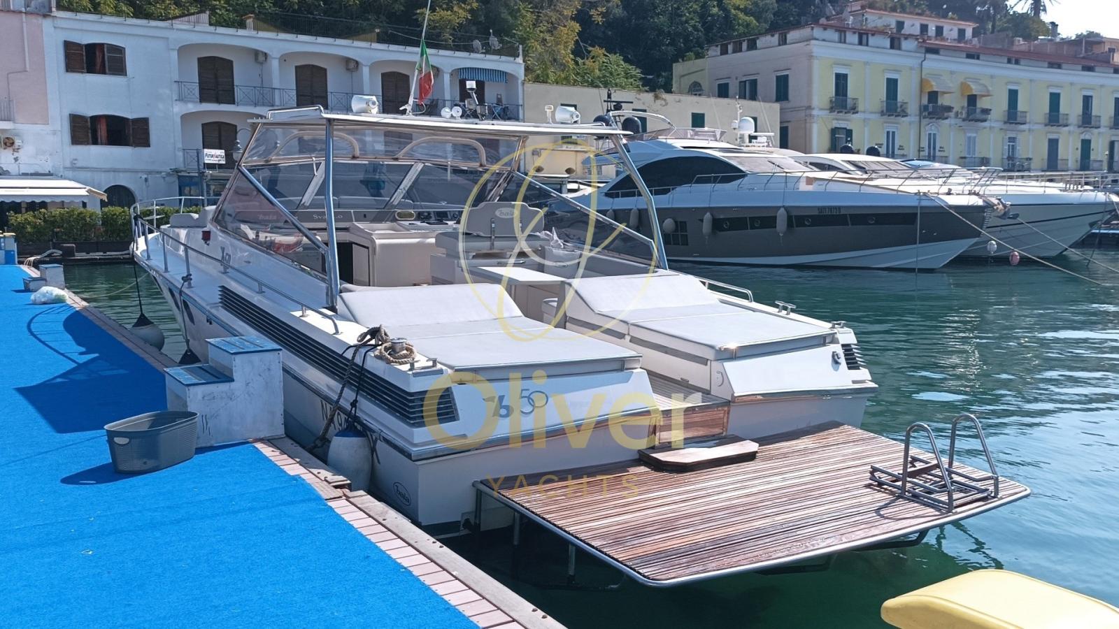 Questo esemplare in particolare, costruito nel 1990, ha beneficiato di un refit totale nel 2019, che ne ha completamente rinnovato lo stile e le dotazioni. Tra le modifiche principali spiccano l’installazione di un hard top rigido, l’aggiunta di vetri in cristallo per una maggiore luminosità e visibilità, e una nuova struttura in acciaio AISI 316. Il passaggio a prua è stato reso più agevole grazie all'apertura centrale, mentre la vivibilità in banchina è migliorata con una passerella a scomparsa PIN Craft perfettamente integrata. A poppa, i portelloni elettrici, la cuscineria doppia, l’ampio prendisole e il rivestimento in teak completano un layout da cruiser sportivo di prestigio.