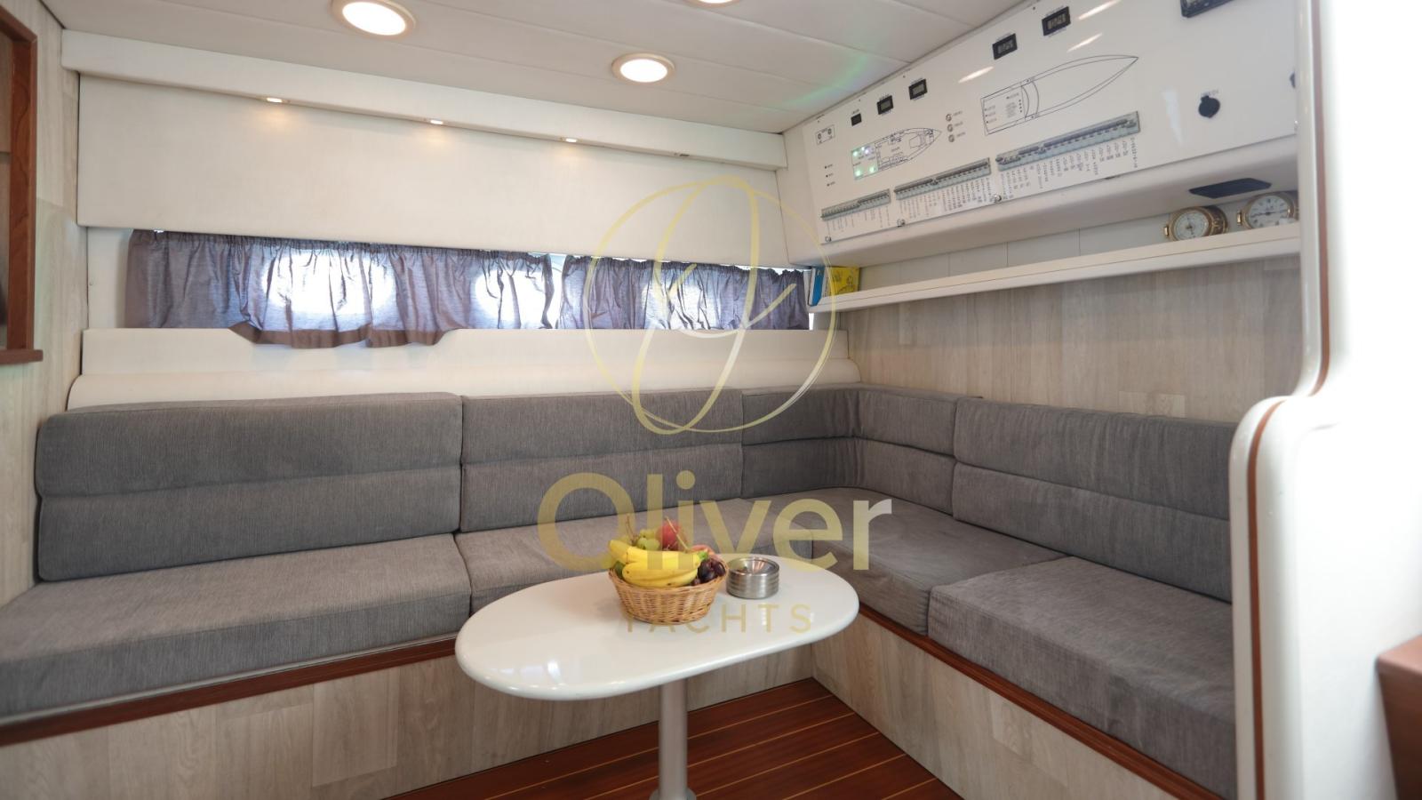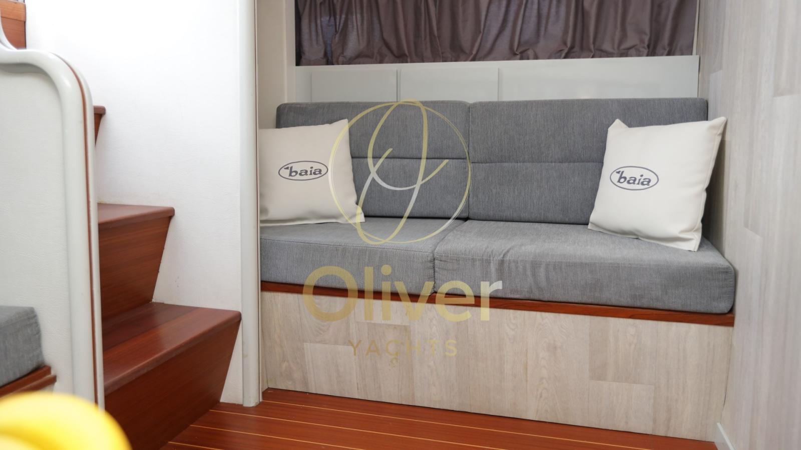 Il layout attuale prevede un’accogliente zona giorno con ampio divano a “U”, un divano in linea e mobile bar, perfetta per socializzare o rilassarsi. Gli oblò laterali consentono alla luce naturale di illuminare gli interni, creando un’atmosfera ariosa e sofisticata.