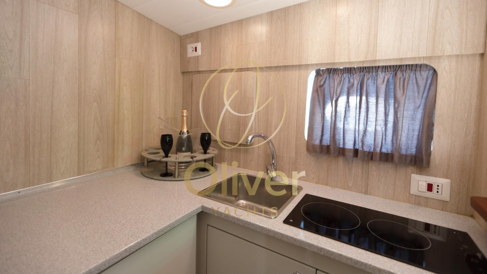Il bagno è stato completamente ridisegnato e posizionato sulla sinistra, al posto della precedente cabina ospiti. Ora offre una doccia separata, lavello moderno e servizi in stile contemporaneo, con ottimizzazione dello spazio e praticità d’uso. Al posto del vecchio bagno è stata ricavata una cucina separata, dotata di doppio piano cottura, frigorifero a cassetti e numerosi vani contenitori. Questa configurazione offre maggiore privacy tra gli spazi di servizio e quelli dedicati alla vita a bordo.