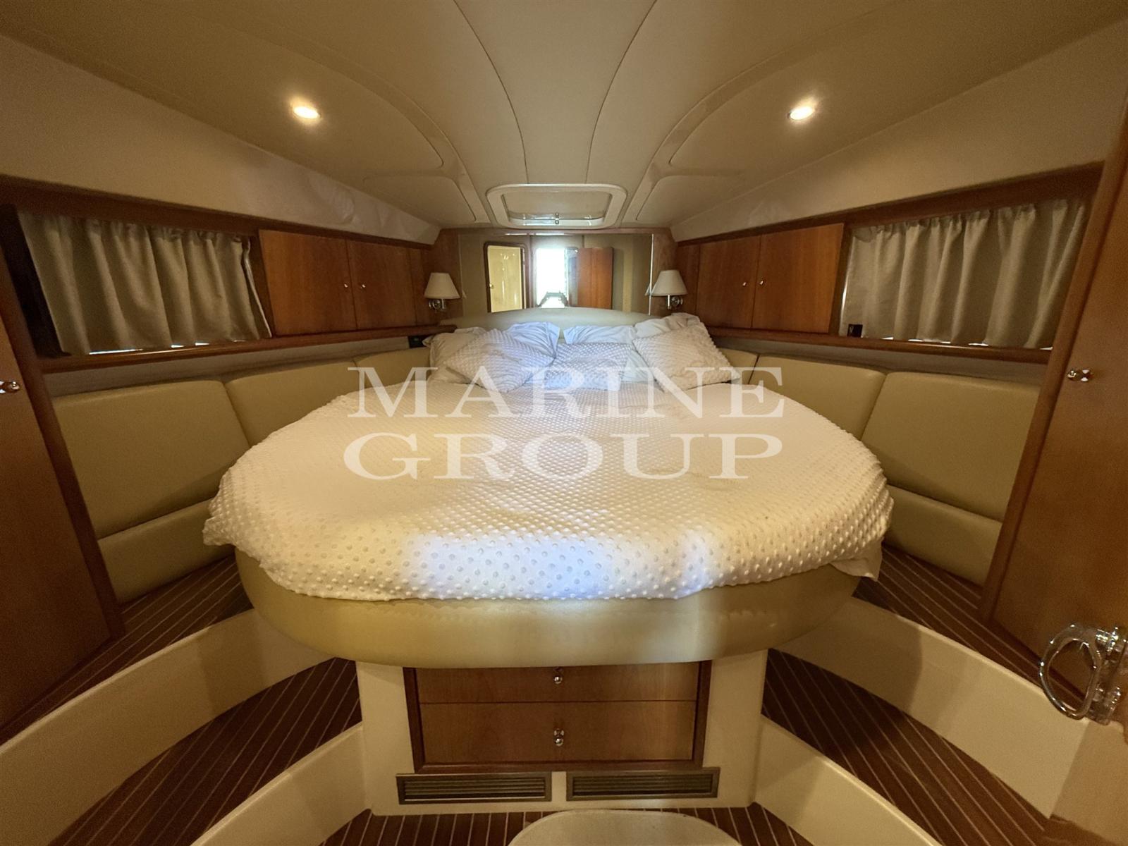Essenze interne in ciliegio; Divani in pelle bianca contrapposta; plancia di comando; Cucina completamente attrezzata; Cabina armatoriale a prua con letto matrimoniale e bagno ensuite; Cabina ospiti con letti singoli in piano; secondo bagno completo con due accessi.
