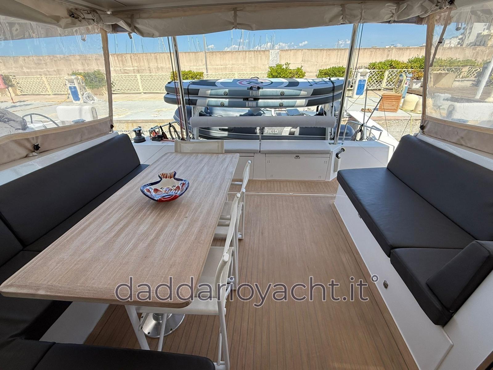 Allarme motore, Ancora (DELTA 20KG+ 70MT CATENA DA 10mm), 2 Autoclave (UNA PER ACQUA DI MARE AL LAVANDINO), 7 Batterie (4X150Ah servizi + 2 MOTORI+ 1 GENERATORE), Caricabatterie (100A), Cavo corrente di banchina, Colorazione speciale (WRAPPING GRIGIO), Doccia esterna, Doppia timoneria (CARBONIO), Gruette per tender, Luci di cortesia (blu pozzetto e poppa), Luci subacquee, Motore ausiliario (YAMAHA 25CV PER TENDER), Parabordi, 2 Pompa di sentina elettrica, Pompa di sentina manuale, Porta ingresso, Pozzetto Teak (FLEXITEAK), Presa 220V banchina, Salpa Ancore Elettrico, Sartiame spiroidale, 2 Scaletta da bagno, Tavolo pozzetto (teak 10pax), Tavolo Salone Abbattibile, 3 Winch Elettrico (POZZETTO DX+SX+DRIZZA RANDA).