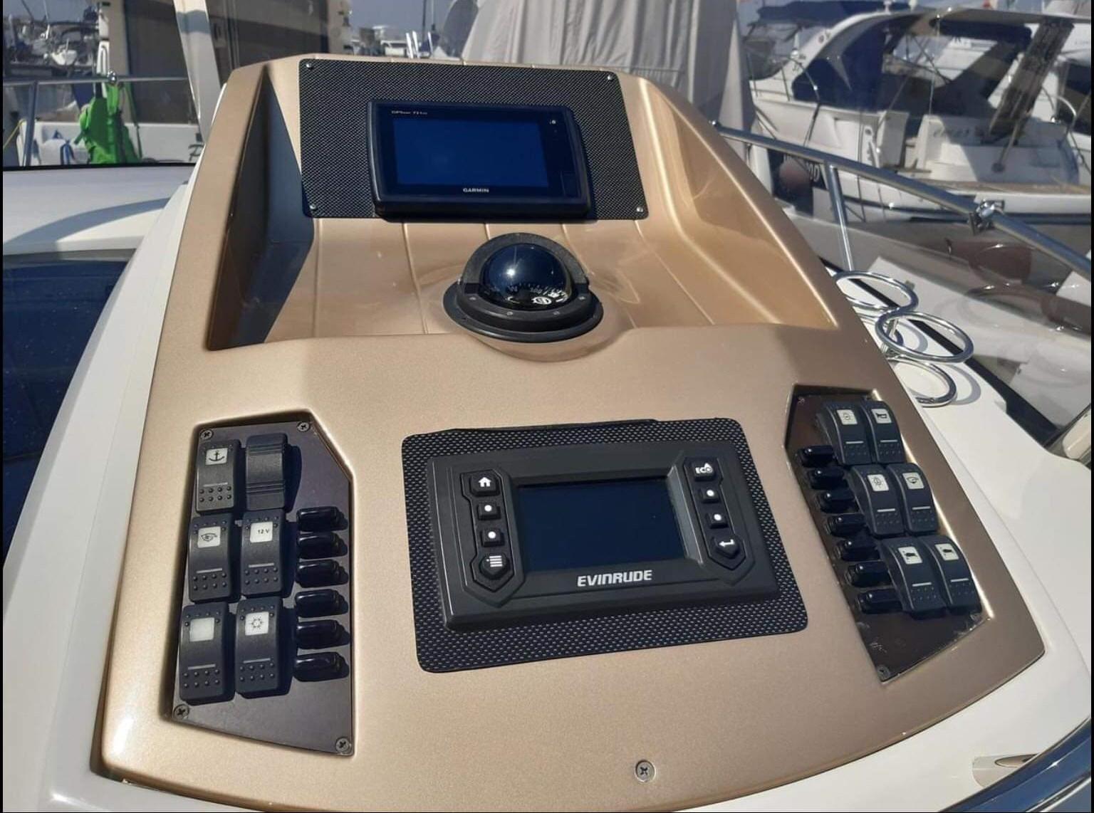 Allarme motore, 3 Batterie, Camminamenti laterali in teak, Colorazione speciale (blu verniciatura 2023), Doccia esterna, Flap idraulici, Indicatori Flaps, Lavandino nel Pozzetto, Passerella, Piattaforma, Pompa di sentina manuale, Porta ingresso, Pozzetto Teak, Presa 220V banchina, Presa acqua banchina, Salpa Ancore Elettrico, Scaletta da bagno, Tavolo pozzetto, Tender, Tromba.