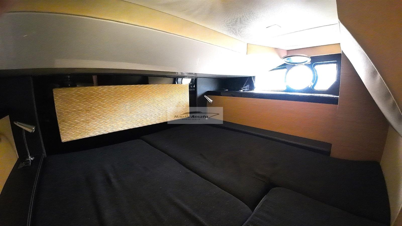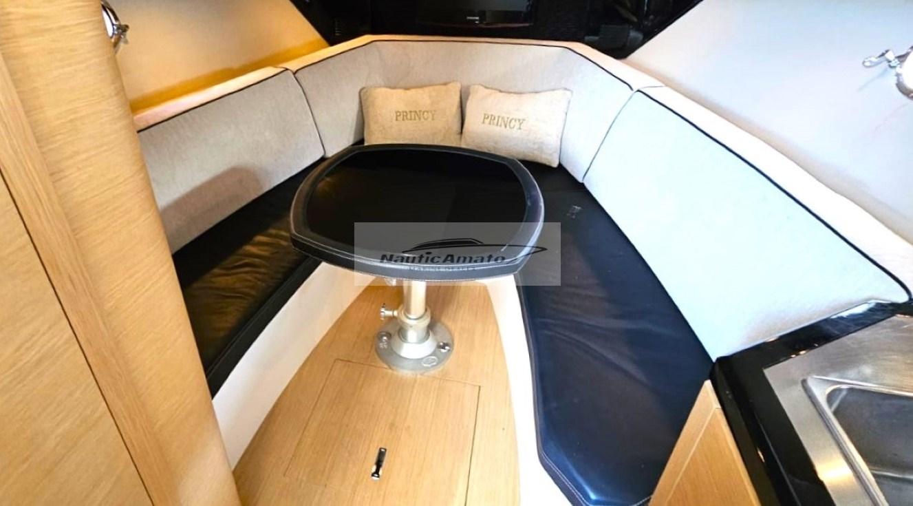 Cabina interna: L'area living è ben progettata, con una generosa dinette a prua trasformabile in un comodo letto. La cucina interna è dotata di un piano in acciaio inox, un frigorifero ampio, un forno, un grande lavello e un piano di lavoro che volendo è facilmente sostituibile con un fornello doppio. Il bagno completo è fornito di doccia. Gli interni sono rifiniti con materiali di alta qualità, creando un'atmosfera accogliente. Le ampie finestrature laterali della cabina di poppa offrono luminosità e vista sul mare.