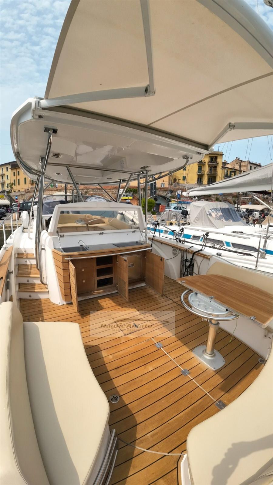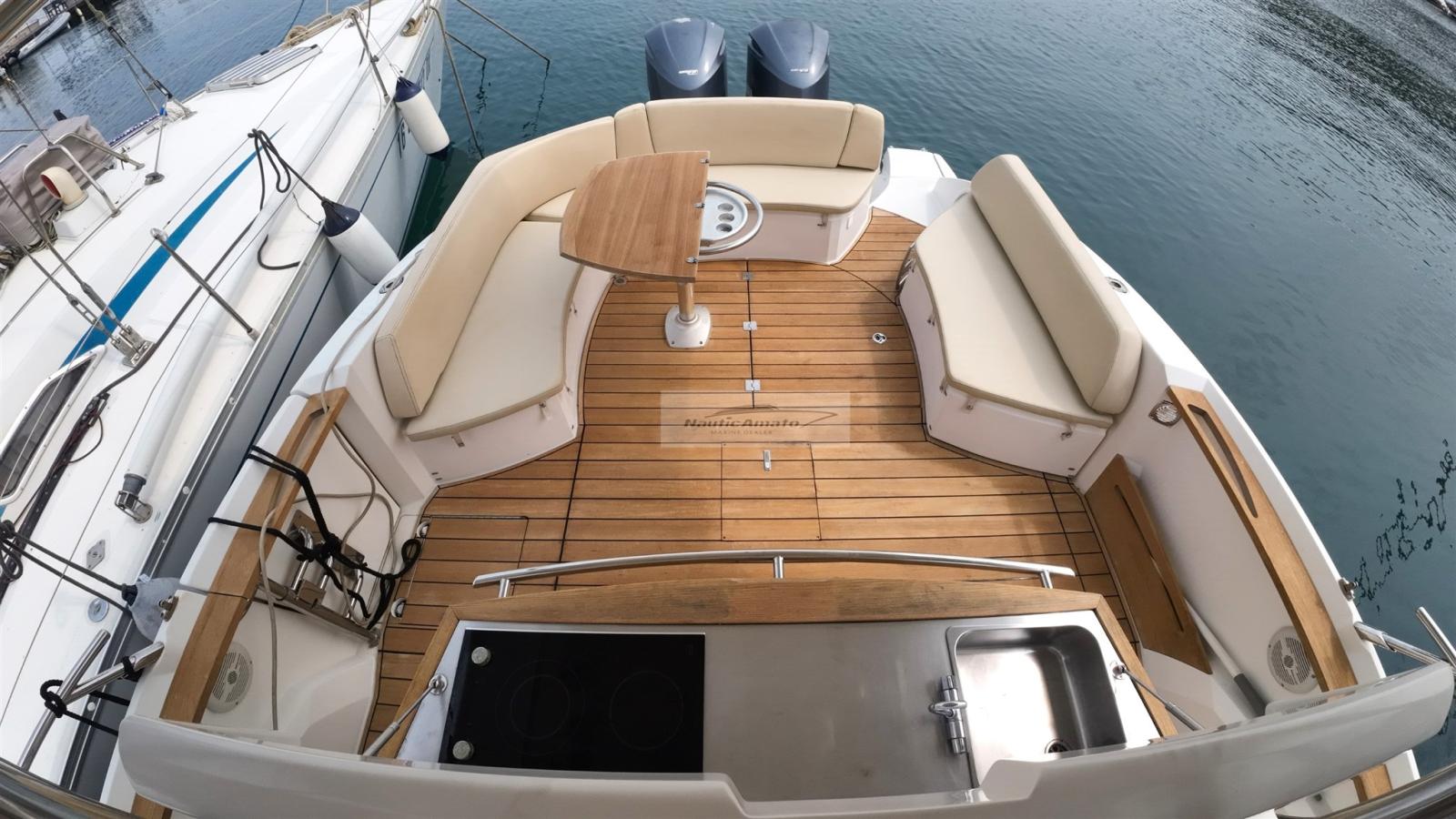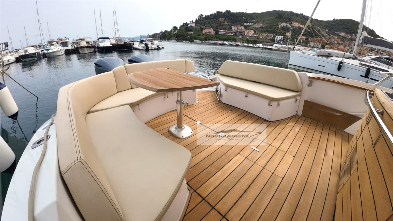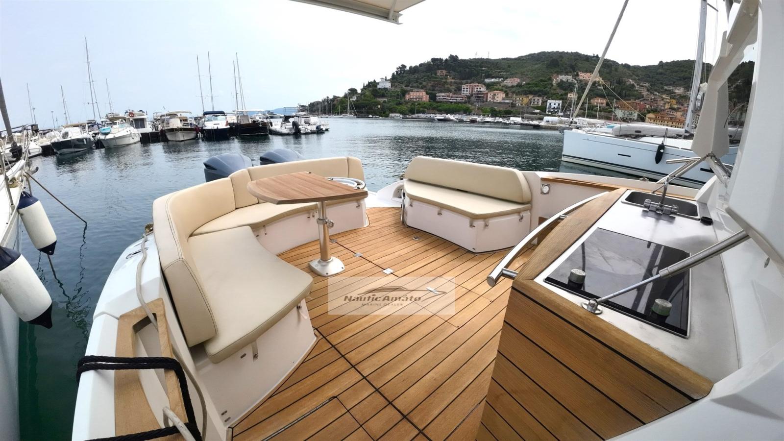Spazi esterni: Ampio ponte con aree prendisole, perfette per il relax o attività sociali. La zona di poppa è attrezzata con un tavolo da pranzo, ideale per cene all'aperto. L'apertura laterale è molto accattivante, utile sia per scendere lateralmente che per tuffarsi in mare; è dotata anche di una comoda scaletta, l'ampia cucina esterna completa le ottime doti di fruibilità dell'imbarcazione.