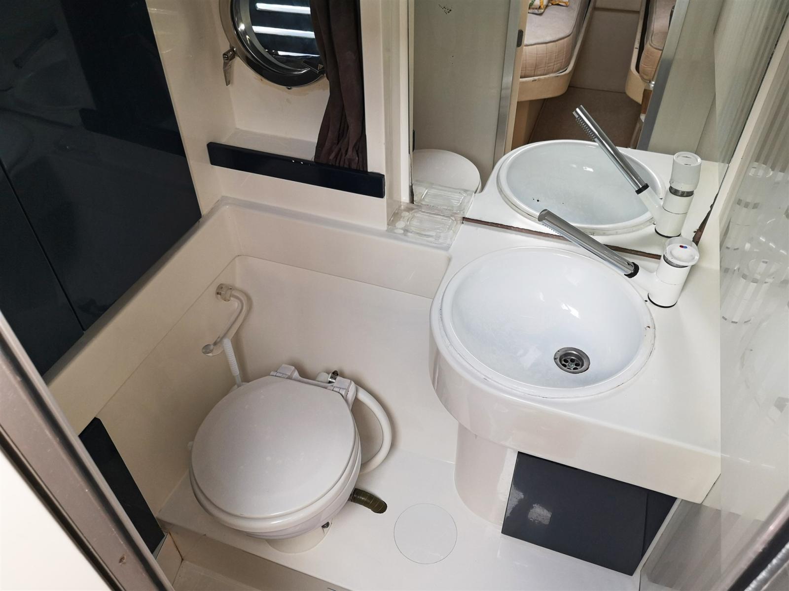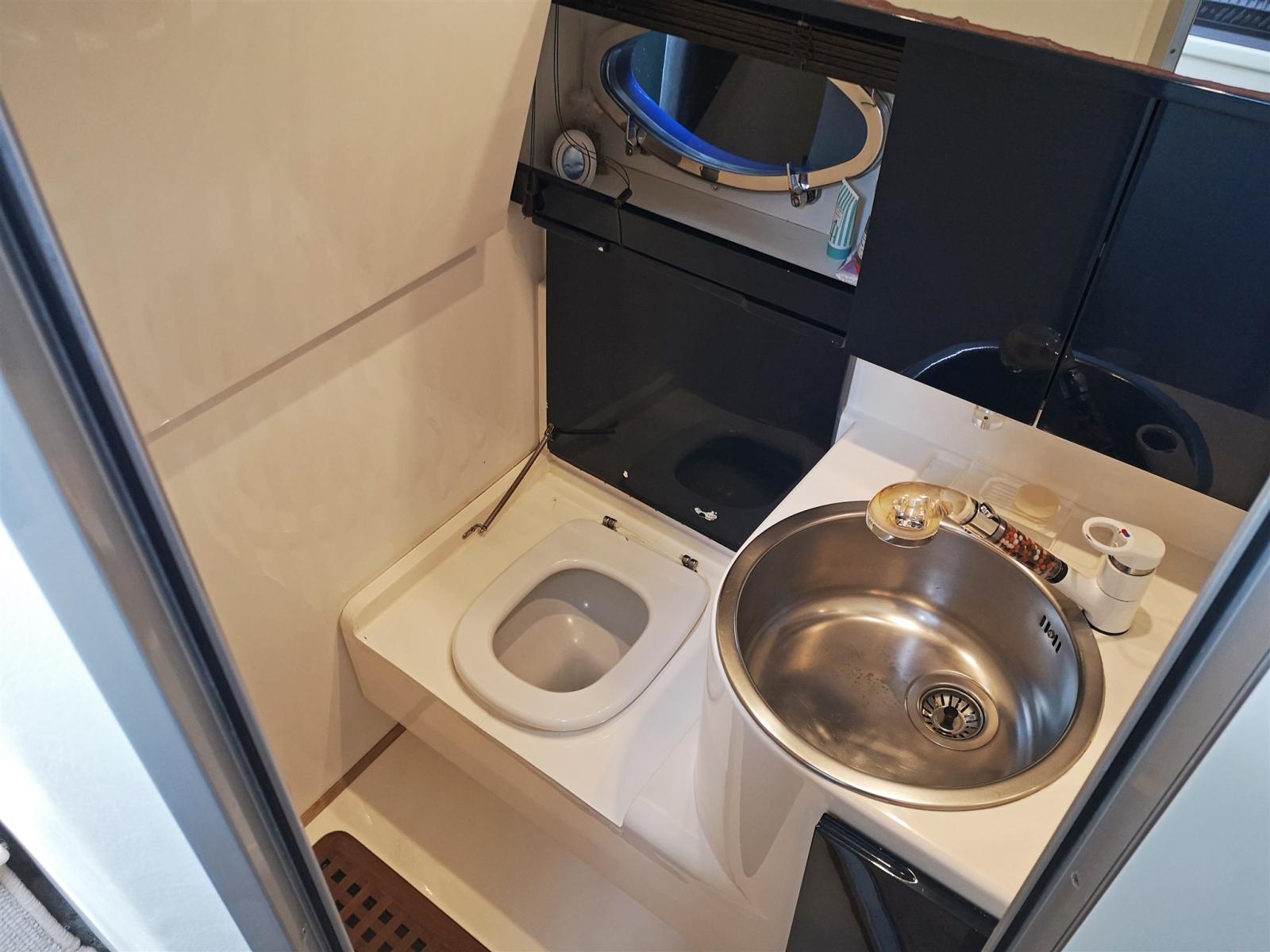 Cabina armatoriale a prua con letto matrimoniale a isola e bagno privato completo di lavabo e wc elettrico