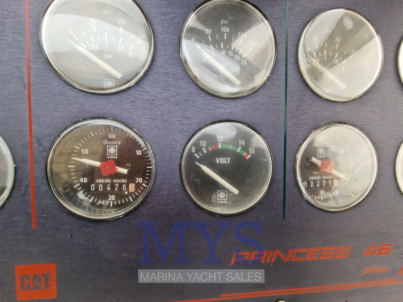 Princess 46' Riviera con due Caterpillar serie 3208TA da 425 Hp cad. con solo 426 ore di moto, negli anni è sempre stato matenuto in efficienza, nel 2019 sostituite prese a mare motori, servizi e bagni, revisione impianto elettrico intrerno ed esterno, montaggio impianto e serbatoio acque nere. Nel 2021 Revisione scambiatoria. acqua , olio, invertitori e intercooler - Revisione impianto elettrico motori e motorini avviamento - Sostituito interrutori plancia - Sostituito Radar - Sostituito Plotter/GPS - Revisione motori e tagliandi - Sostituzione licquidi refrigeranti.