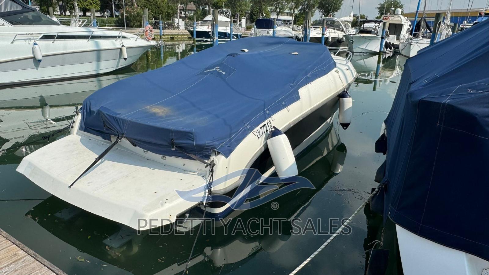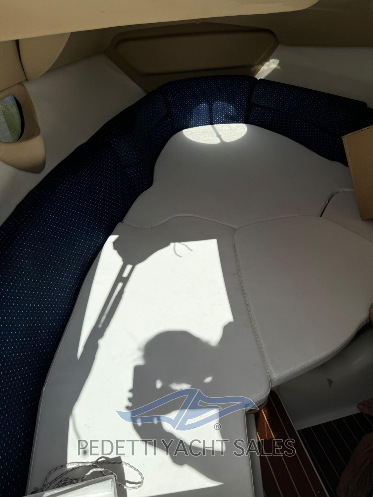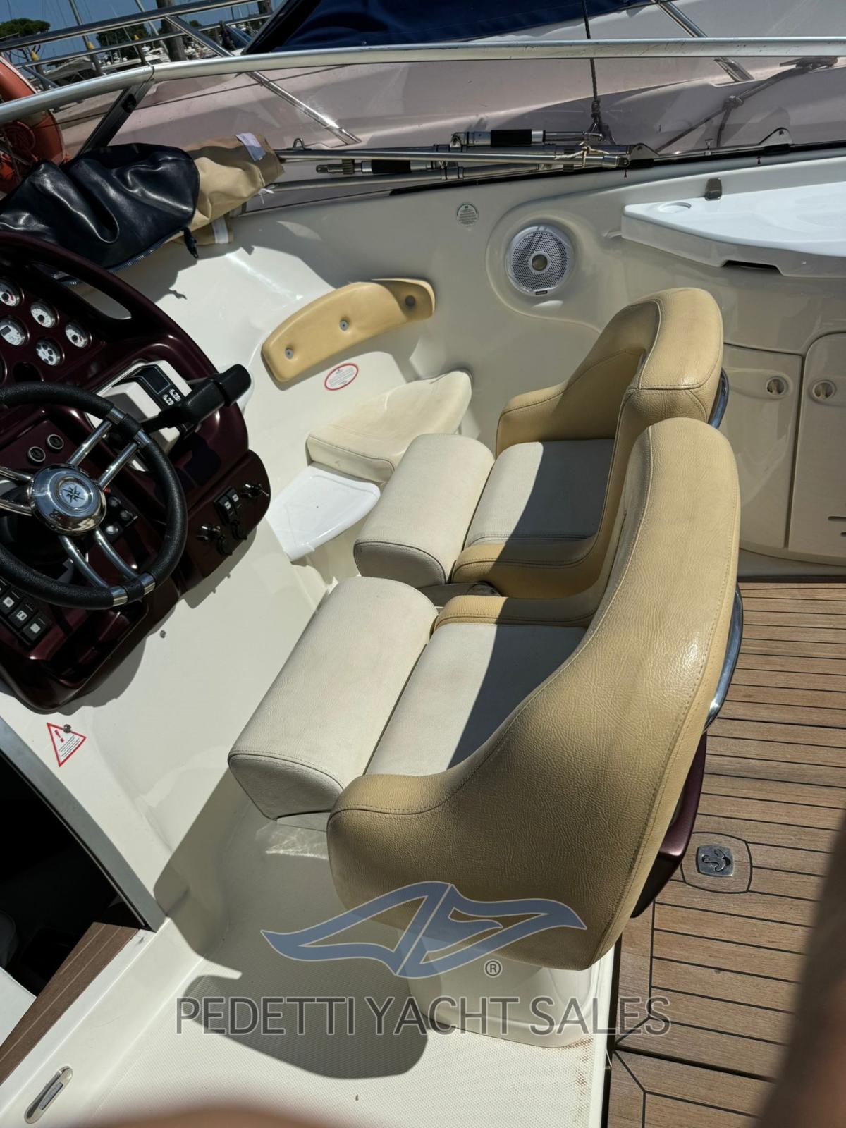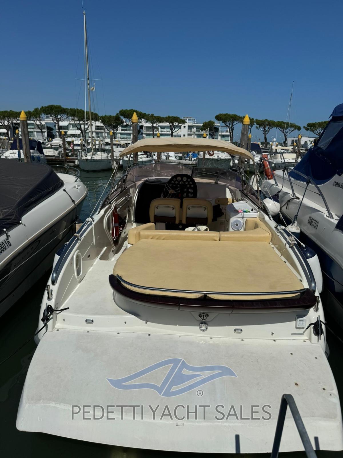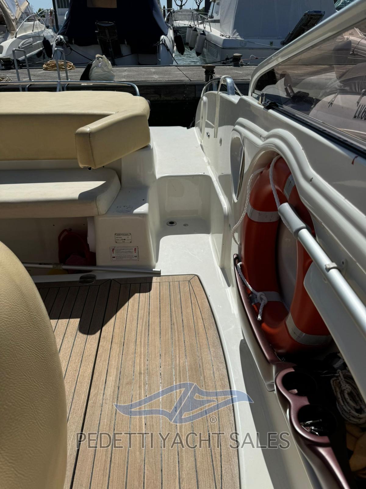 All'interno, la barca dispone di una cabina matrimoniale con due posti letto e un bagno elettrico, oltre a un pozzetto ampio e accogliente con cuscineria completa e zona prendisole sia a prua che a poppa. Tra le dotazioni si trovano plancetta di poppa con scaletta a scomparsa, tavolo pieghevole, impianto stereo, frigorifero esterno e lavello nel mobile bar, insieme a un sistema di navigazione completo con radio VHF, computer di bordo Volvo Penta e pilota automatico.