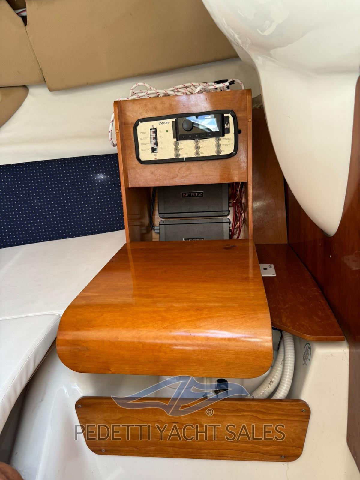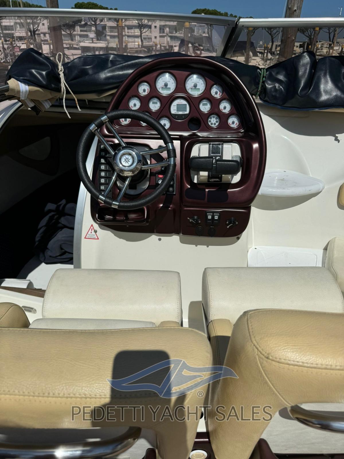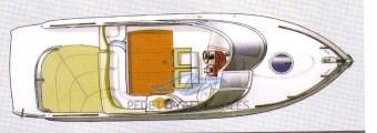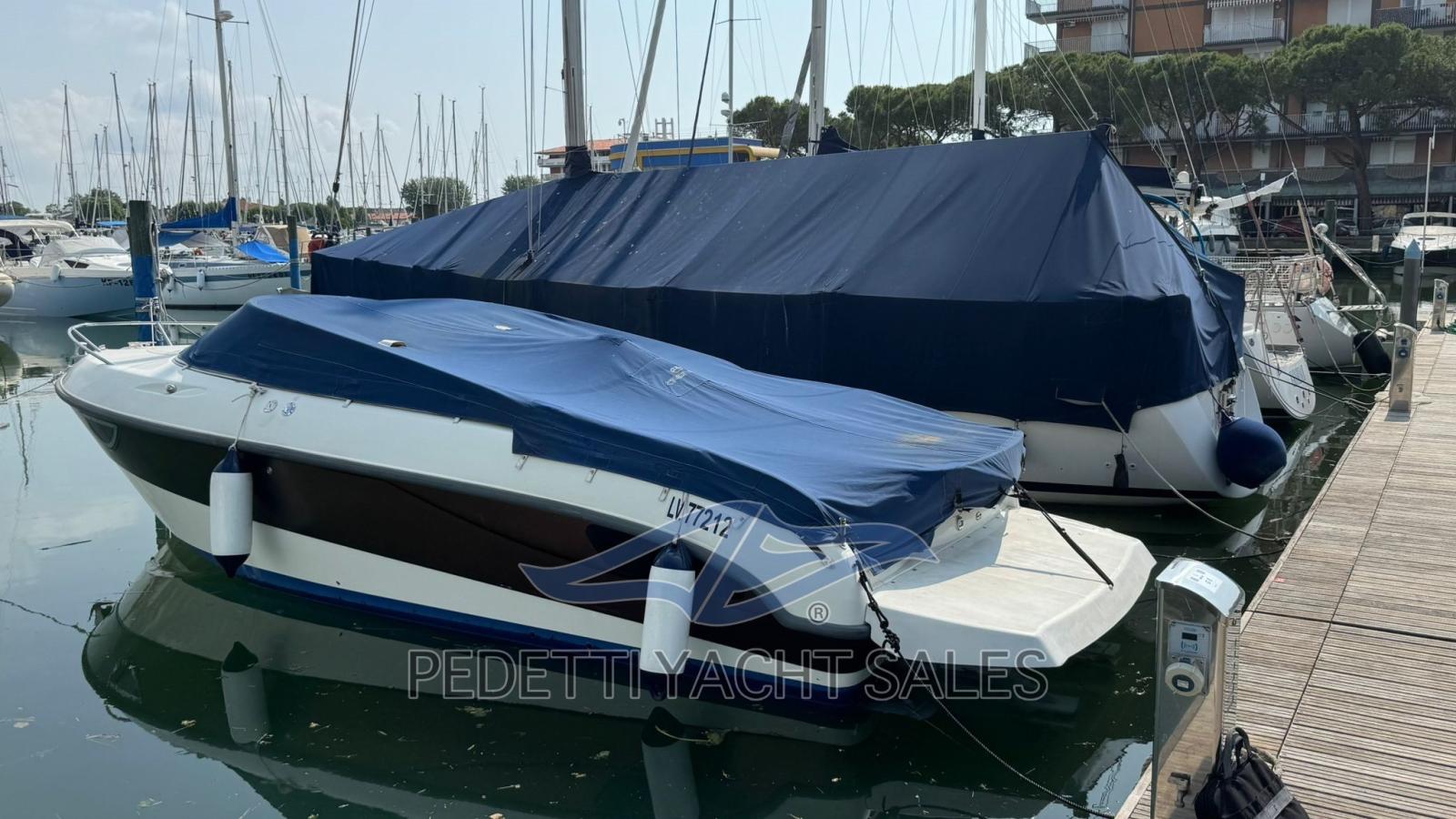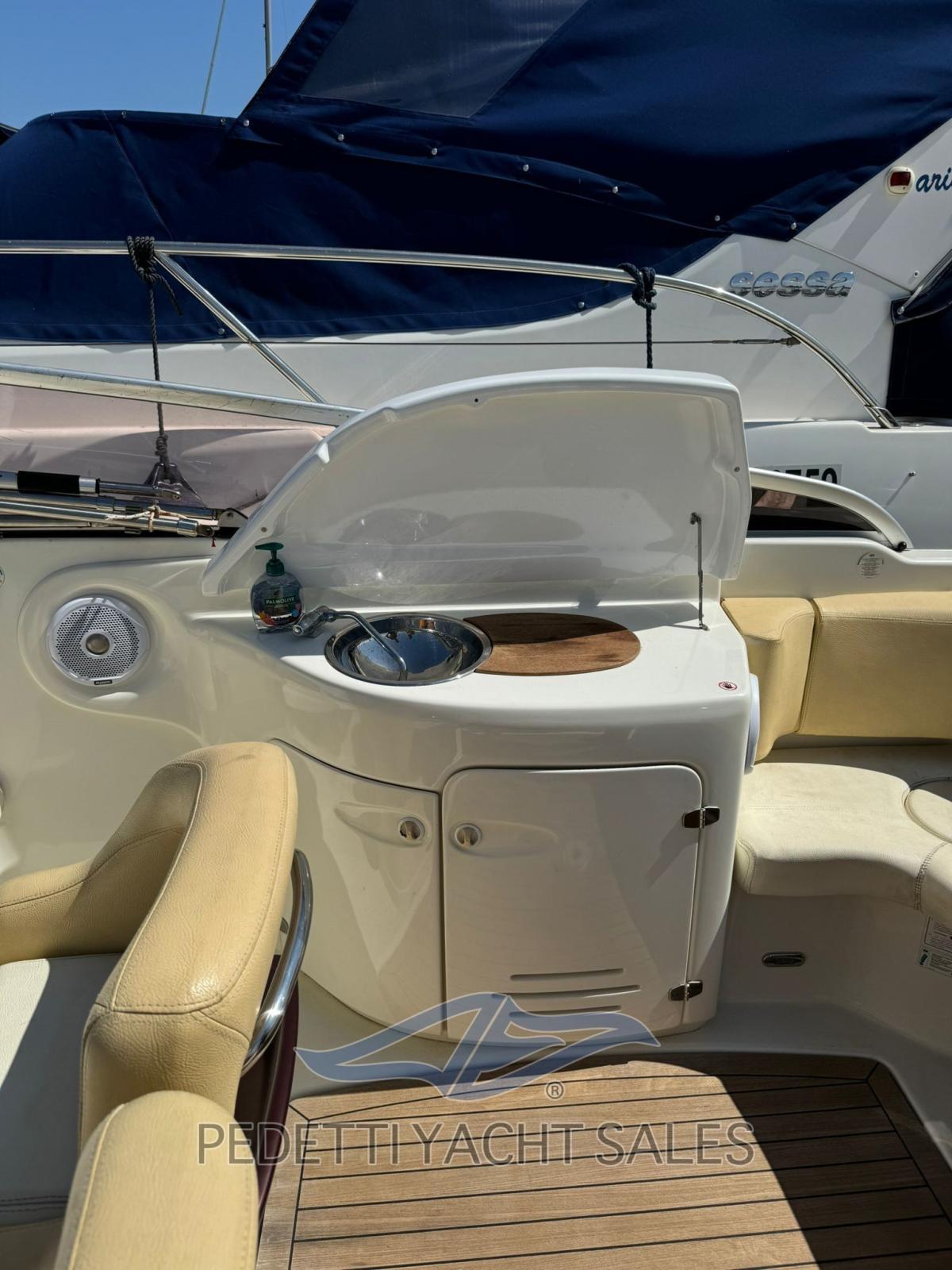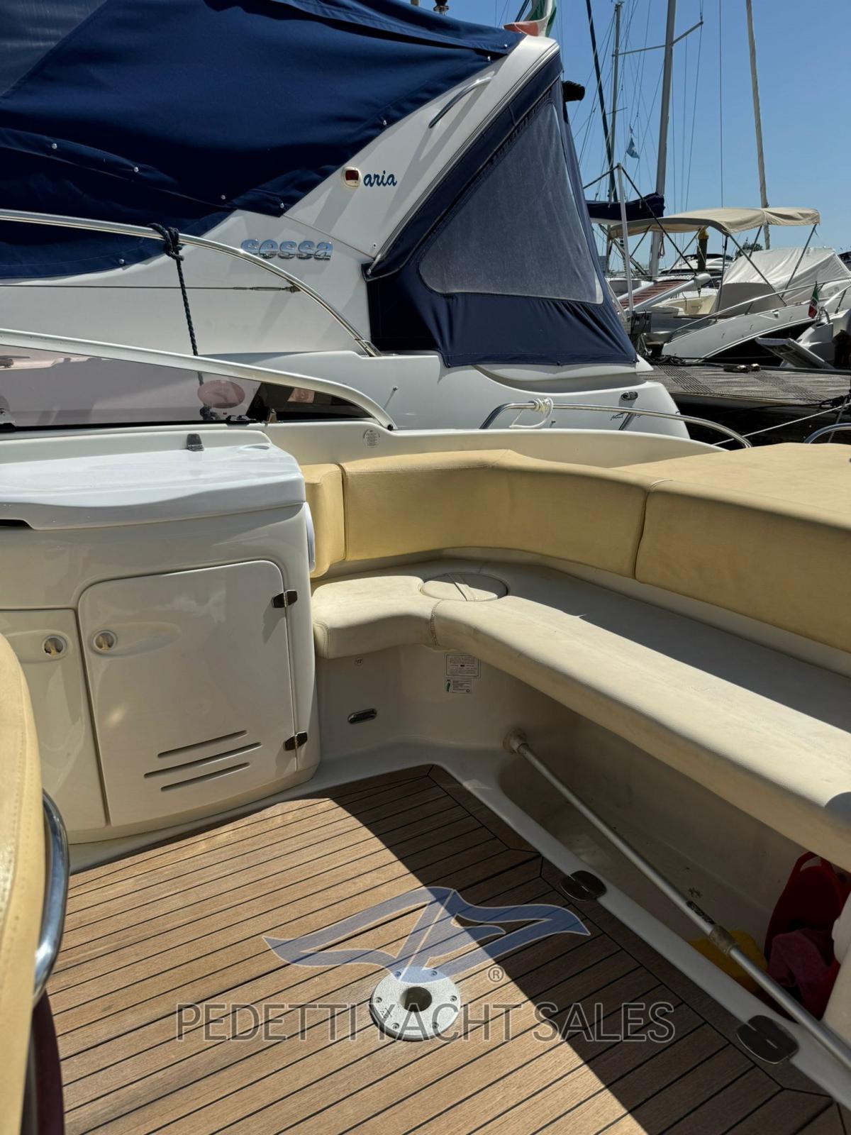 All'interno, la barca dispone di una cabina matrimoniale con due posti letto e un bagno elettrico, oltre a un pozzetto ampio e accogliente con cuscineria completa e zona prendisole sia a prua che a poppa. Tra le dotazioni si trovano plancetta di poppa con scaletta a scomparsa, tavolo pieghevole, impianto stereo, frigorifero esterno e lavello nel mobile bar, insieme a un sistema di navigazione completo con radio VHF, computer di bordo Volvo Penta e pilota automatico.