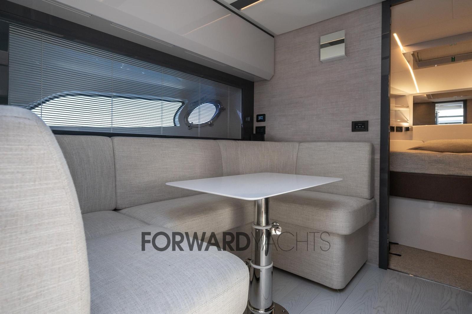 La versione proposta prevede una cabina VIP a prua e una dinette di fronte alla cucina.